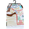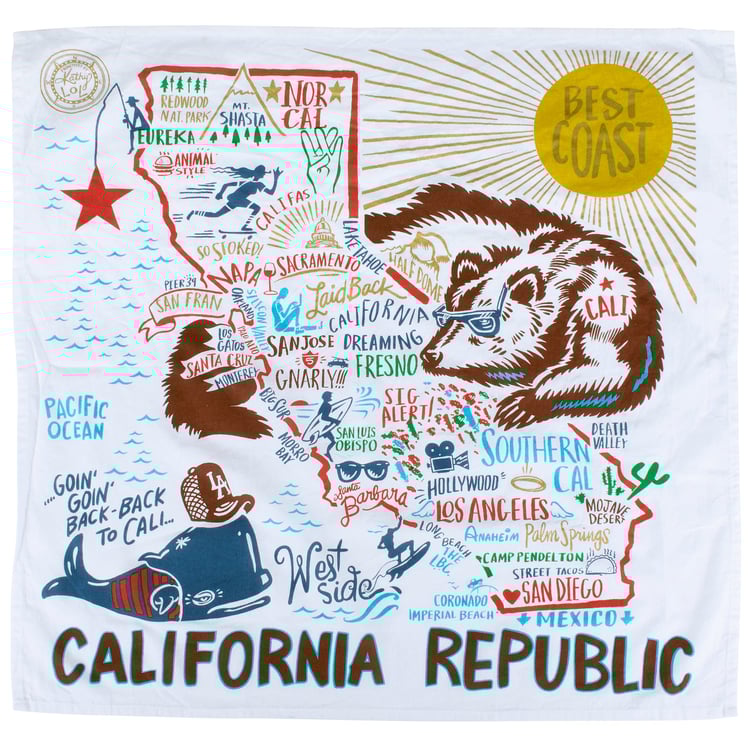 A fully-printed and vibrant California-themed cotton kitchen towel lending a state outline, flag-inspired background, and various illustrations and sentiments associated with the state throughout. Machine-washable.