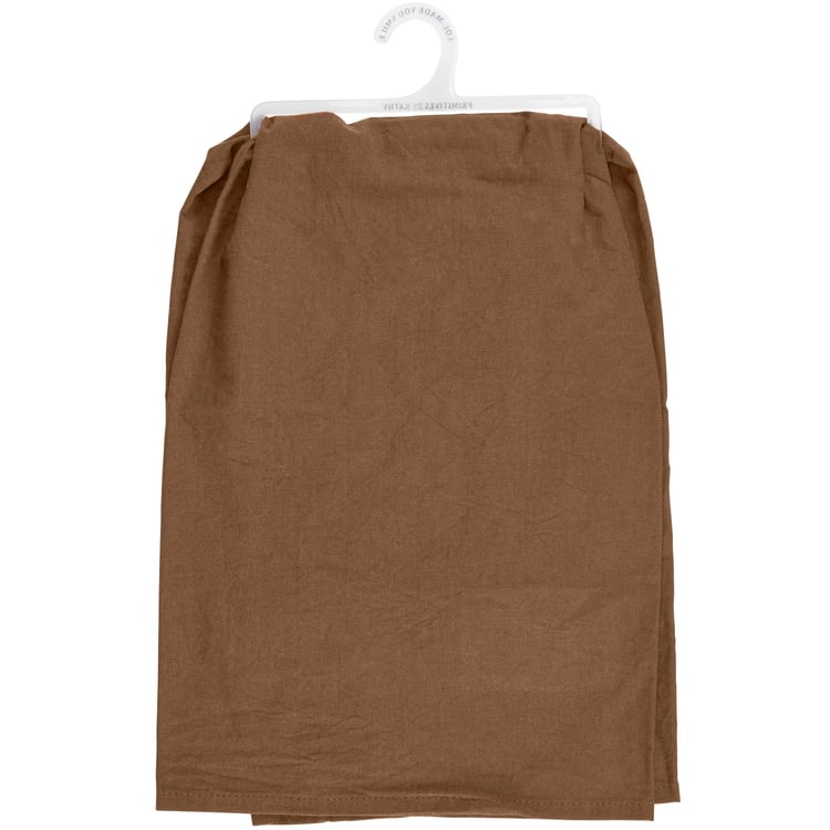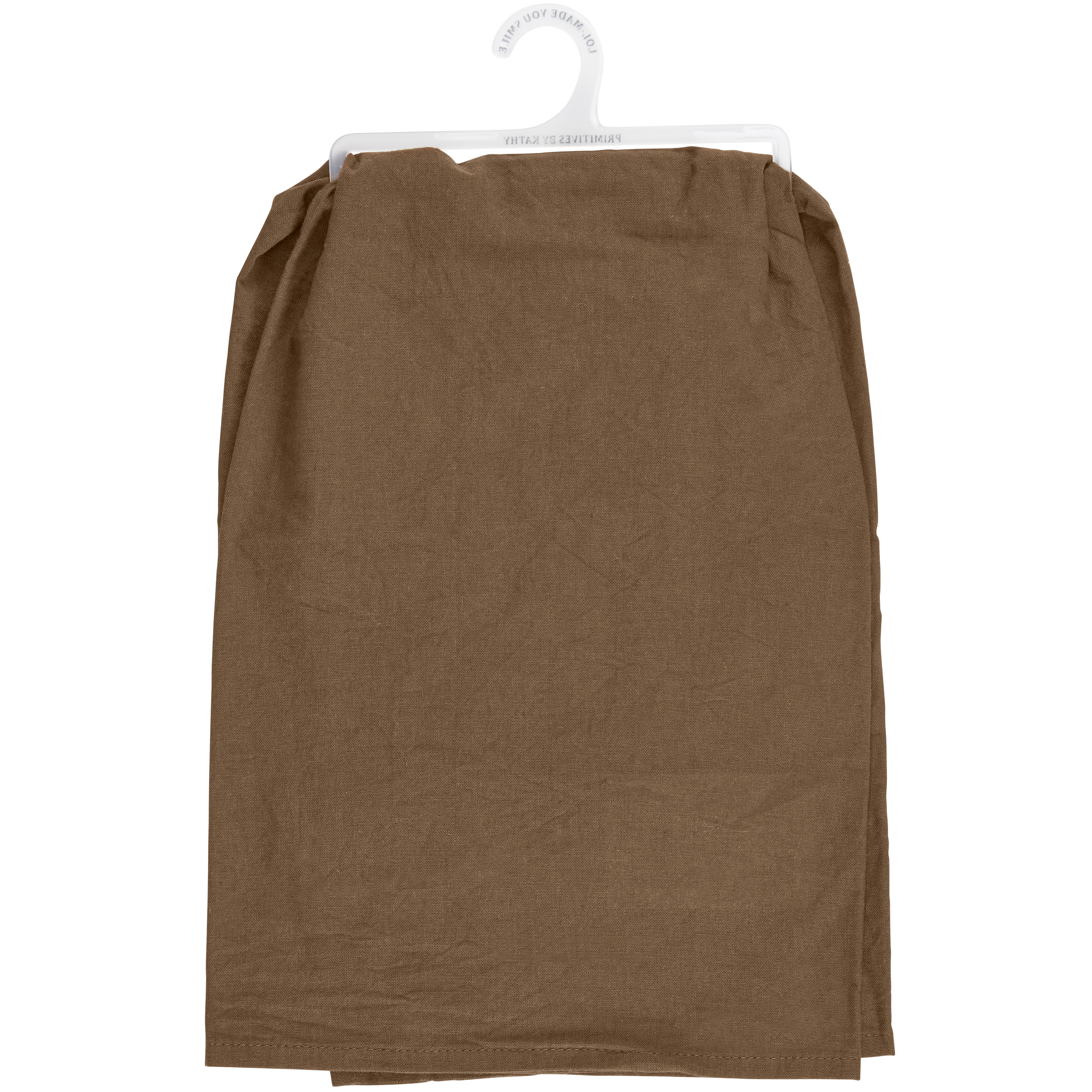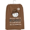 A brown cotton kitchen towel from our Lake & Cabin Collection displaying a unique hand illustrated design of a happy face in an outdoor hat above a humorous camping-themed sentiment that reads "You Don't Have To Be Crazy To Camp With Us... We Can Train You." Our Camp With Us kitchen towel is machine-washable for convenient cleaning. Packaged on a clear plastic hanger to easily display on rack. A fun camping-themed kitchen accessory perfect for everyday use.
