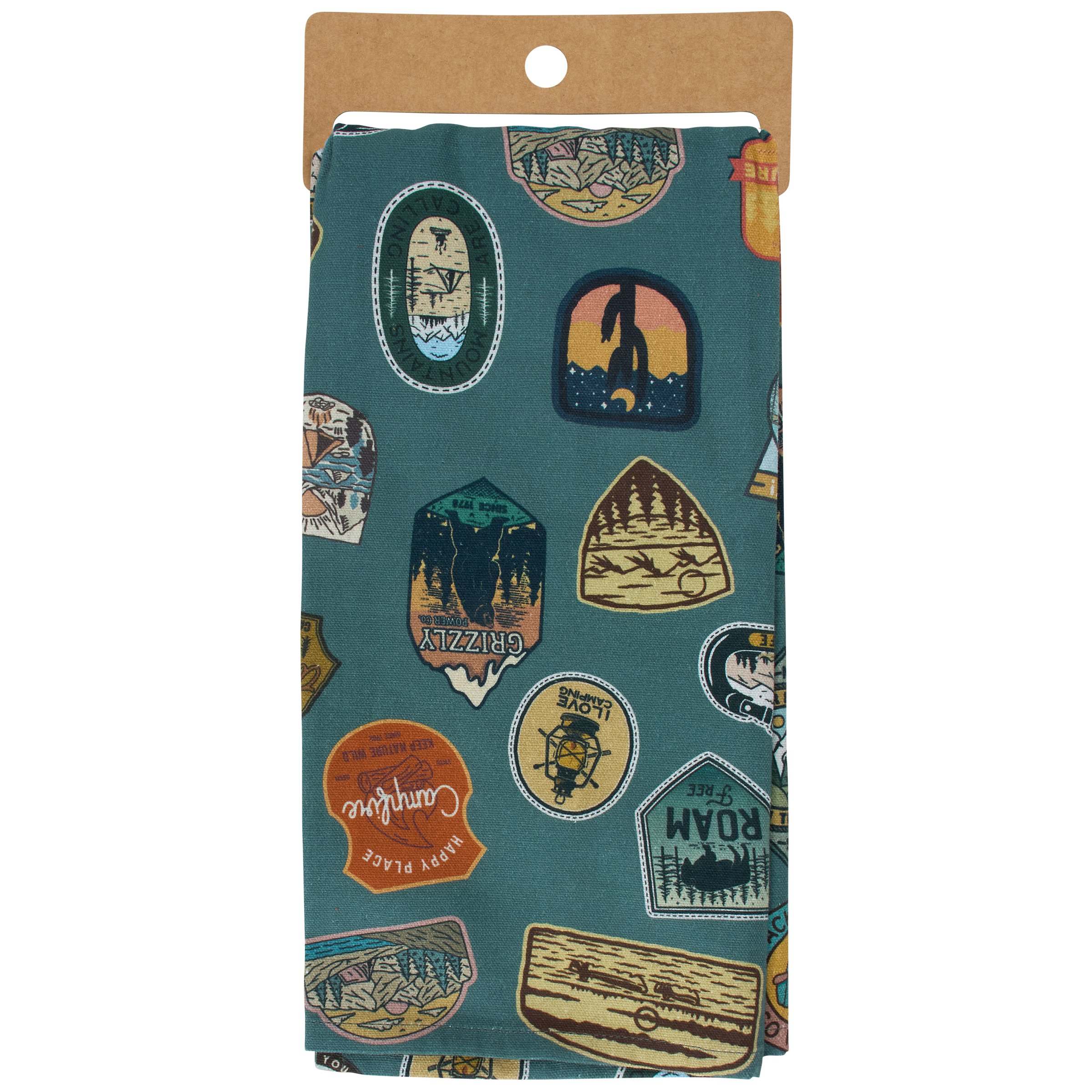 A green cotton kitchen towel from our Lake & Cabin Collection featuring an all-over design displaying a pattern of various camp patches that coordinates well with a vintage summer camp style. Our Camping Patches kitchen towel is conveniently machine-washable for easy cleaning. Camping kitchen towel is packaged on a cardboard hanger with hole to easily display on rack. A fun camping themed gift perfect for adding personality to any kitchen.