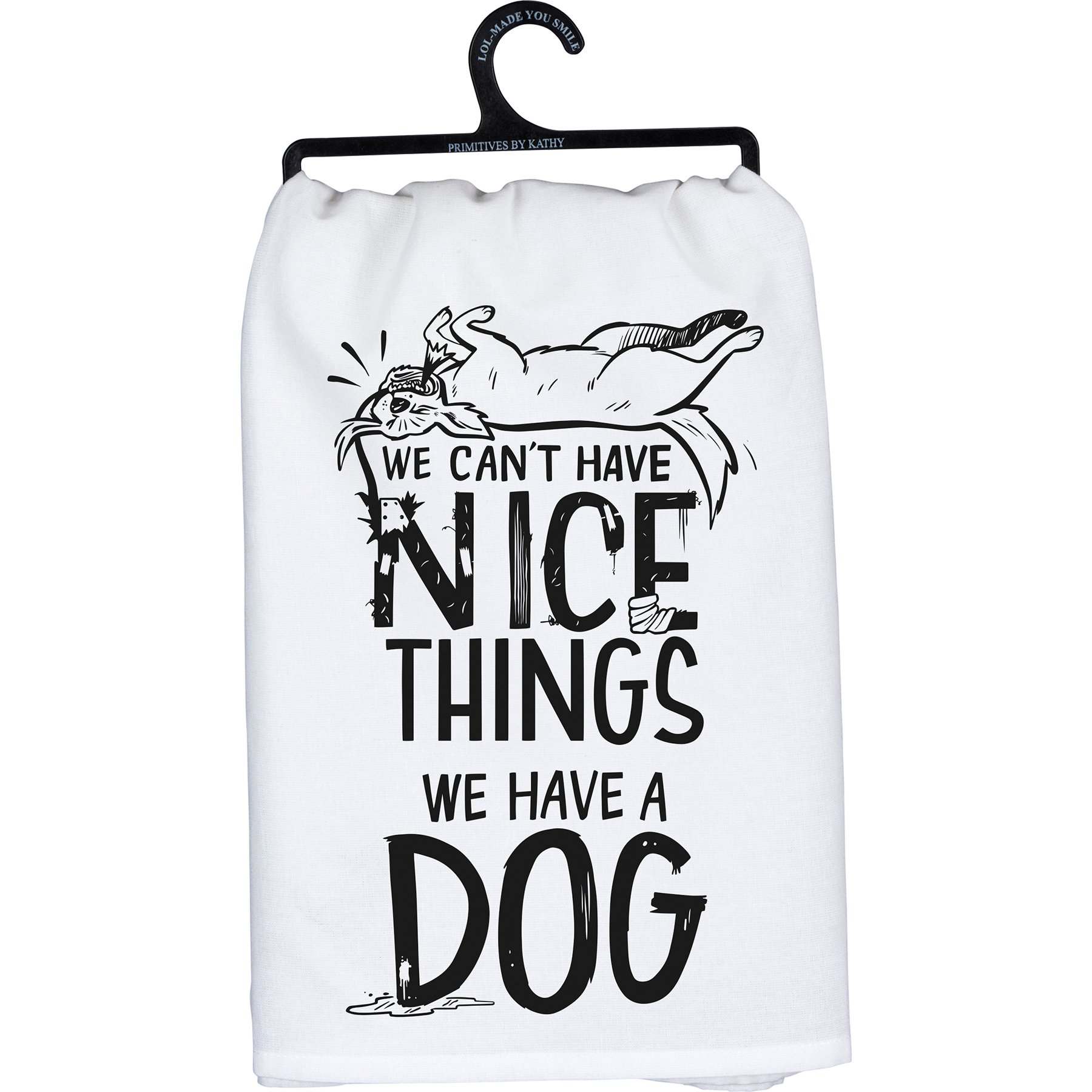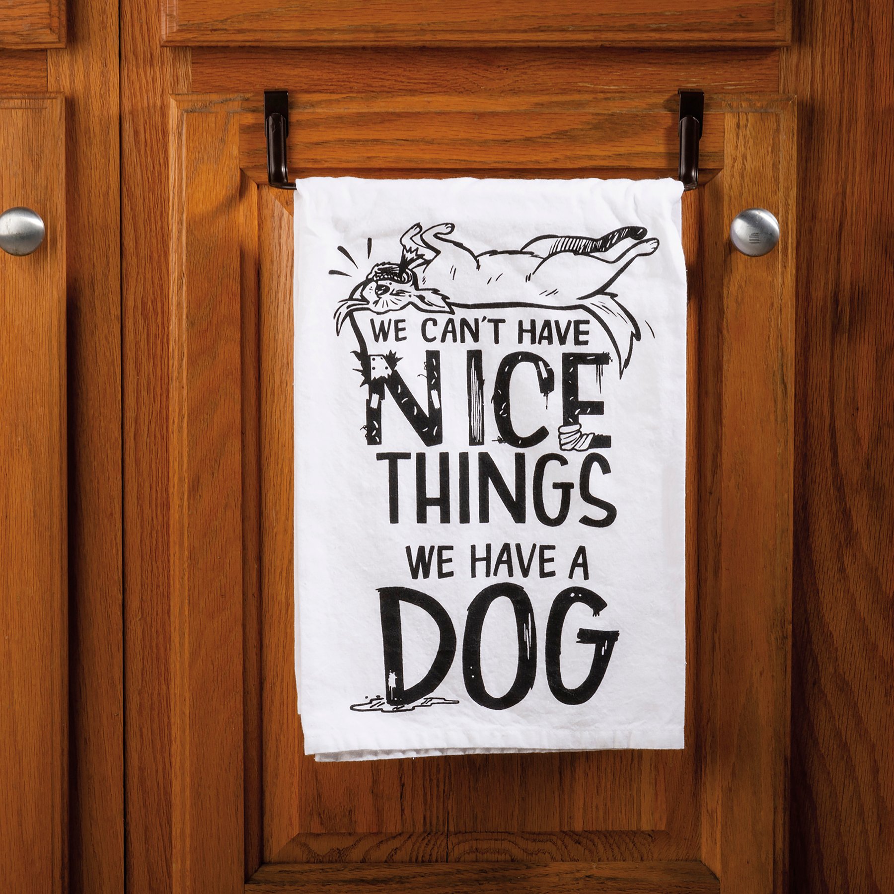 A black and white cotton kitchen towel featuring a hand lettered "We Can't Have Nice Things We Have A Dog" sentiment with coordinating illustrations. Machine-washable.