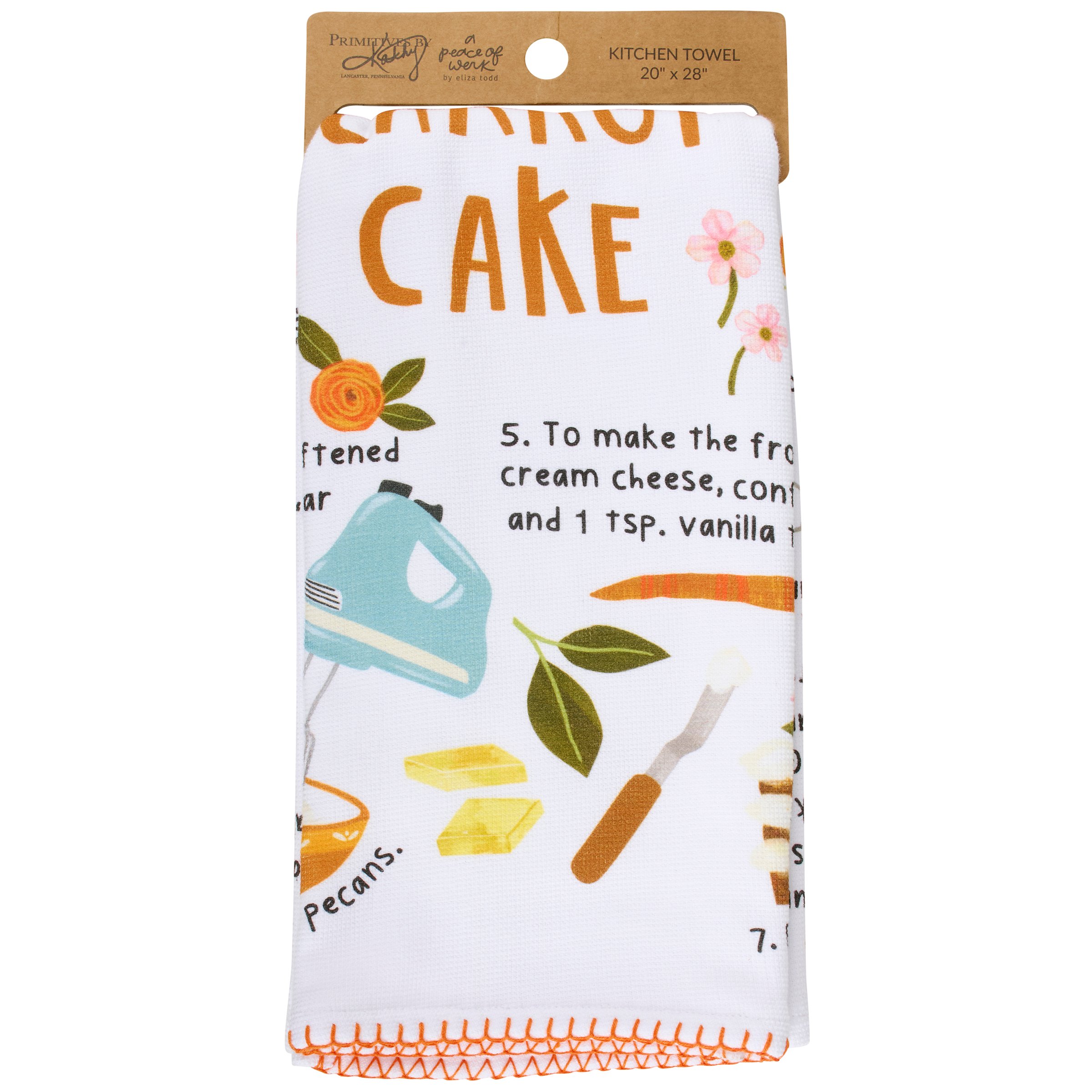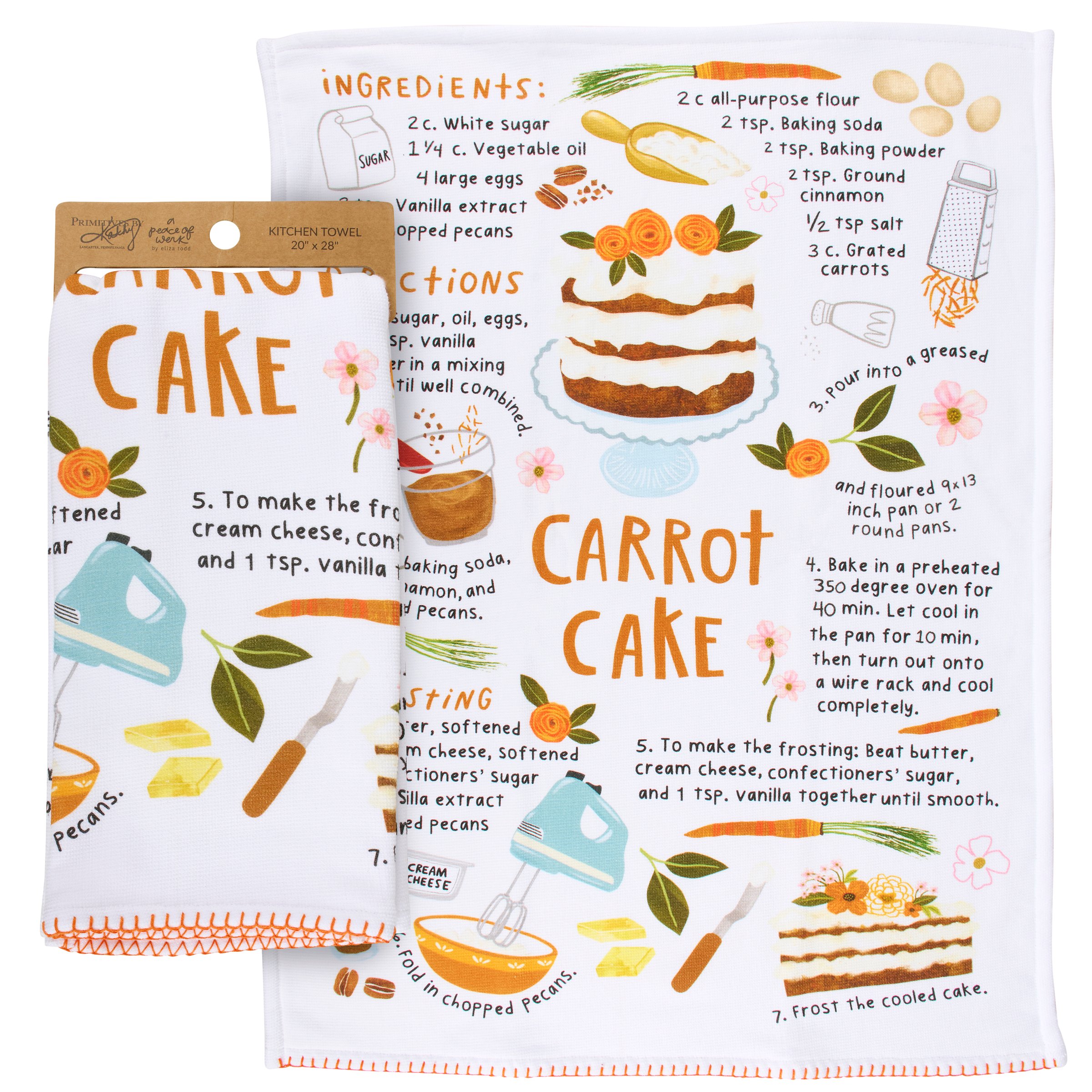 A cotton kitchen towel from our Fall & Harvest Collection featuring an all-over design displaying fun recipe inspired art replicated from original hand illustrated artwork. Homestead fall recipe design features instructions for making homemade carrot cake with coordinating illustrations. Carrot cake recipe is printed on textured slub fabric with a complementing orange hem stitch at the bottom. Fall recipe kitchen towel features a terrycloth layer on the back for added absorbency and corner loop for hanging. Our Carrot Cake Recipe kitchen towel is conveniently machine washable for easy cleaning. Seasonal kitchen towel is packaged on a cardboard hanger with hole to easily display on rack. A fun fall recipe themed gift perfect for a seasonal kitchen accessory.