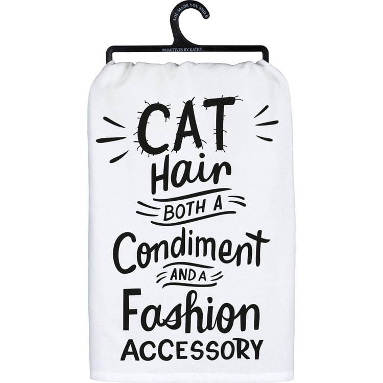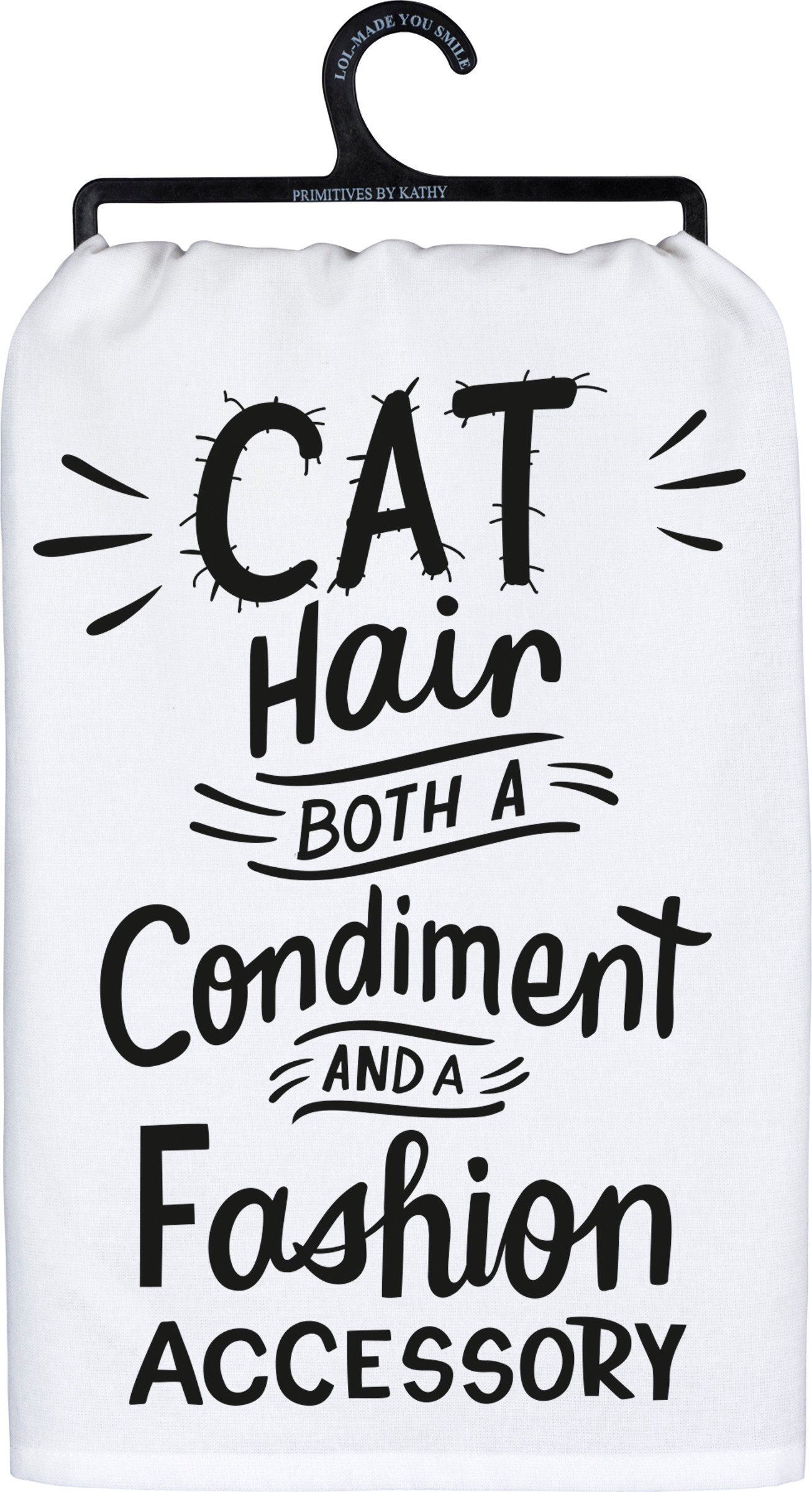 A black and white cotton kitchen towel featuring a humorous "Cat Hair Both A Condiment And A Fashion Accessory" sentiment. Machine-washable.