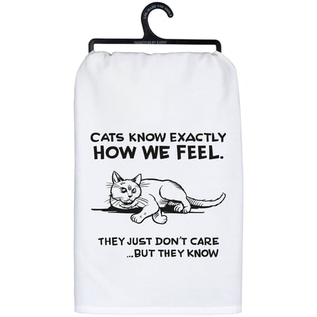 A black and white cotton kitchen towel from our Pet Collection displaying a fun hand illustrated design of a sassy cat with a humorous cat-themed sentiment that reads "Cats Know Exactly How We Feel. They Just Don't Care... But They Know." Our Cats Know How We Feel kitchen towel is conveniently machine-washable for easy cleaning. Funny kitchen towel is packaged on a black plastic hanger to easily display on rack. A fun pet-themed gift perfect for an everyday kitchen accessory.