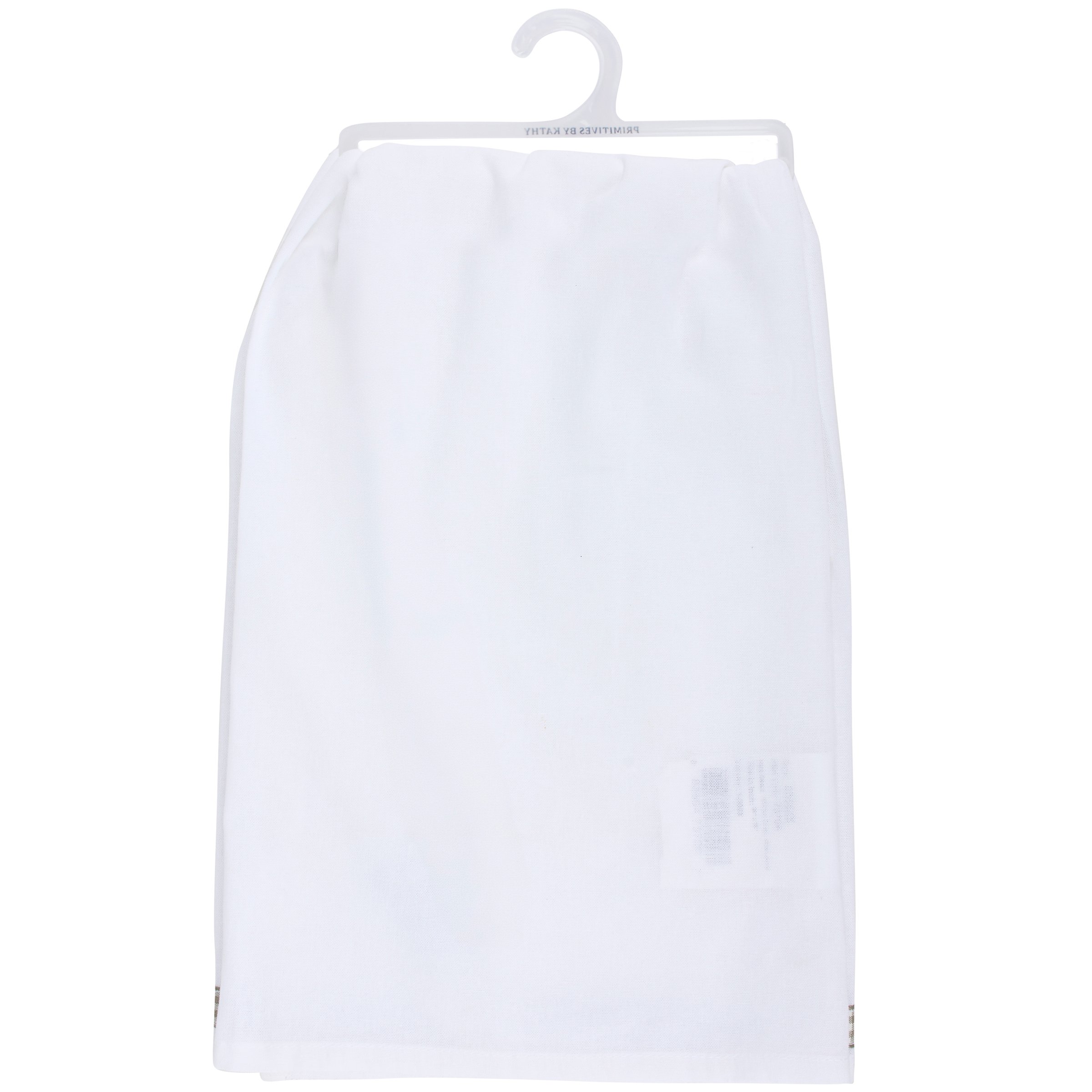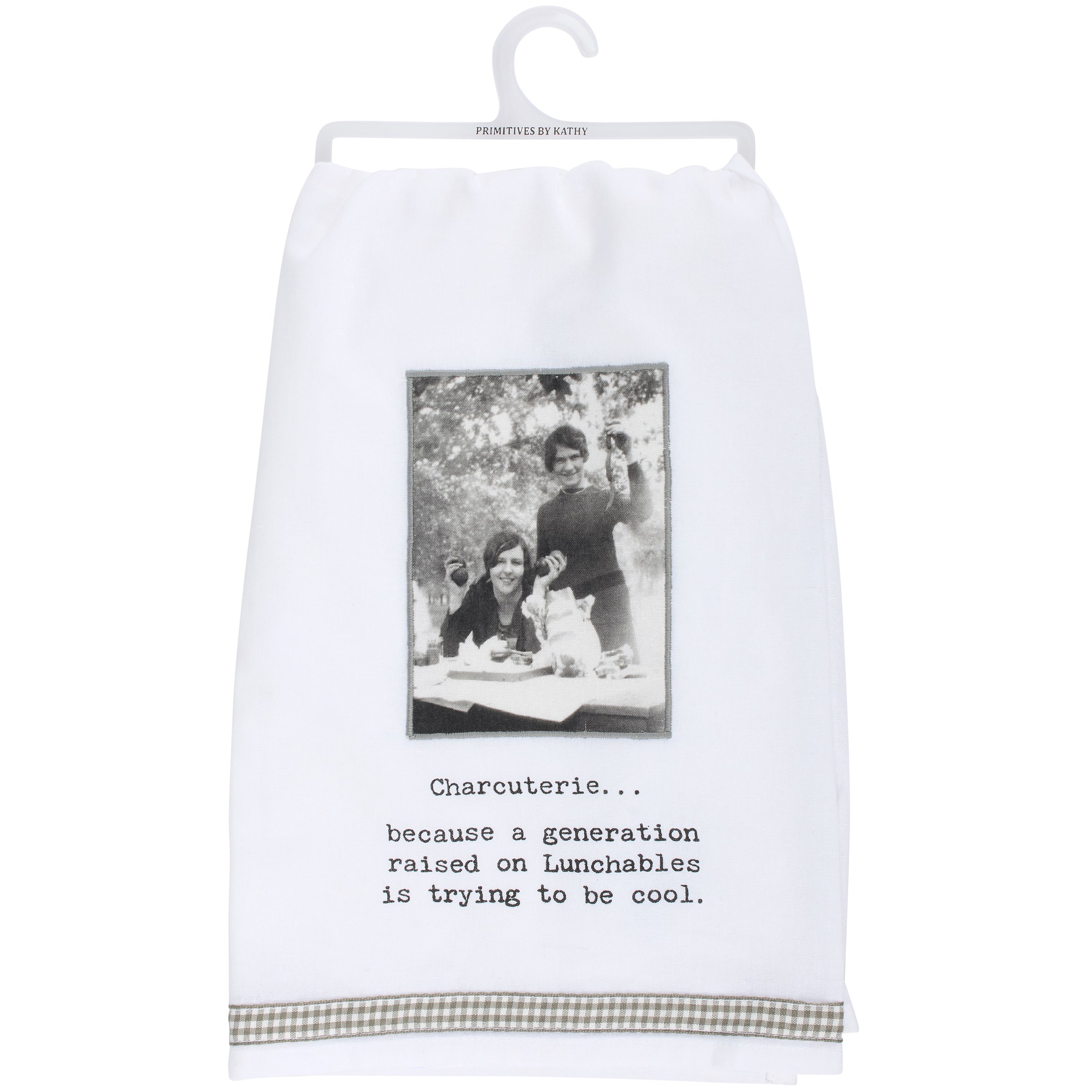 A white cotton kitchen towel from our Trash Talk By Annie Collection displaying a vintage black and white photograph on a stitched art panel complemented with a sassy food themed sentiment that reads "Charcuterie... Because A Generation Raised On Lunchables Is Trying To Be Cool." This funny kitchen towel also features a grey gingham ribbon along the bottom. Our Charcuterie Because Lunchables kitchen towel is conveniently machine-washable for easy cleaning. Vintage kitchen towel is packaged on a clear plastic hanger to easily display on rack. A fun kitchen accessory great for everyday gifting.