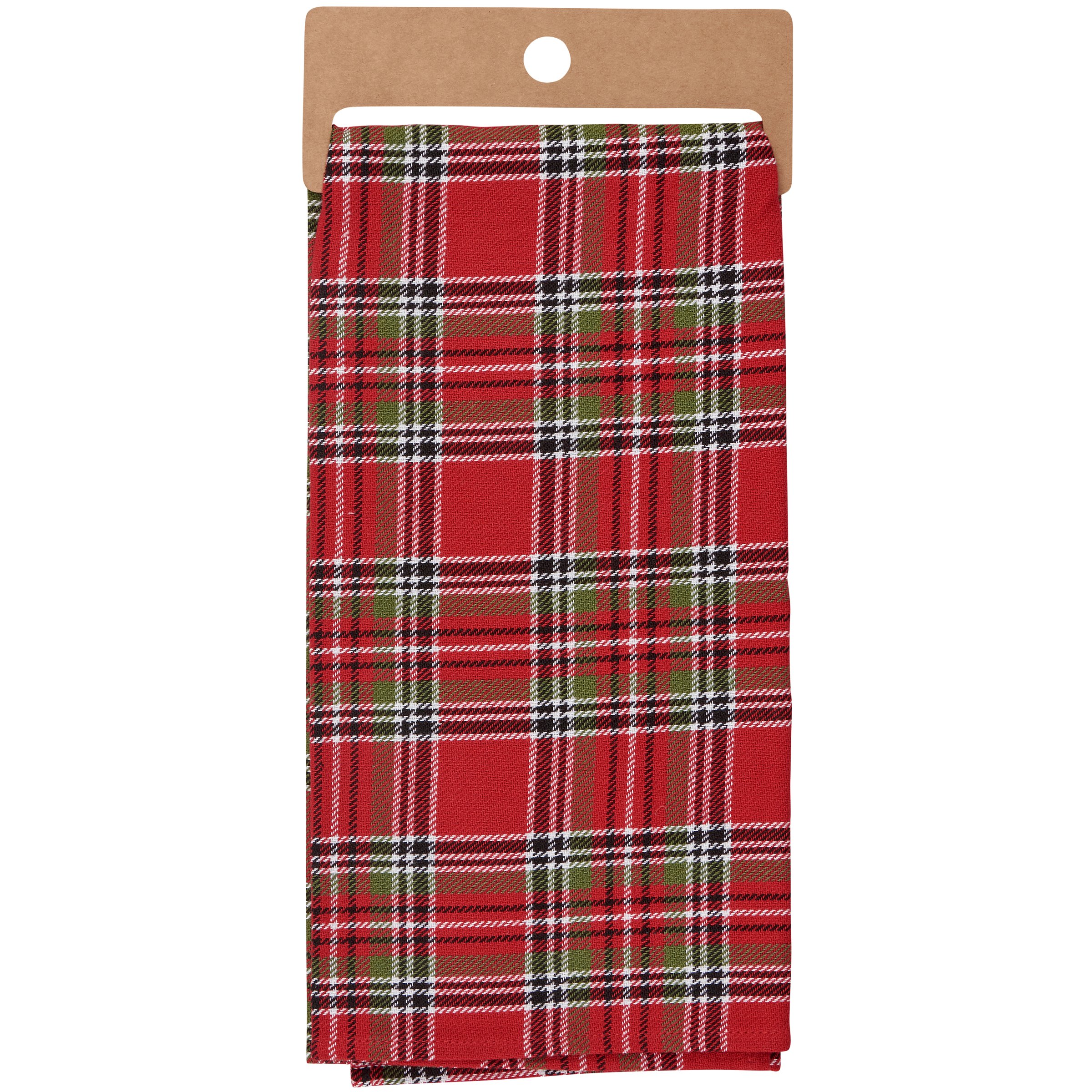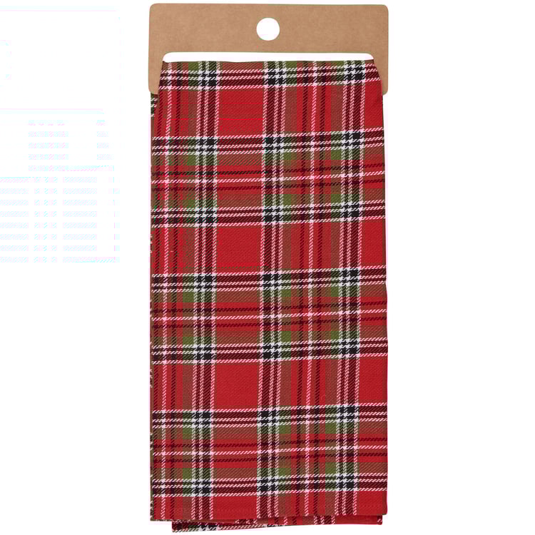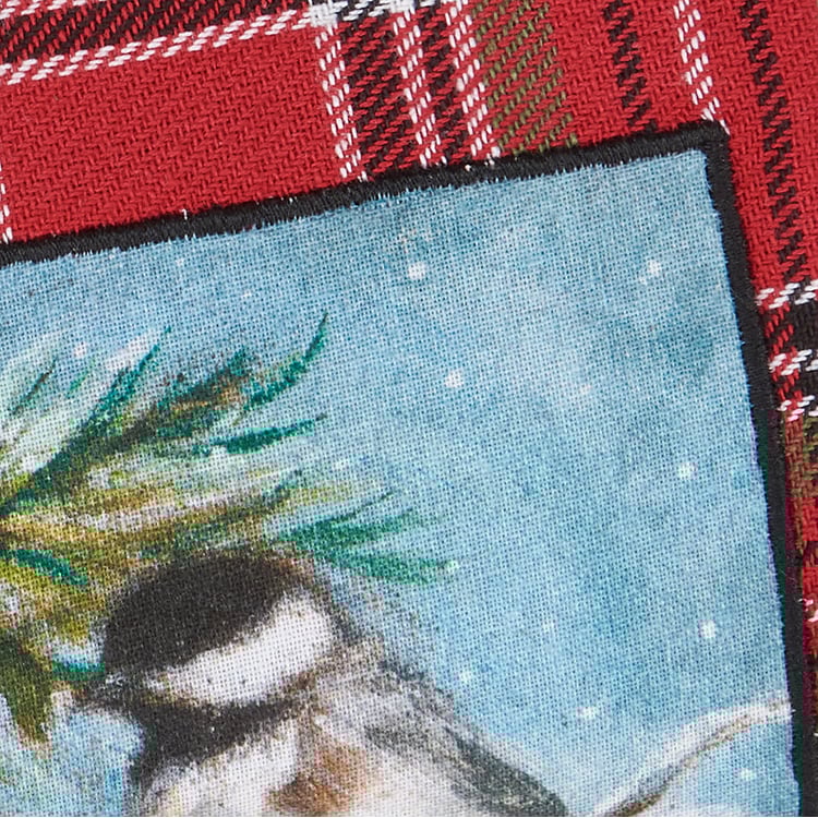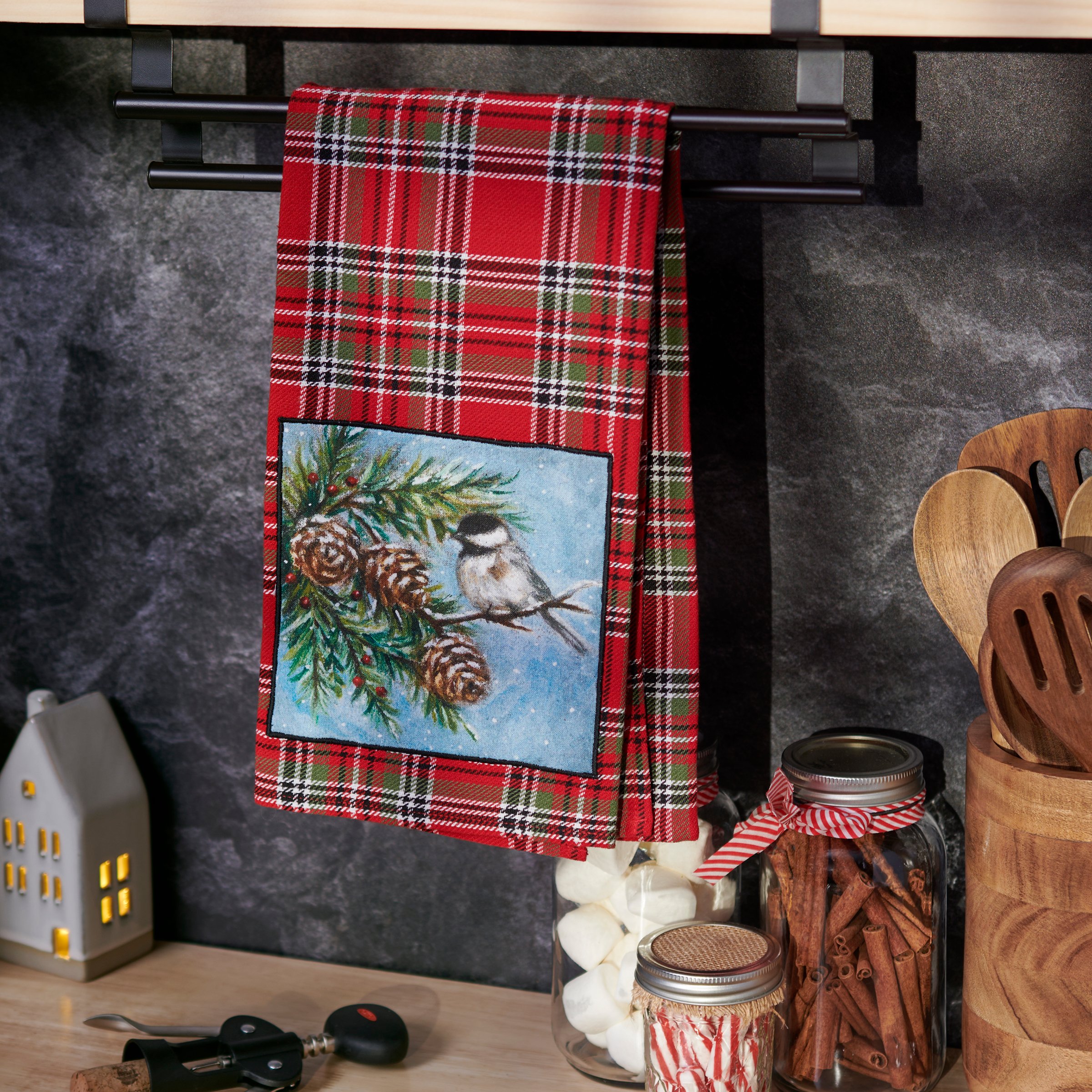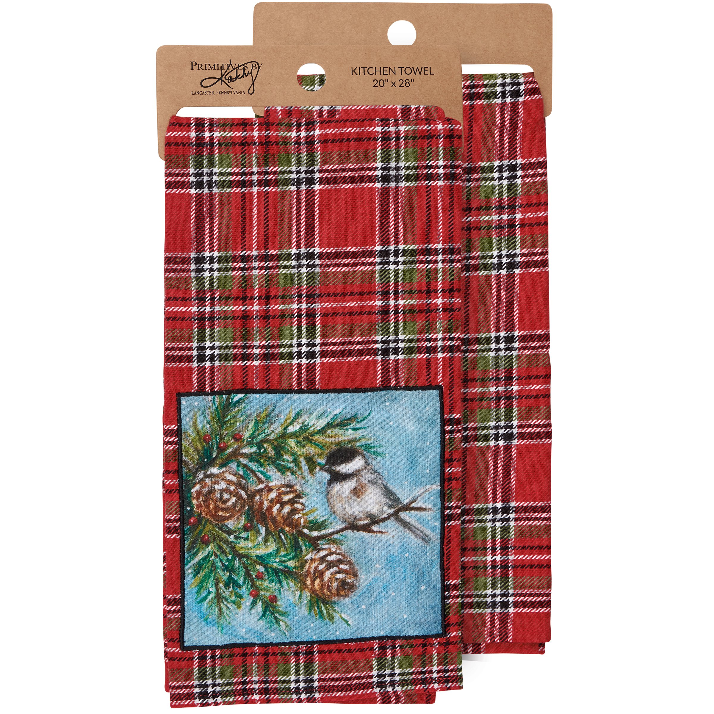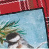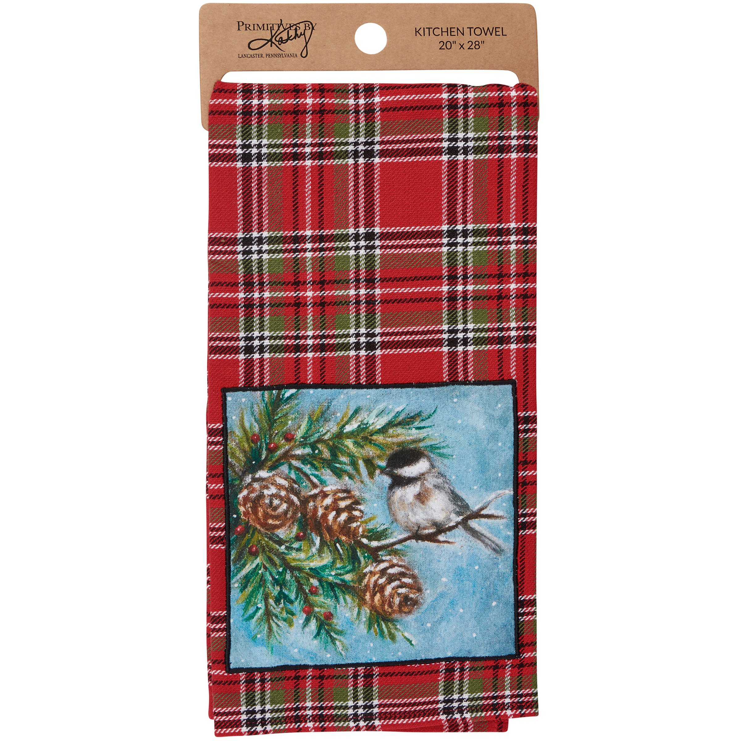 A cotton kitchen towel from our Christmas Collection featuring a stitched art panel with Christmas tartan plaid pattern all-over towel. Art panel displays a chickadee in a winter scene. Design is replicated from original artwork painted onto burlap canvas, giving the art a unique depth and texture. Our Chickadee kitchen towel is conveniently machine-washable for easy cleaning. Seasonal kitchen towel is packaged on a cardboard hanger with hole to easily hang on rack. A rustic winter-themed kitchen accessory perfect for seasonal use.