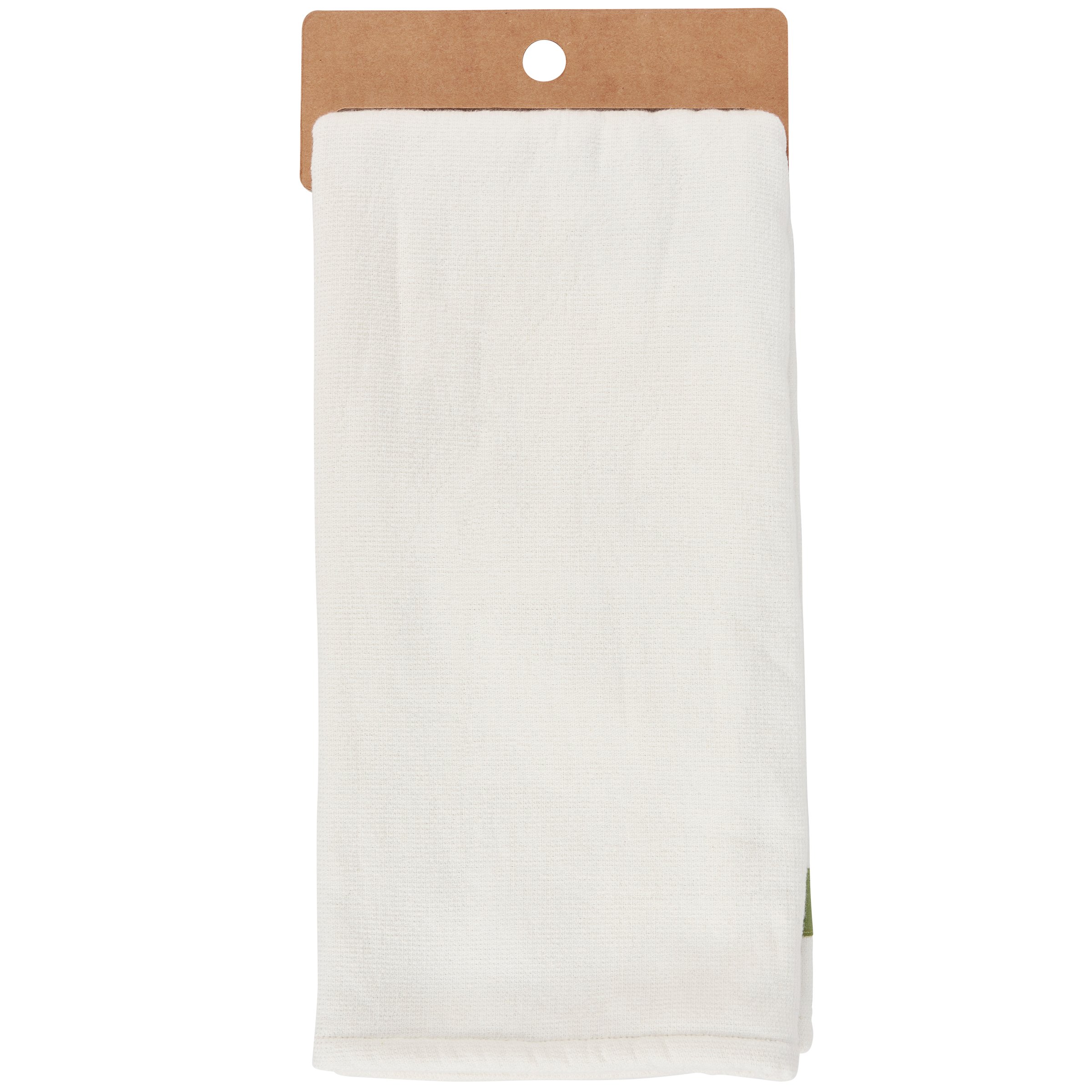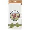 A cotton kitchen towel from our Farmhouse Collection featuring a farm animal inspired design with a stitched art panel and green ribbon accent. Art panel displays a charming scene of chickens in a field replicated from original artwork painted onto burlap canvas, giving the art a unique depth and texture. Chicken kitchen towel features a terrycloth layer on the back for added absorbency. Our Chickens kitchen towel is conveniently machine-washable for easy cleaning. Farm kitchen towel is packaged on a cardboard hanger with hole to easily display on rack. A rustic farm-themed kitchen accessory perfect for everyday use.