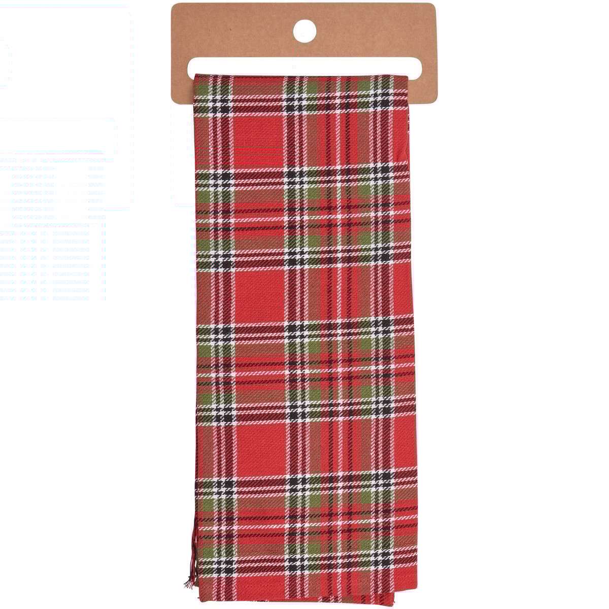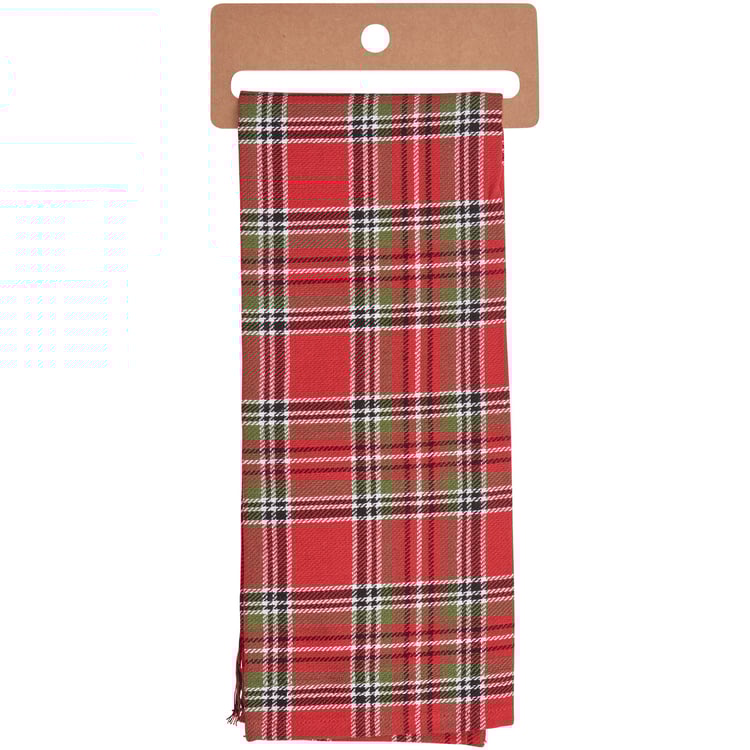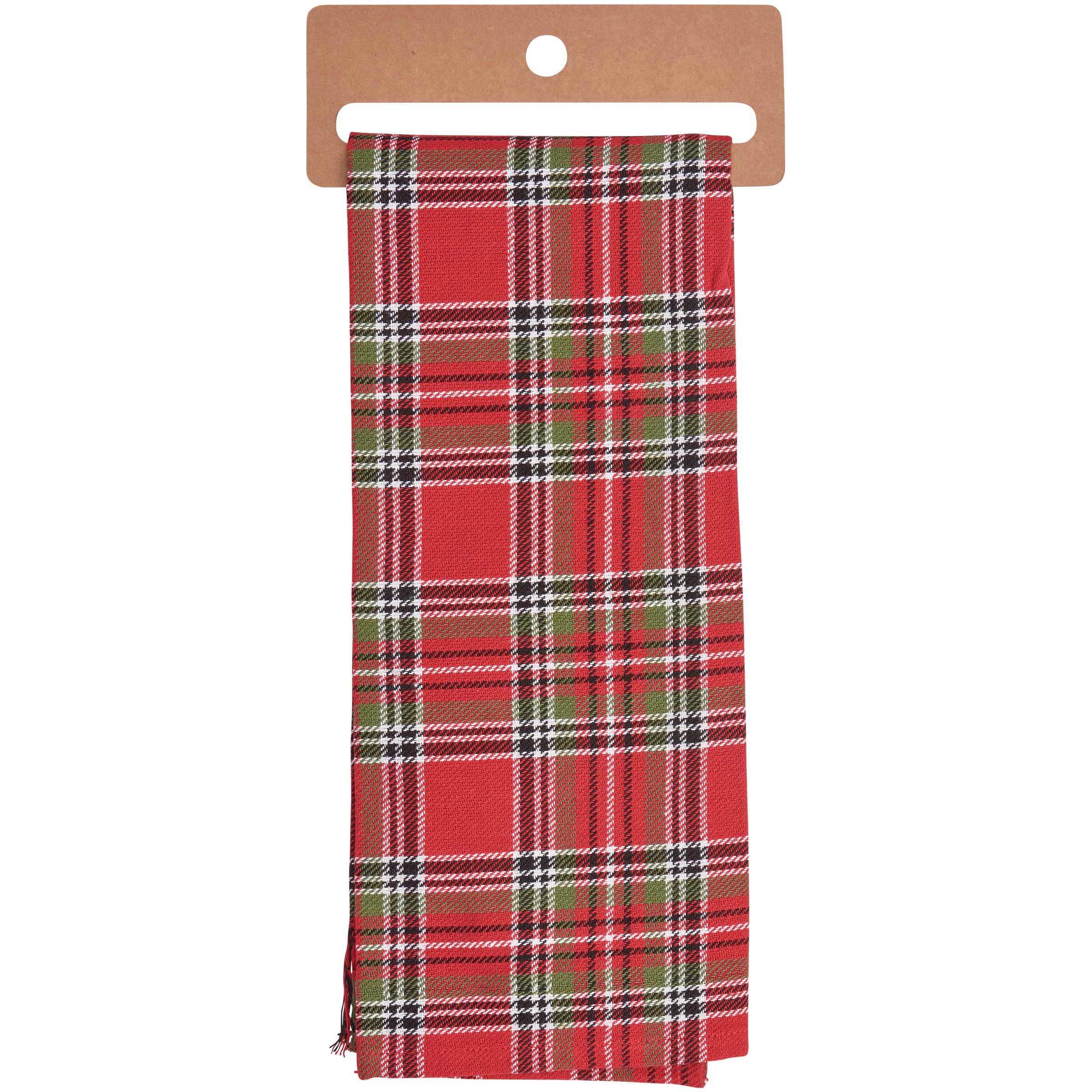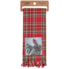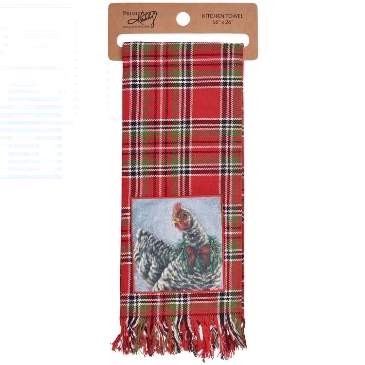 A cotton kitchen towel from our Christmas Collection featuring a stitched art panel with Christmas tartan plaid pattern all-over towel and frayed details on front trim. Art panel displays a chicken wearing a Christmas wreath in a winter scene. Design is replicated from original artwork painted onto burlap canvas, giving the art a unique depth and texture. Our Christmas Chicken kitchen towel is conveniently machine-washable for easy cleaning. Seasonal kitchen towel is packaged on a cardboard hanger with hole to easily hang on rack. A rustic Christmas-themed kitchen accessory perfect for seasonal use.