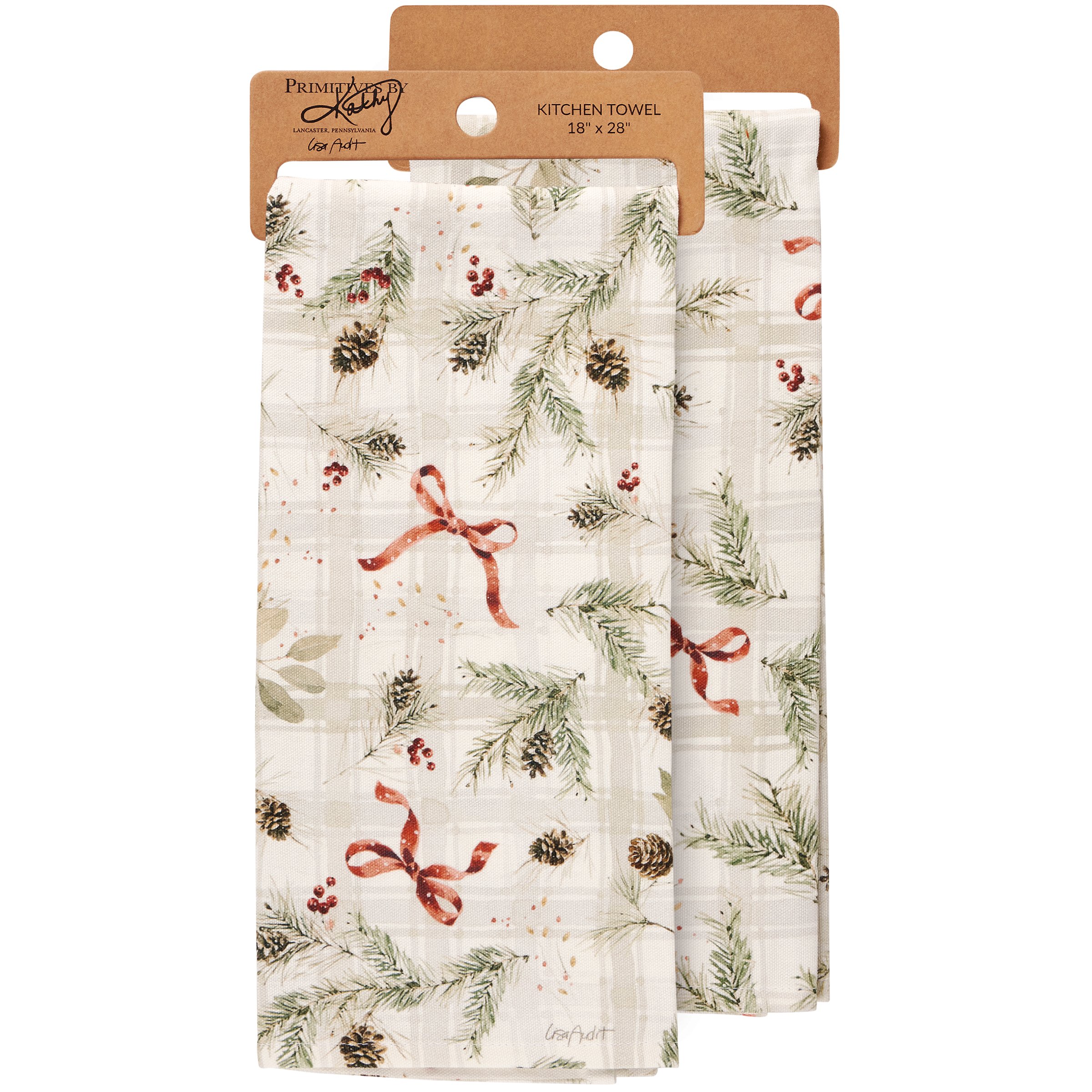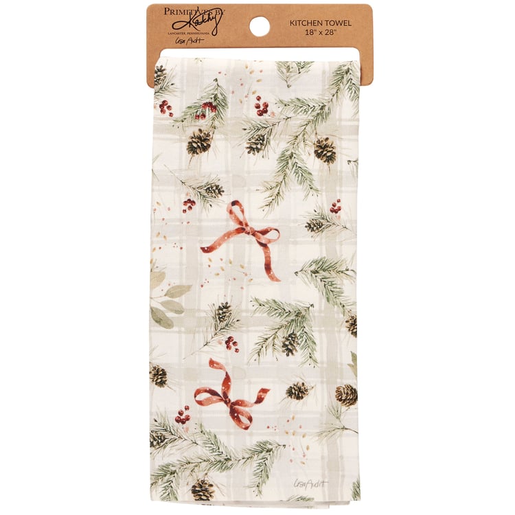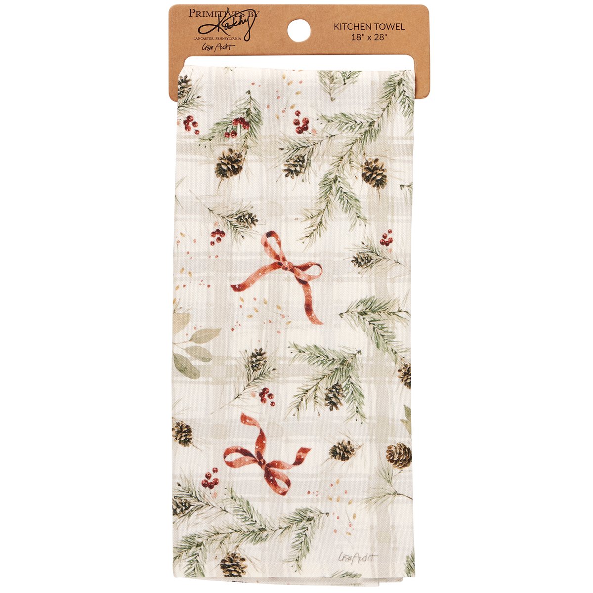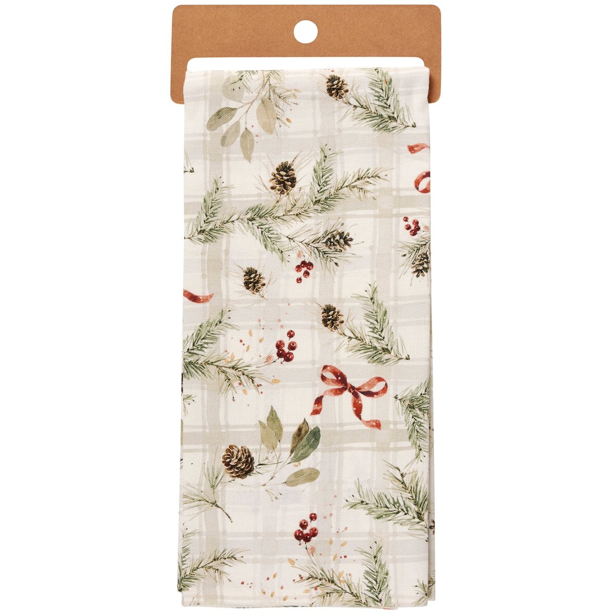 A cotton kitchen towel from our Christmas Collection displaying an all-over design of Christmas greenery and red bows on a subtle plaid background. Christmas greenery designs are replicated from original art hand painted in a delicate watercolor style. Our Christmas Greenery kitchen towel is conveniently machine-washable for easy cleaning. Seasonal kitchen towel is packaged on a cardboard hanger with hole to easily display on rack. A nature-themed Christmas gift perfect for a seasonal kitchen accessory.