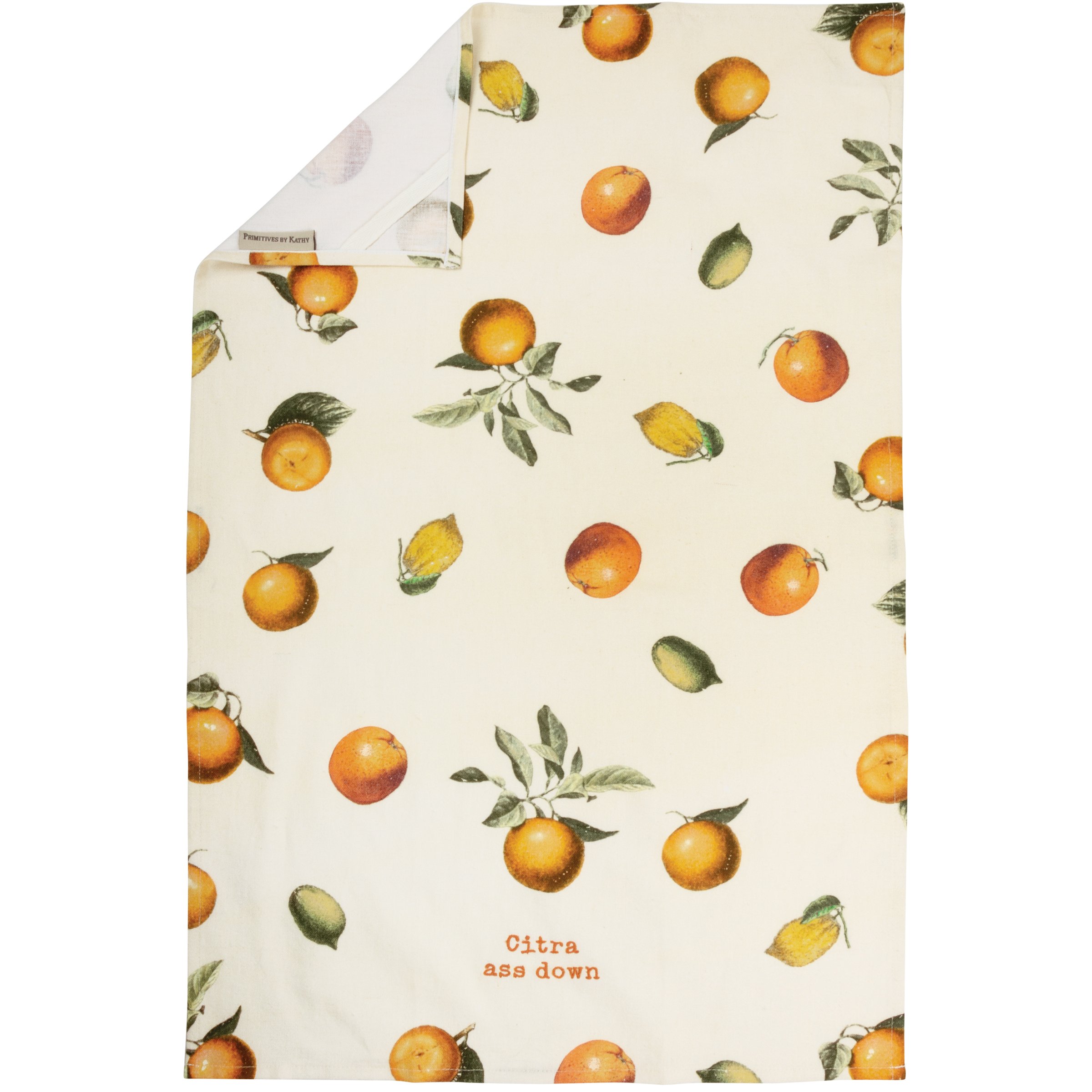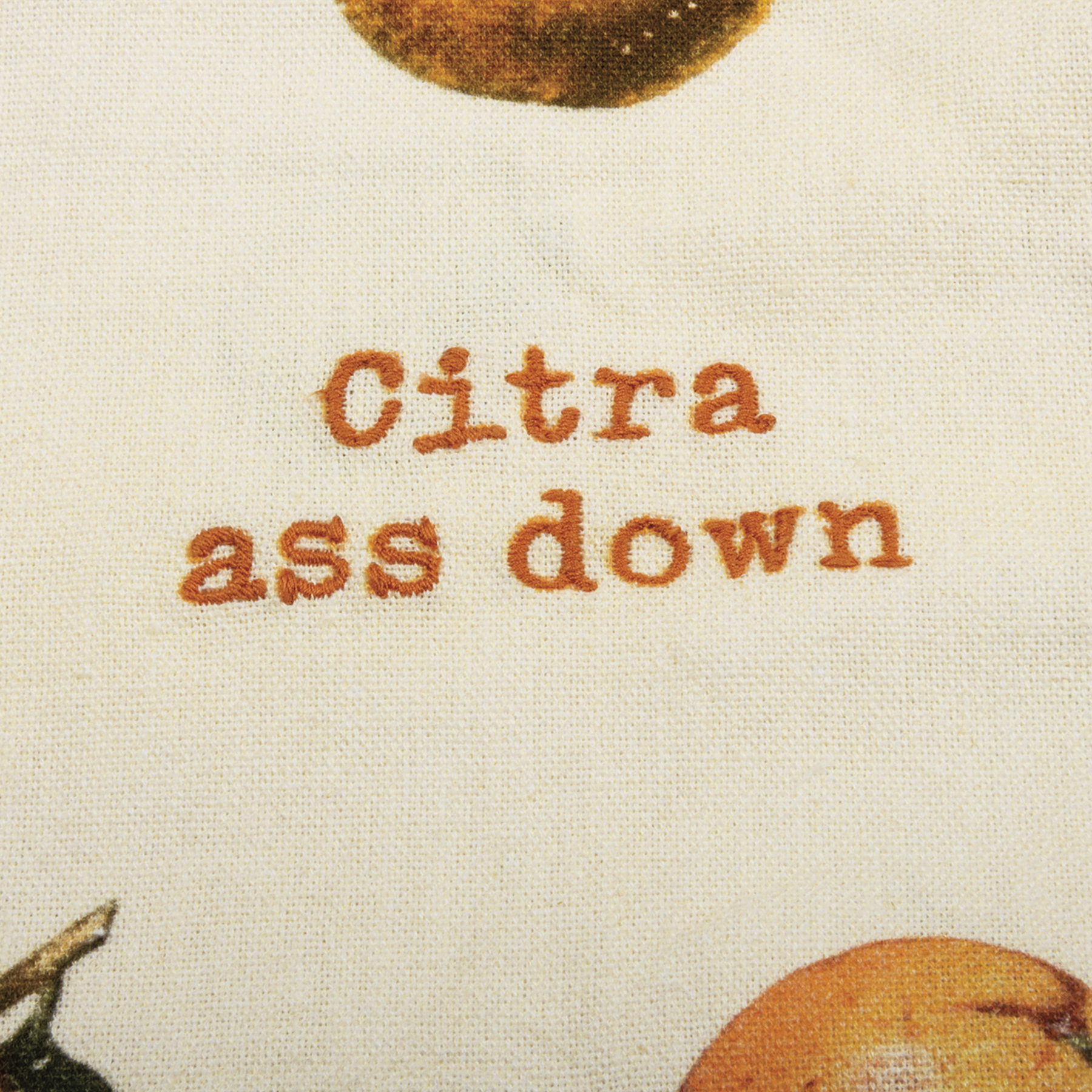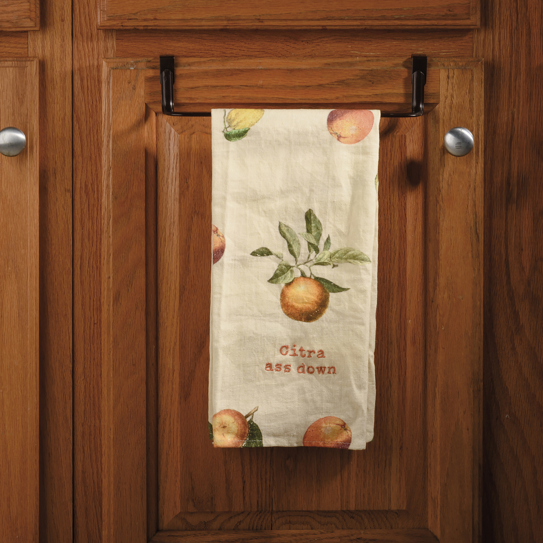 A cotton linen blend kitchen towel featuring all-over vintage-style citrus fruit designs and embroidered "Citra Ass Down" sentiment. Towel is packaged on a cardboard hanger with a hole to easily hang on rack. Features hangtag displaying full design. Machine-washable.