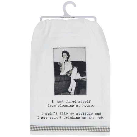 A white cotton kitchen towel from our Trash Talk By Annie Collection displaying a vintage black and white photograph on a stitched art panel complemented with a humorous sentiment that reads "I Just Fired Myself From Cleaning My House. I Didn't Like My Attitude And I Got Caught Drinking On The Job." Funny kitchen towel also features a gray gingham ribbon along the bottom. Our Cleaning Lady kitchen towel is conveniently machine-washable for easy cleaning. Kitchen towel is packaged on a clear plastic hanger to easily display on rack. A fun vintage style kitchen accessory great for everyday gifting.