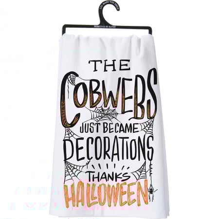 A Halloween-themed cotton kitchen towel lending a "The Cobwebs Just Became decorations Thanks Halloween" sentiment with cobwebs and spider designs to make for festive kitchen decor. Machine-washable.