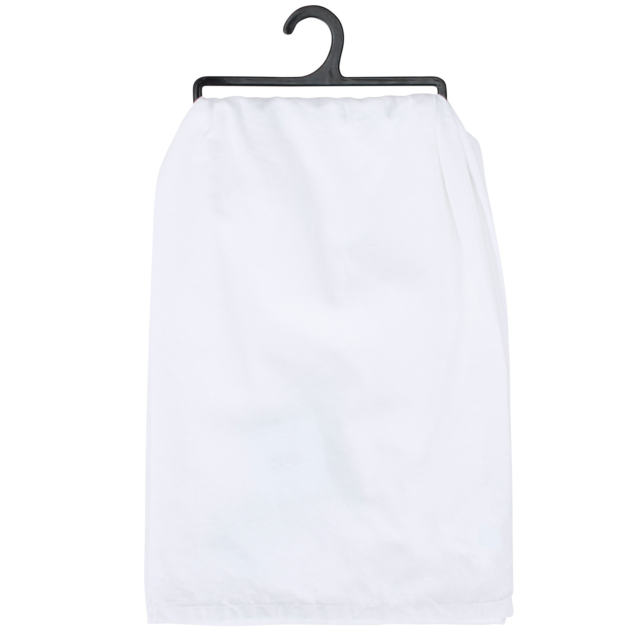 A white cotton kitchen towel from our Christmas Collection displaying a playful hand illustrated design of cocktail drinks with "Holiday Cookie Swap" crossed out and a sarcastic seasonal sentiment that reads "Cocktail Swap - Same Calories... Cleaner Kitchen." Holiday towel design features a Christmas color palette with metallic ink accents for added interest. Our Christmas Cocktail Swap kitchen towel is conveniently machine-washable for easy cleaning. This seasonal kitchen towel is packaged on a black plastic hanger to easily display on rack. A funny Christmas gift perfect for adding personality to any kitchen while holiday decorating.