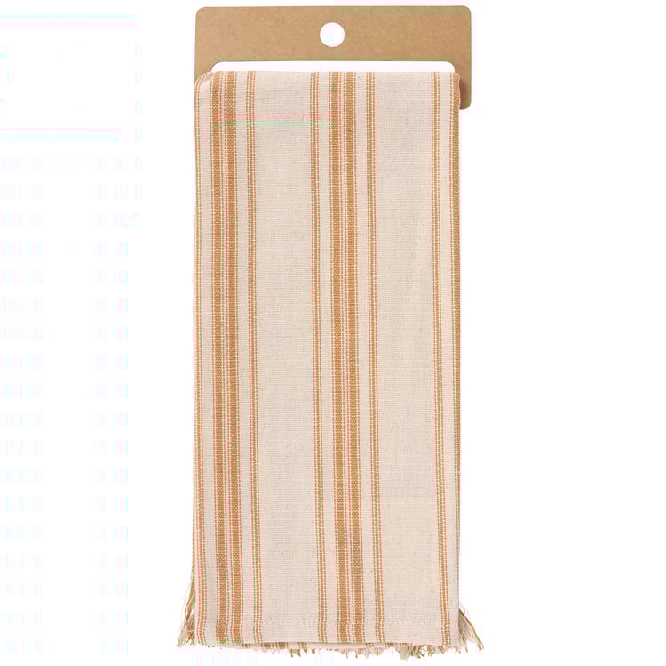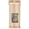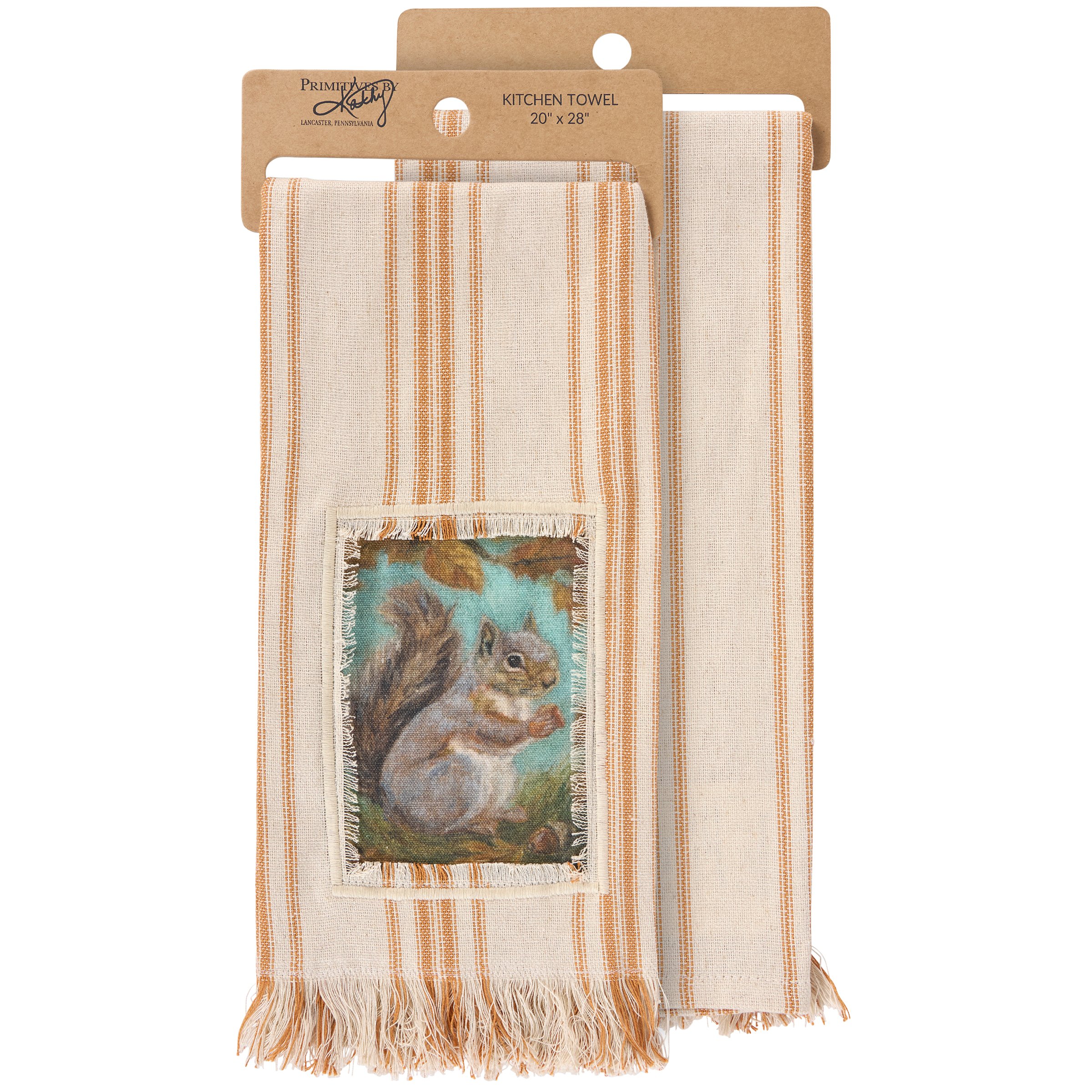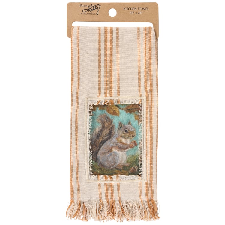 A cream cotton kitchen towel from our Fall & Harvest Collection featuring a stitched art panel with frayed border and woven orange stripes throughout. Fall design displays a squirrel holding an acorn replicated from original artwork painted onto burlap canvas, giving the art a unique depth and texture. Our Curious Squirrel kitchen towel is conveniently machine-washable for easy cleaning. Seasonal kitchen towel is packaged on a cardboard hanger with hole to easily display on rack. A rustic fall-themed kitchen accessory perfect for seasonal use.