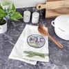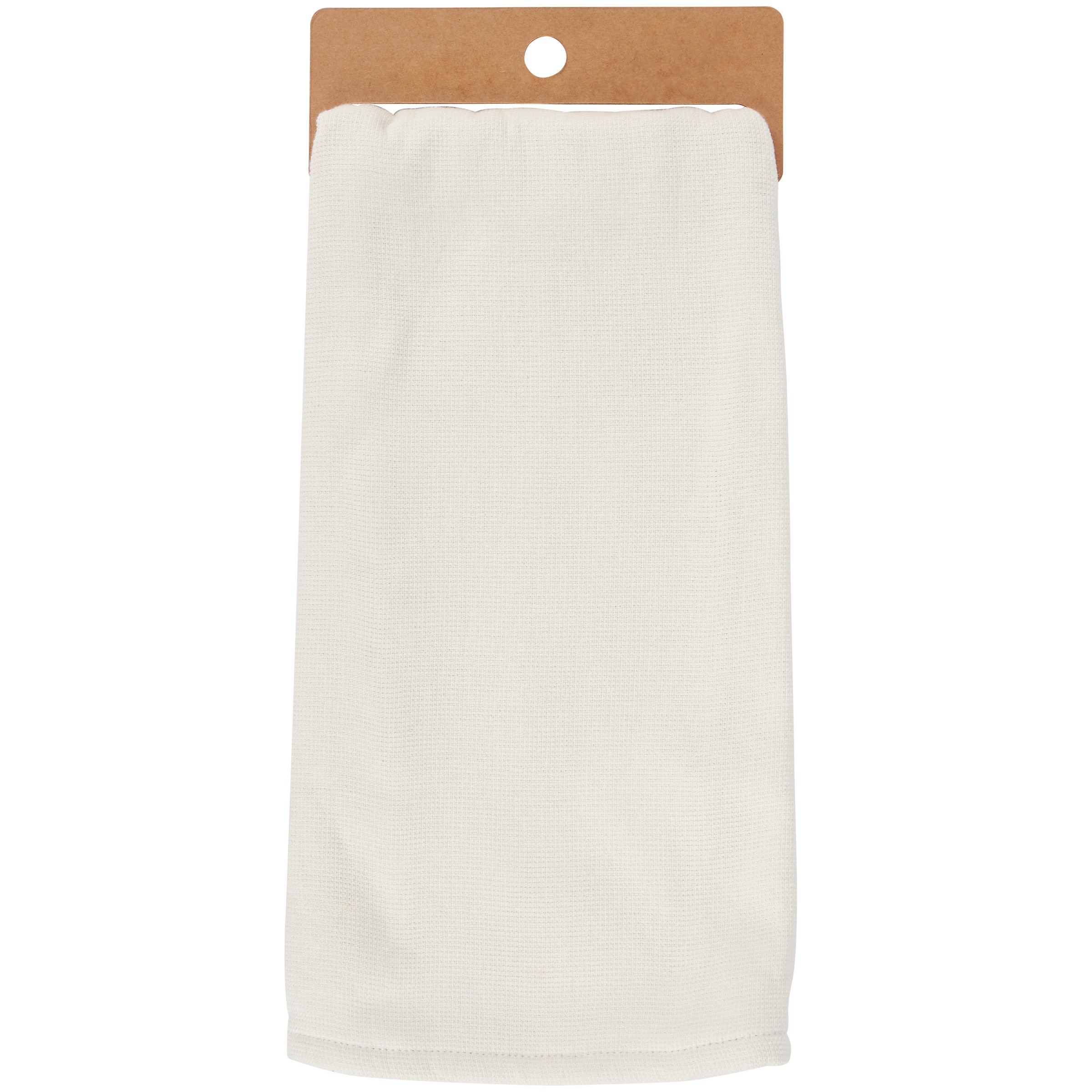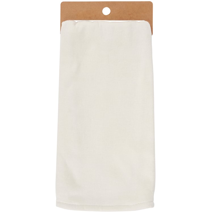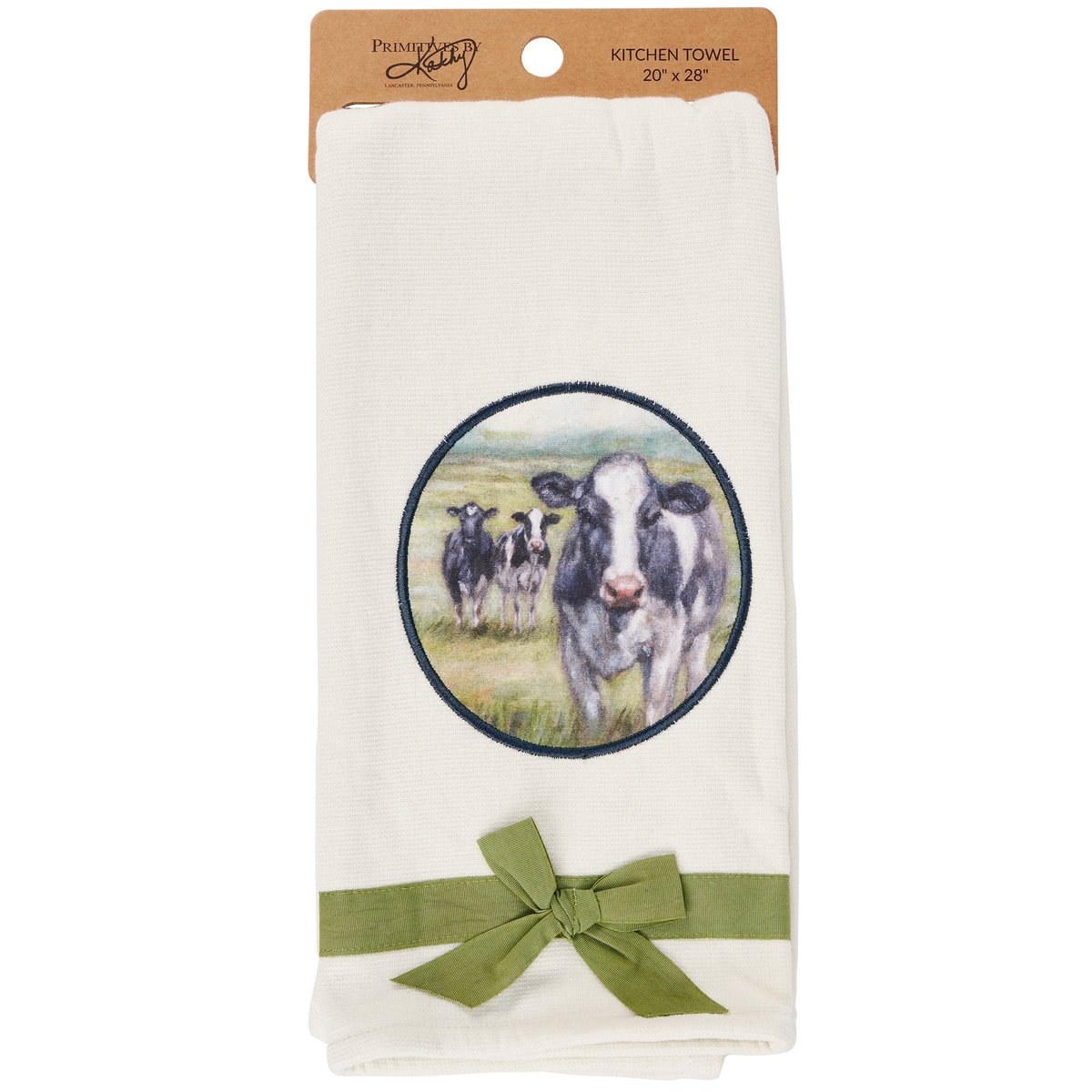 A cotton kitchen towel from our Farmhouse Collection featuring a farm animal inspired design with a stitched art panel and green ribbon accent. Art panel displays a charming scene of dairy cows in a field replicated from original artwork painted onto burlap canvas, giving the art a unique depth and texture. Cow kitchen towel features a terrycloth layer on the back for added absorbency. Our Dairy Cows kitchen towel is conveniently machine-washable for easy cleaning. Farm kitchen towel is packaged on a cardboard hanger with hole to easily display on rack. A rustic farm-themed kitchen accessory perfect for everyday use.