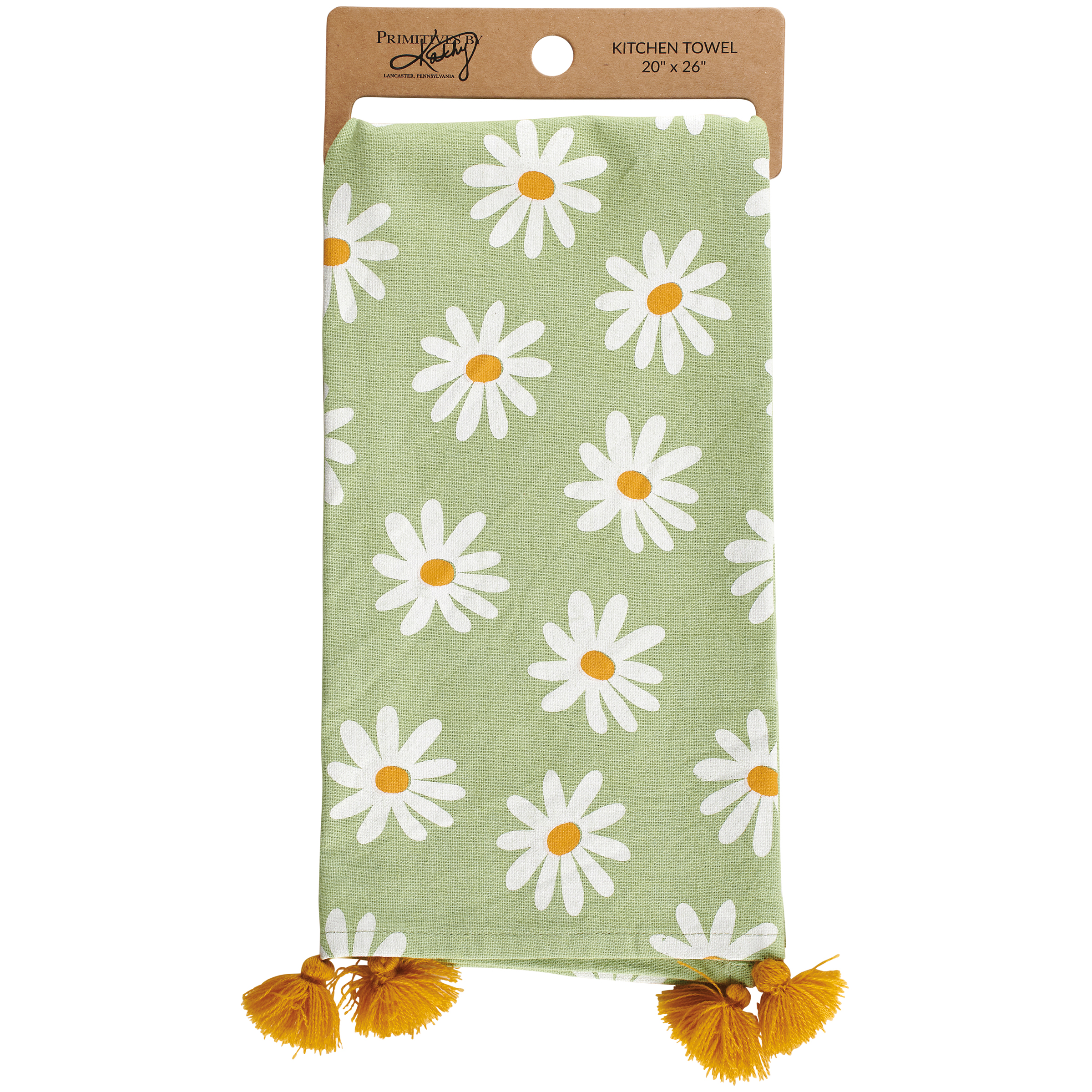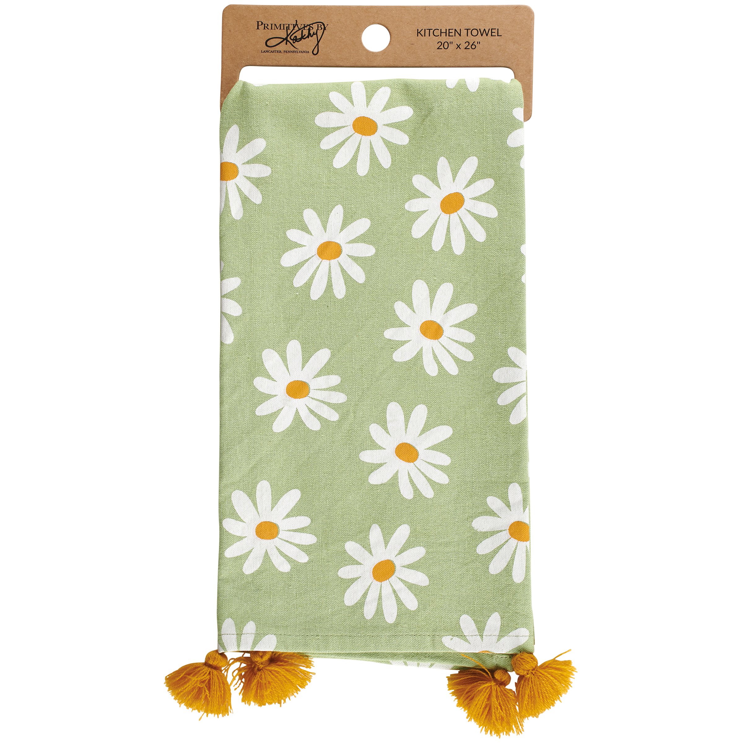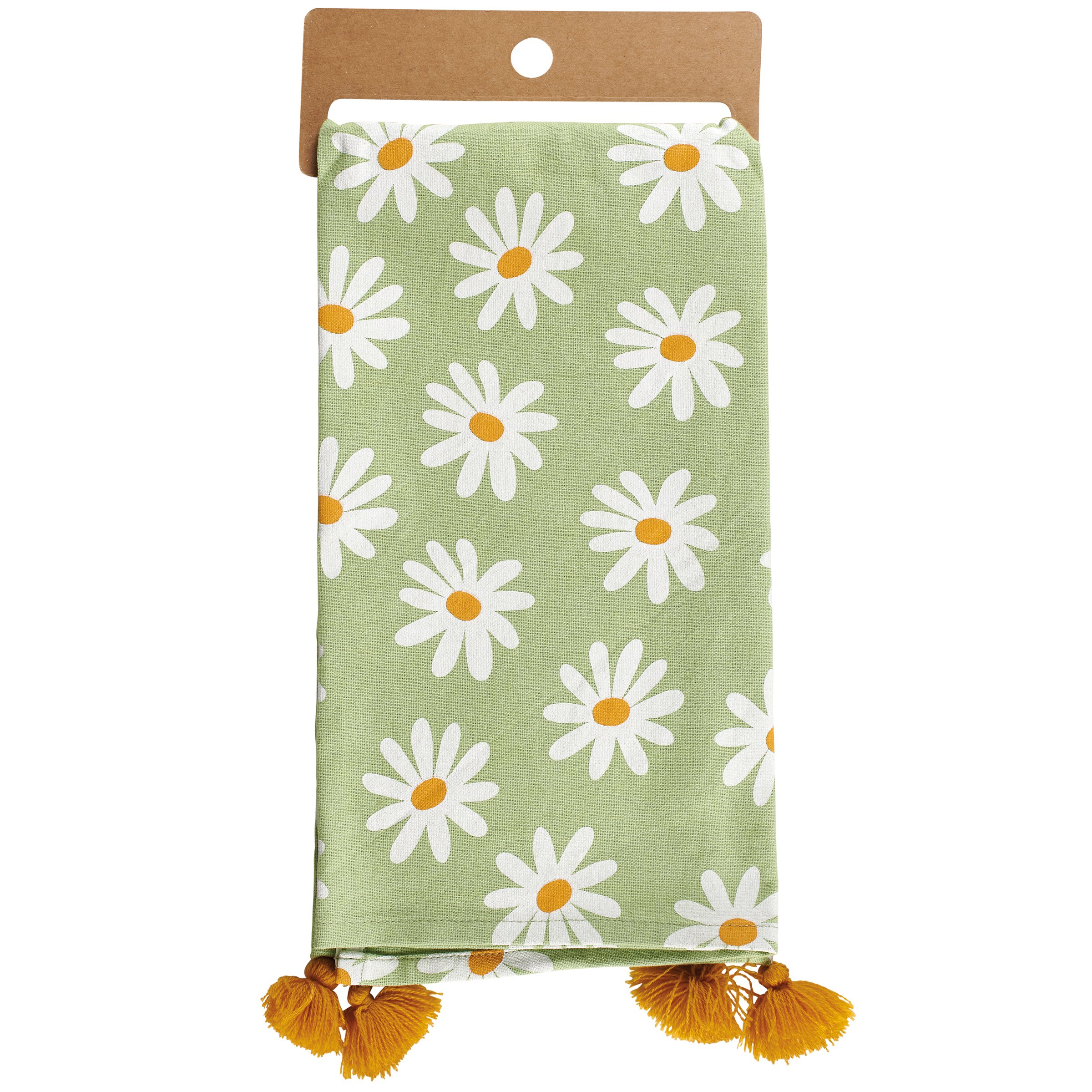 A green cotton kitchen towel from our Garden Collection displaying an all-over print of daisies and yellow tassels on each corner. Our Daisy kitchen towel is machine-washable for convenient cleaning. Packaged on a cardboard hanger with hole to easily display on rack. A charming daisy-themed kitchen accessory perfect for everyday use.