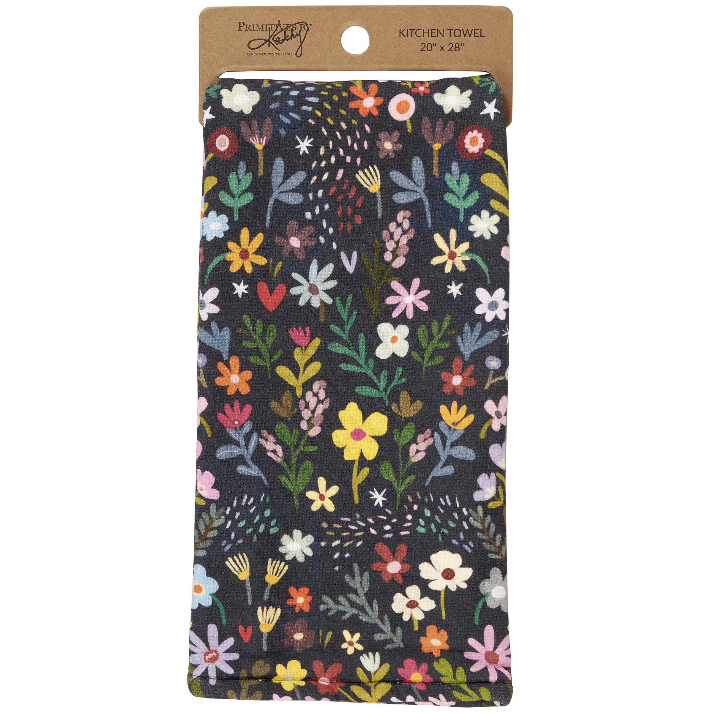 A cotton kitchen towel from our Inspiration & Blooms Collection displaying an all-over design of vibrant florals on a dark background replicated from original hand illustrated art. Floral kitchen towel features a terrycloth layer on the back for added absorbency and cotton tape loop for hanging. Our Dark Floral kitchen towel is conveniently machine-washable for easy cleaning. Kitchen towel is packaged on a cardboard hanger with hole to easily display on rack. A floral-themed kitchen accessory perfect for everyday use.