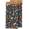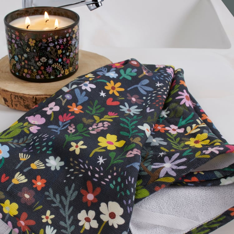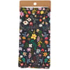 A cotton kitchen towel from our Inspiration & Blooms Collection displaying an all-over design of vibrant florals on a dark background replicated from original hand illustrated art. Floral kitchen towel features a terrycloth layer on the back for added absorbency and cotton tape loop for hanging. Our Dark Floral kitchen towel is conveniently machine-washable for easy cleaning. Kitchen towel is packaged on a cardboard hanger with hole to easily display on rack. A floral-themed kitchen accessory perfect for everyday use.