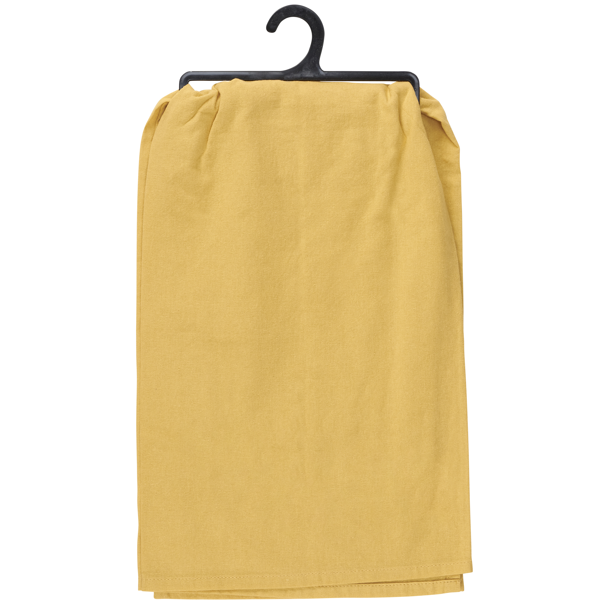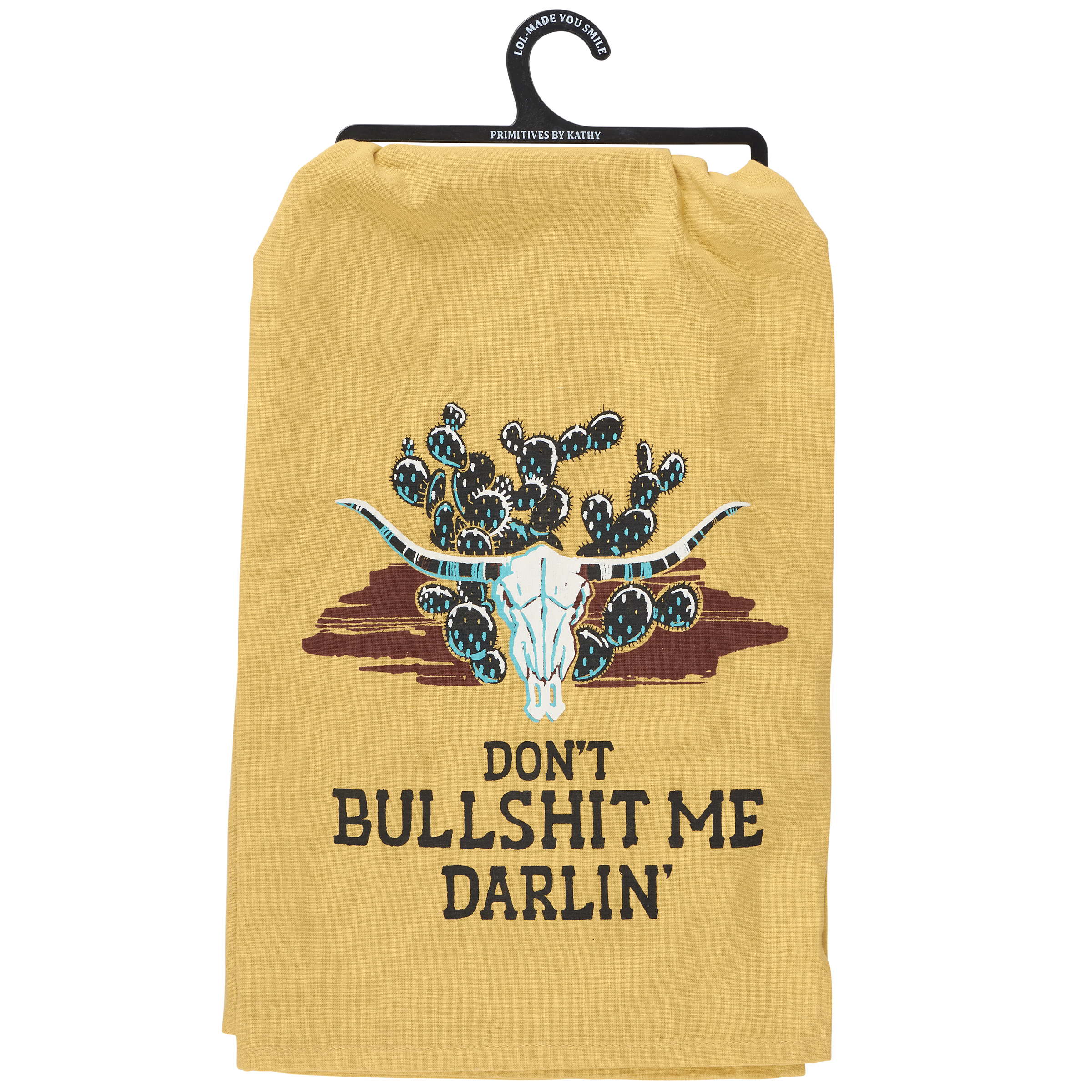 A golden yellow cotton kitchen towel from our Western Collection displaying a western inspired design of a longhorn skull and a cactus plant in a modern style with fun hand illustrated details and a sentiment that reads "Don't Bullshit Me Darlin'." Our Darlin' kitchen towel is conveniently machine-washable for easy cleaning. Packaged on a black plastic hanger to easily display on rack. A fun western-themed accessory perfect for everyday use.