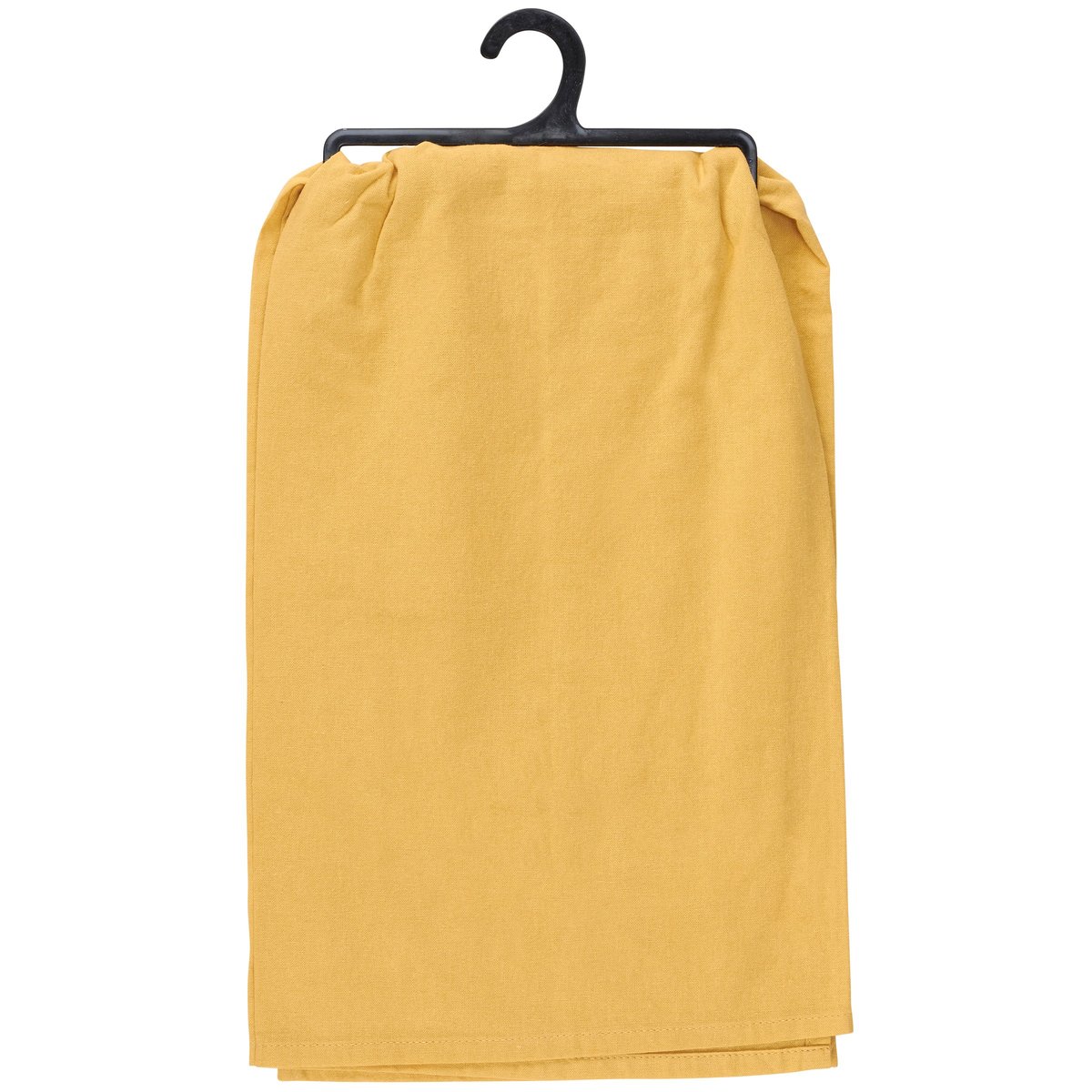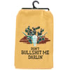 A golden yellow cotton kitchen towel from our Western Collection displaying a western inspired design of a longhorn skull and a cactus plant in a modern style with fun hand illustrated details and a sentiment that reads "Don't Bullshit Me Darlin'." Our Darlin' kitchen towel is conveniently machine-washable for easy cleaning. Packaged on a black plastic hanger to easily display on rack. A fun western-themed accessory perfect for everyday use.