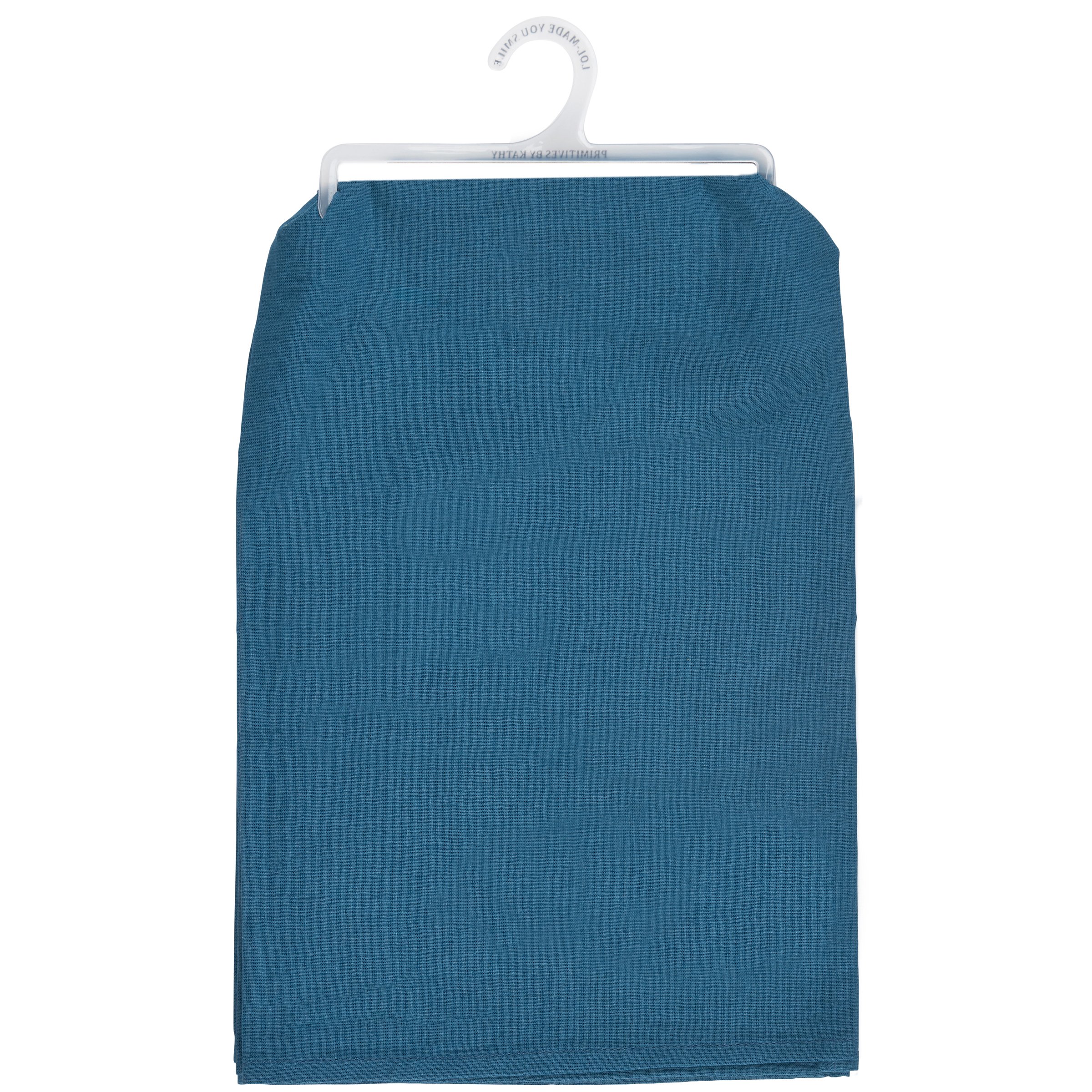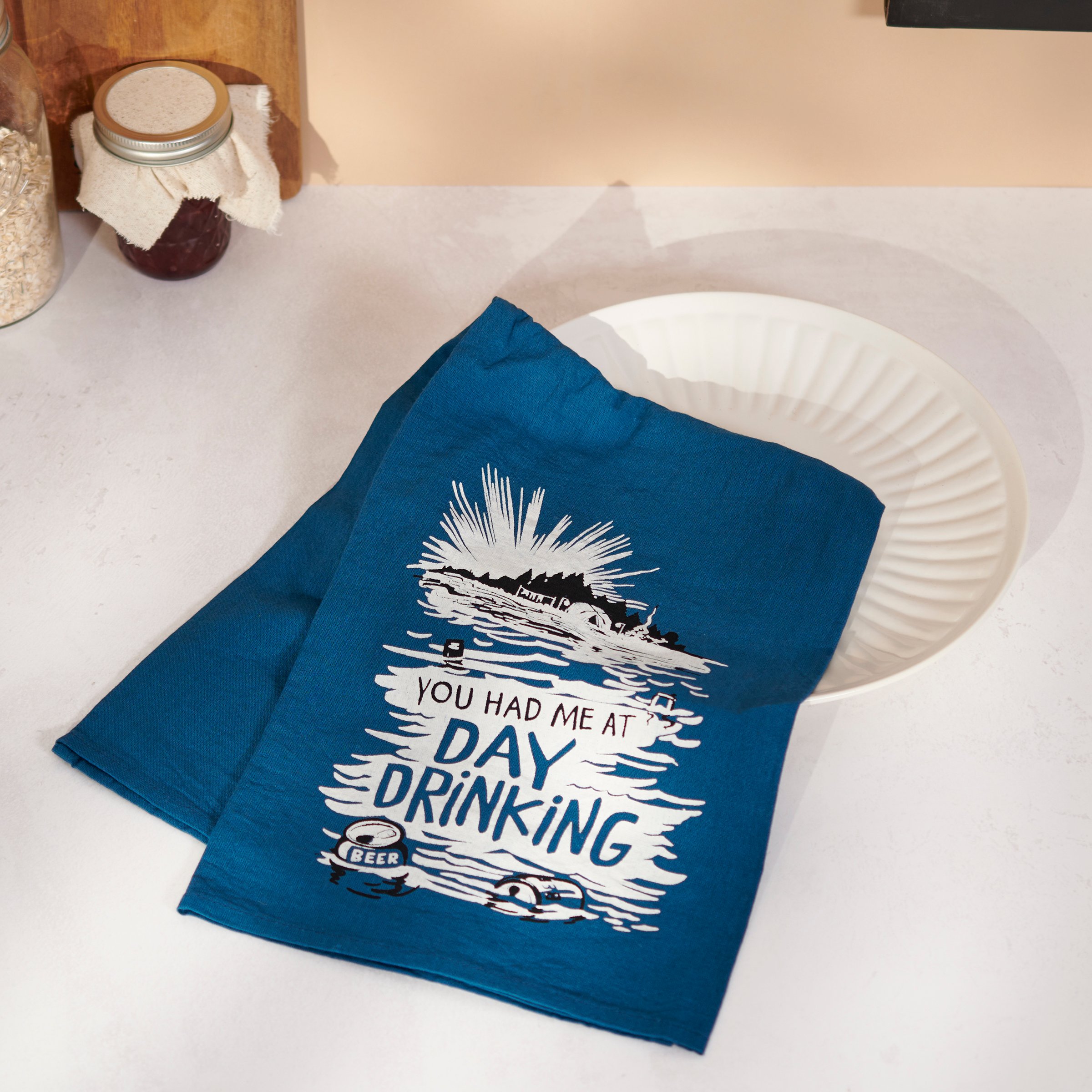 A lake blue cotton kitchen towel from our Lake & Cabin Collection displaying a unique hand illustrated design of a campsite by a lake with floating beer cans and a humorous camping-themed sentiment that reads "You Had Me At Day Drinking." Our Day Drinking kitchen towel is machine-washable for convenient cleaning. Packaged on a clear plastic hanger to easily display on rack. A fun camping-themed kitchen accessory perfect for everyday use.