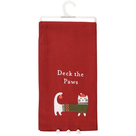A red cotton-linen kitchen towel from our Holiday Pet Collection displaying a cat wearing a Christmas sweater with an ornament hanging from its tail under a fun pet-themed sentiment that reads "Deck The Paws." Designs are fully embroidered with white tassel accents for added interest. Our Deck The Paws kitchen towel is conveniently machine-washable for easy cleaning. Seasonal kitchen towel is packaged on a plastic hanger to easily display on rack. A fun pet-themed kitchen accessory perfect for seasonal use.