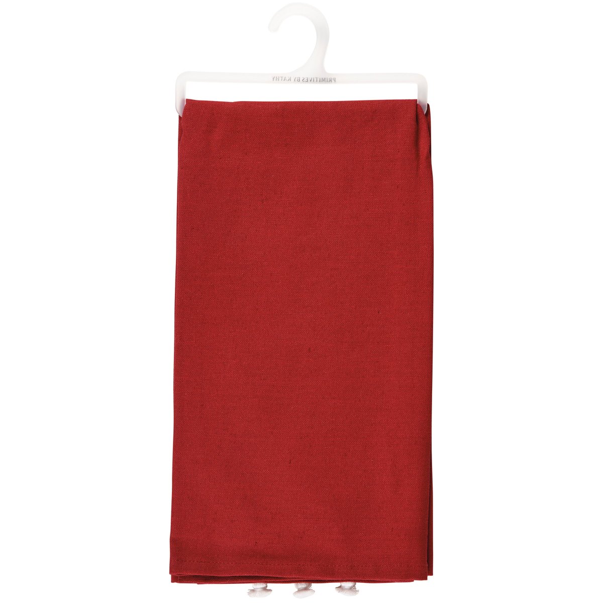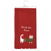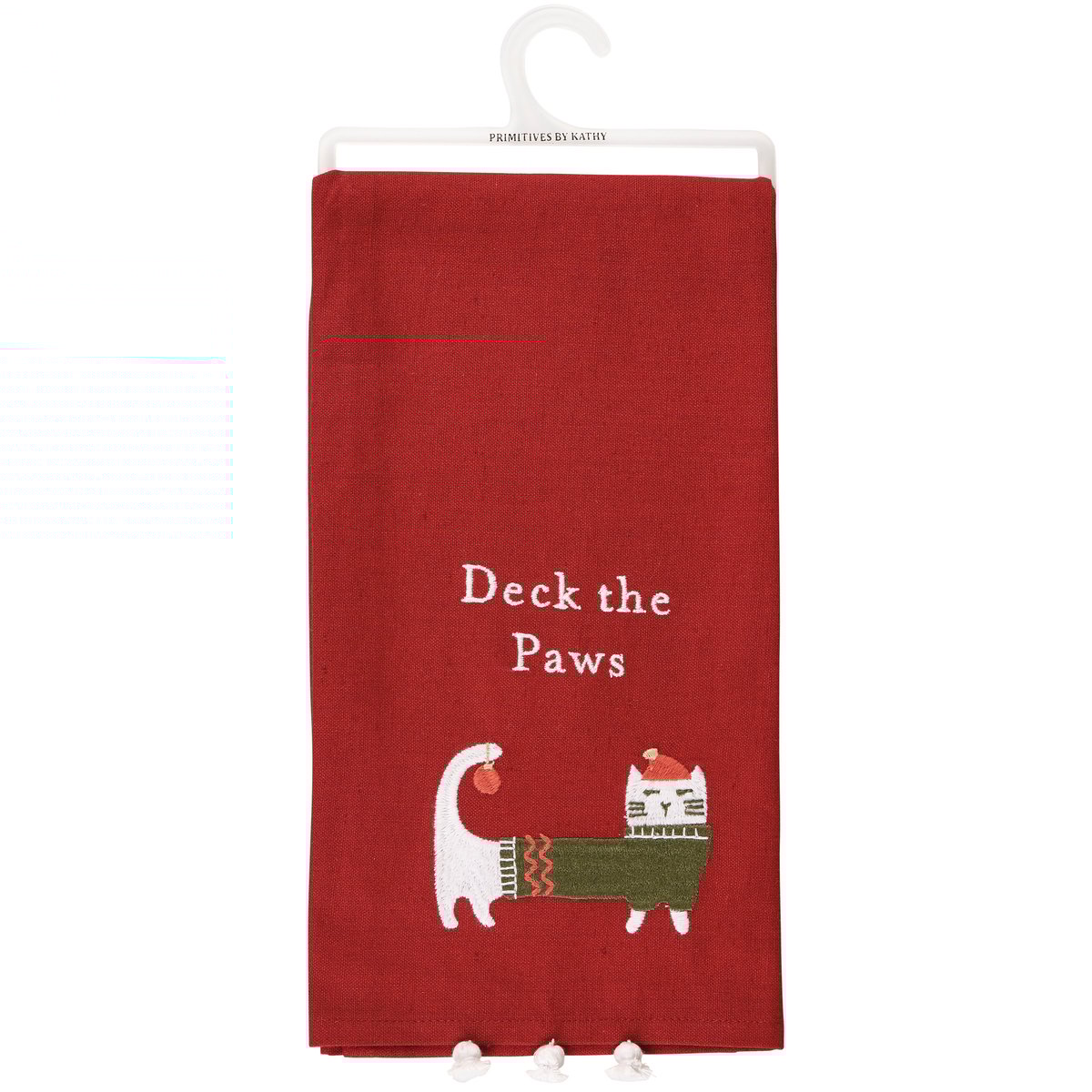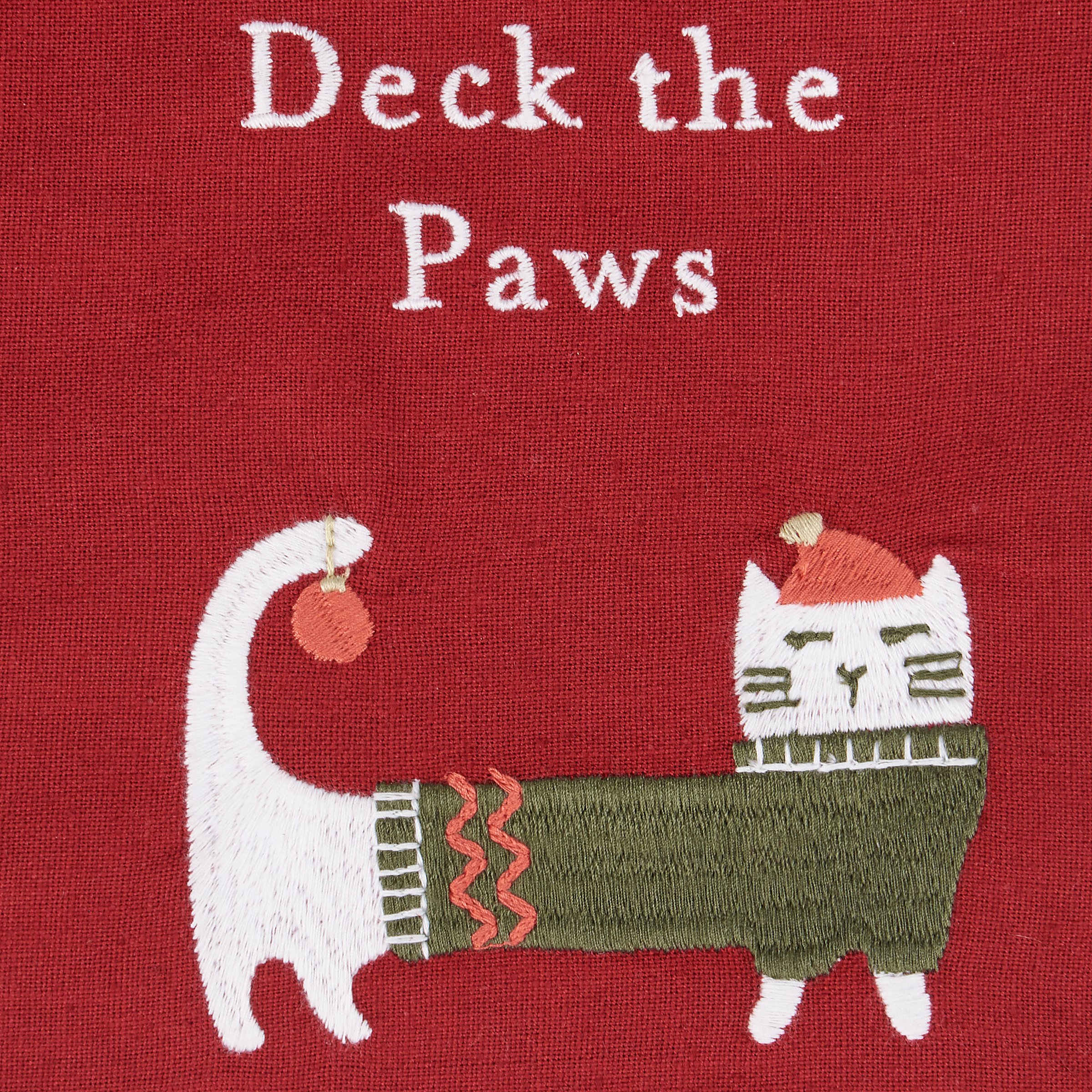 A red cotton-linen kitchen towel from our Holiday Pet Collection displaying a cat wearing a Christmas sweater with an ornament hanging from its tail under a fun pet-themed sentiment that reads "Deck The Paws." Designs are fully embroidered with white tassel accents for added interest. Our Deck The Paws kitchen towel is conveniently machine-washable for easy cleaning. Seasonal kitchen towel is packaged on a plastic hanger to easily display on rack. A fun pet-themed kitchen accessory perfect for seasonal use.