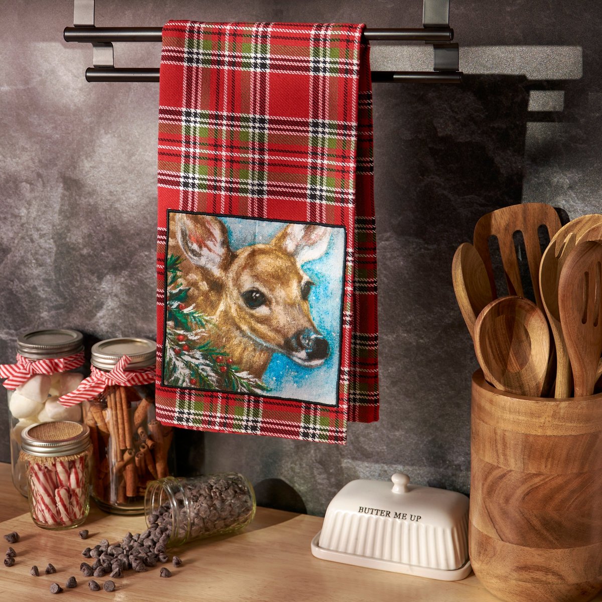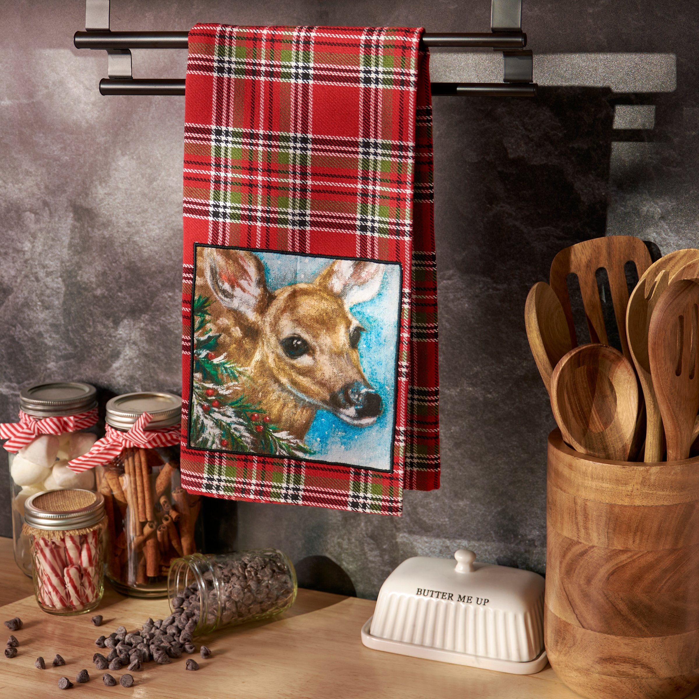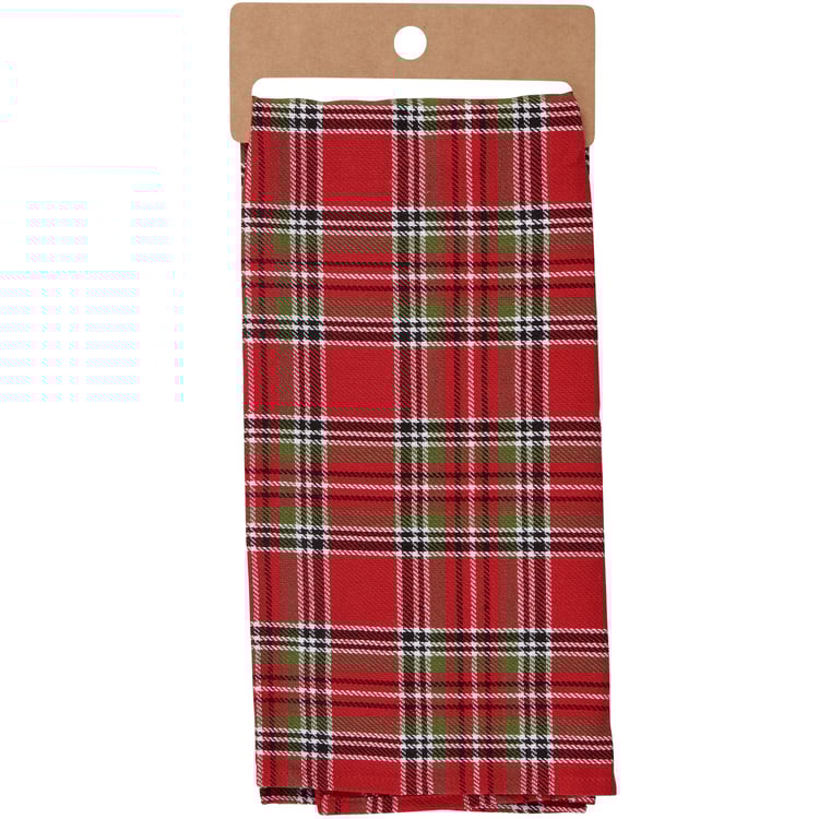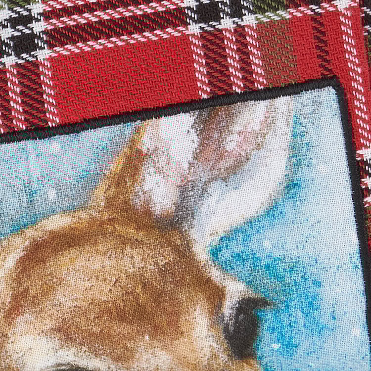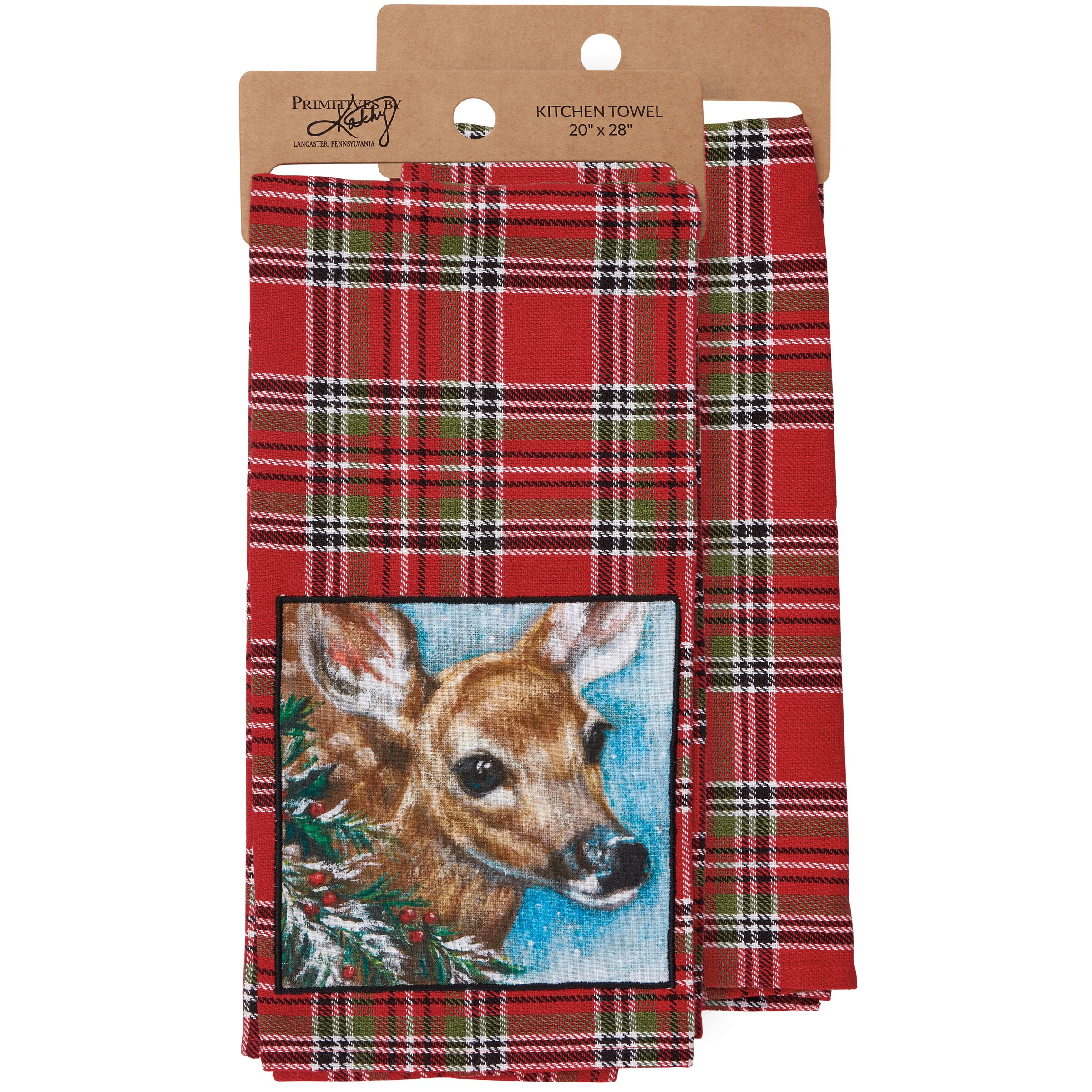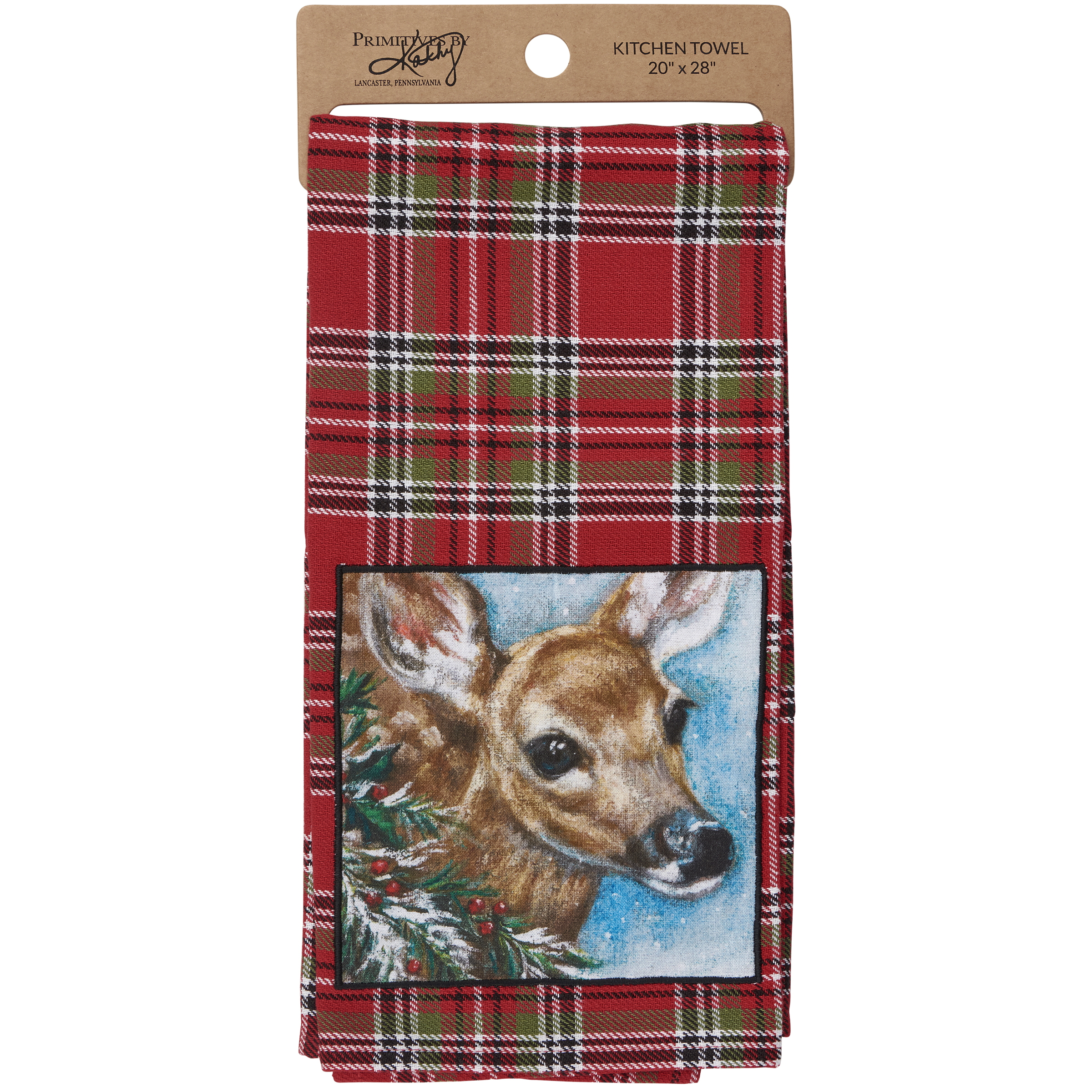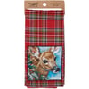A cotton kitchen towel from our Christmas Collection featuring a stitched art panel with Christmas tartan plaid pattern all-over towel. Art panel displays a deer in a winter scene. Design is replicated from original artwork painted onto burlap canvas, giving the art a unique depth and texture. Our Deer kitchen towel is conveniently machine-washable for easy cleaning. Seasonal kitchen towel is packaged on a cardboard hanger with hole to easily hang on rack. A rustic winter-themed kitchen accessory perfect for seasonal use.