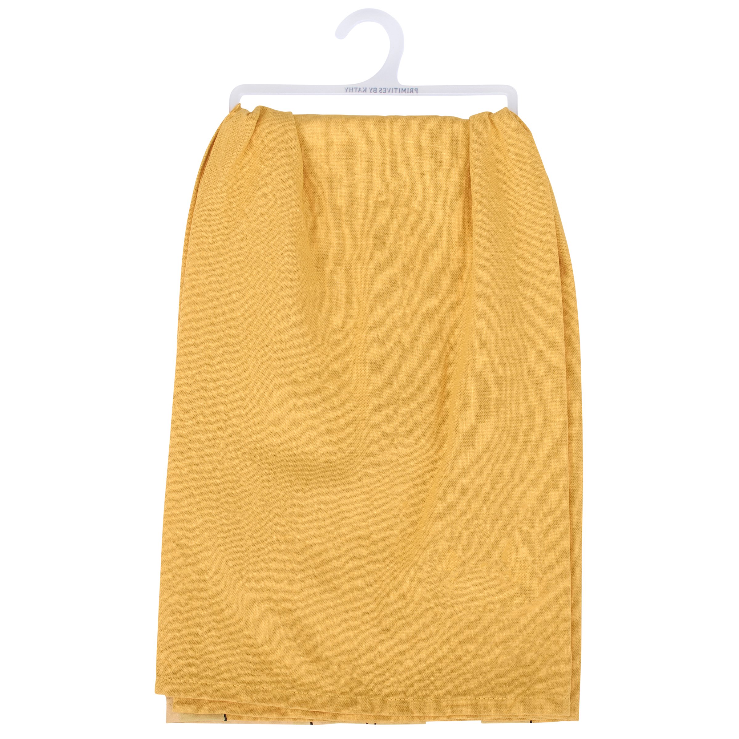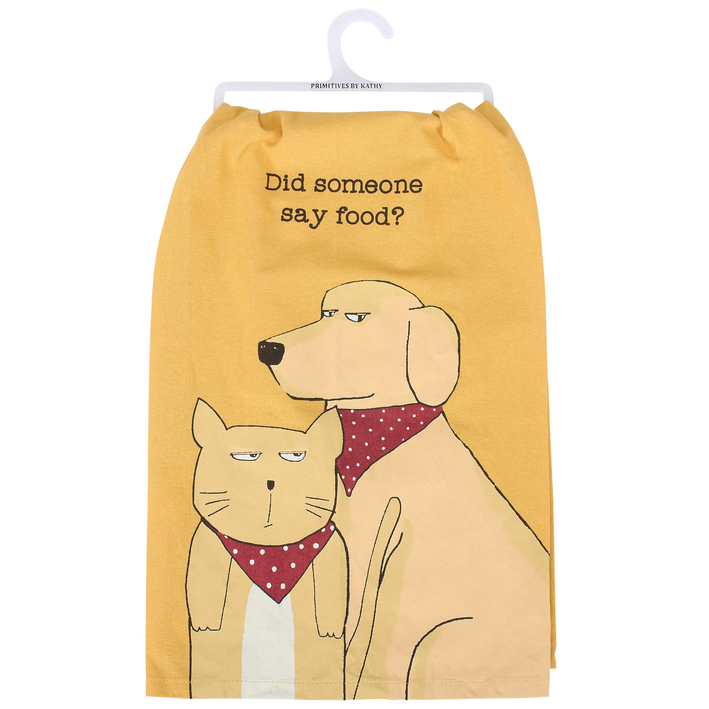 A yellow cotton kitchen towel from our Pet Collection displaying a rustic design of a sassy dog and cat wearing bandanas with a fun pet themed sentiment that reads "Did Someone Say Food?" Our Did Someone Say Food kitchen towel is conveniently machine-washable for easy cleaning. Pet kitchen towel is packaged on a clear plastic hanger to easily display on rack. A fun pet themed gift perfect for adding personality to any kitchen while showing off a love for pets.