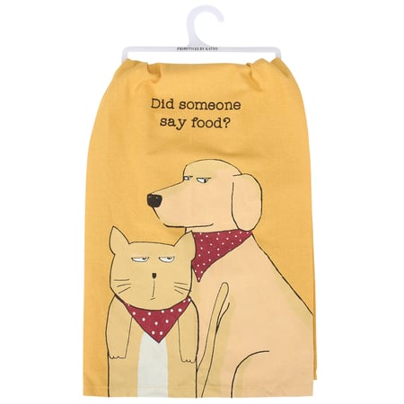 A yellow cotton kitchen towel from our Pet Collection displaying a rustic design of a sassy dog and cat wearing bandanas with a fun pet themed sentiment that reads "Did Someone Say Food?" Our Did Someone Say Food kitchen towel is conveniently machine-washable for easy cleaning. Pet kitchen towel is packaged on a clear plastic hanger to easily display on rack. A fun pet themed gift perfect for adding personality to any kitchen while showing off a love for pets.