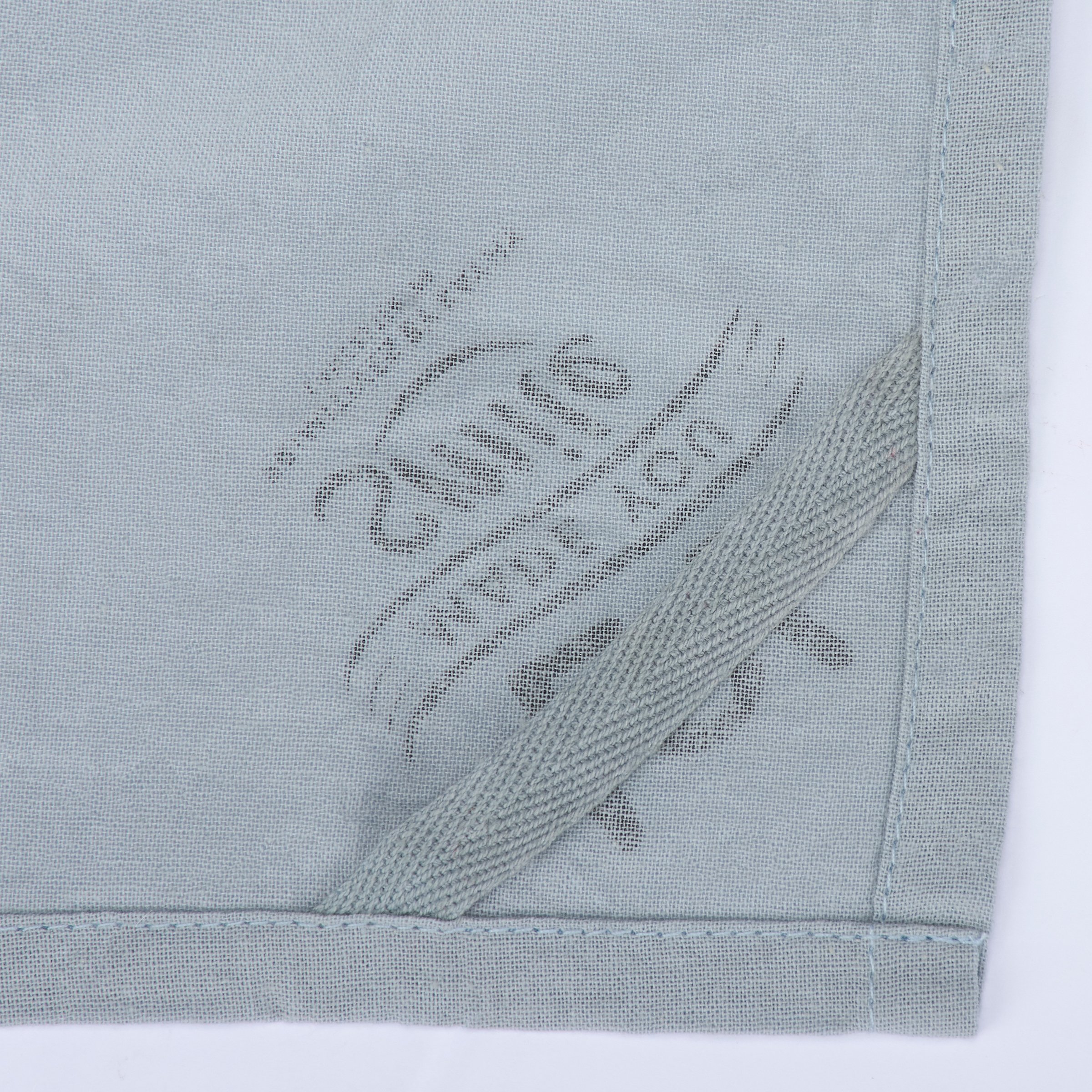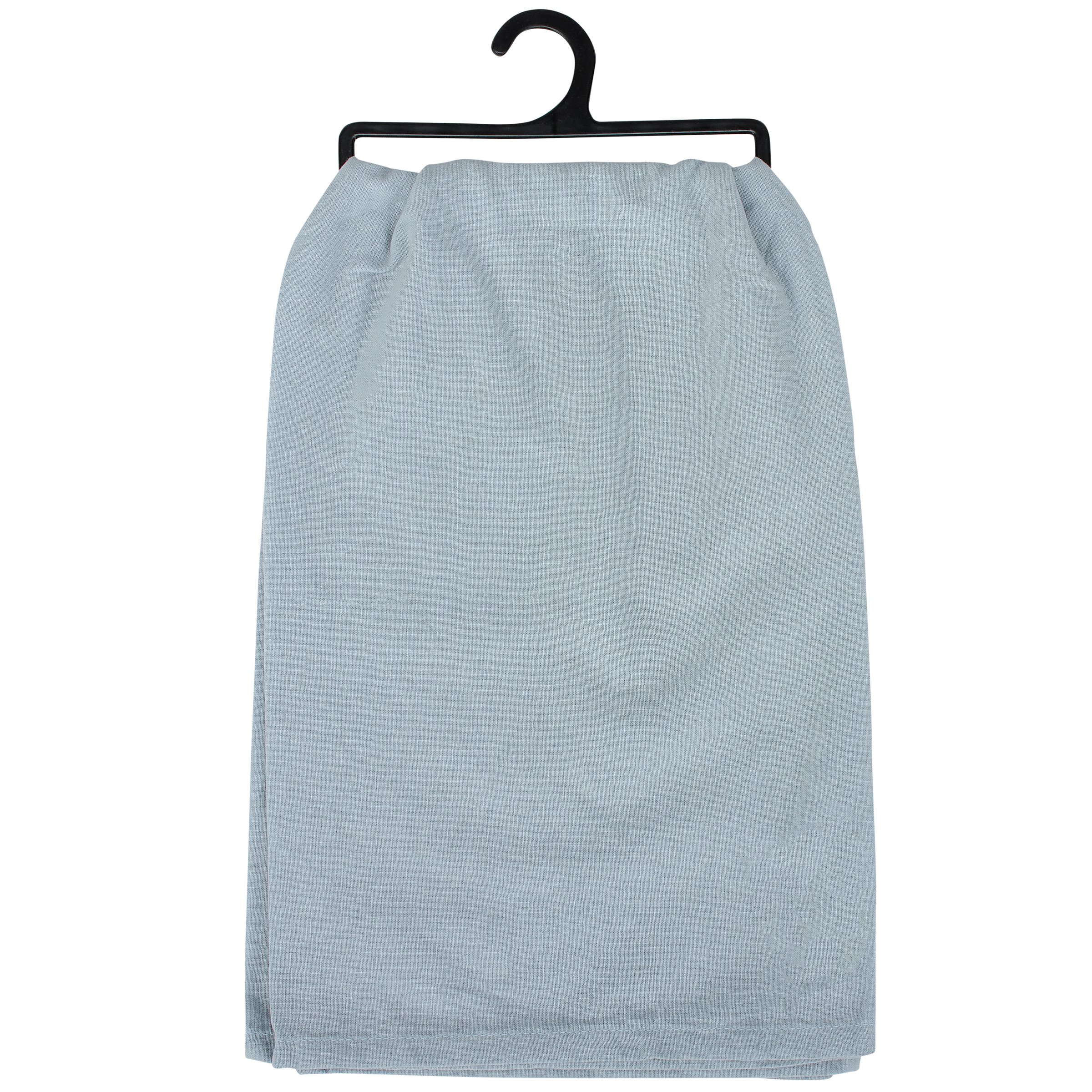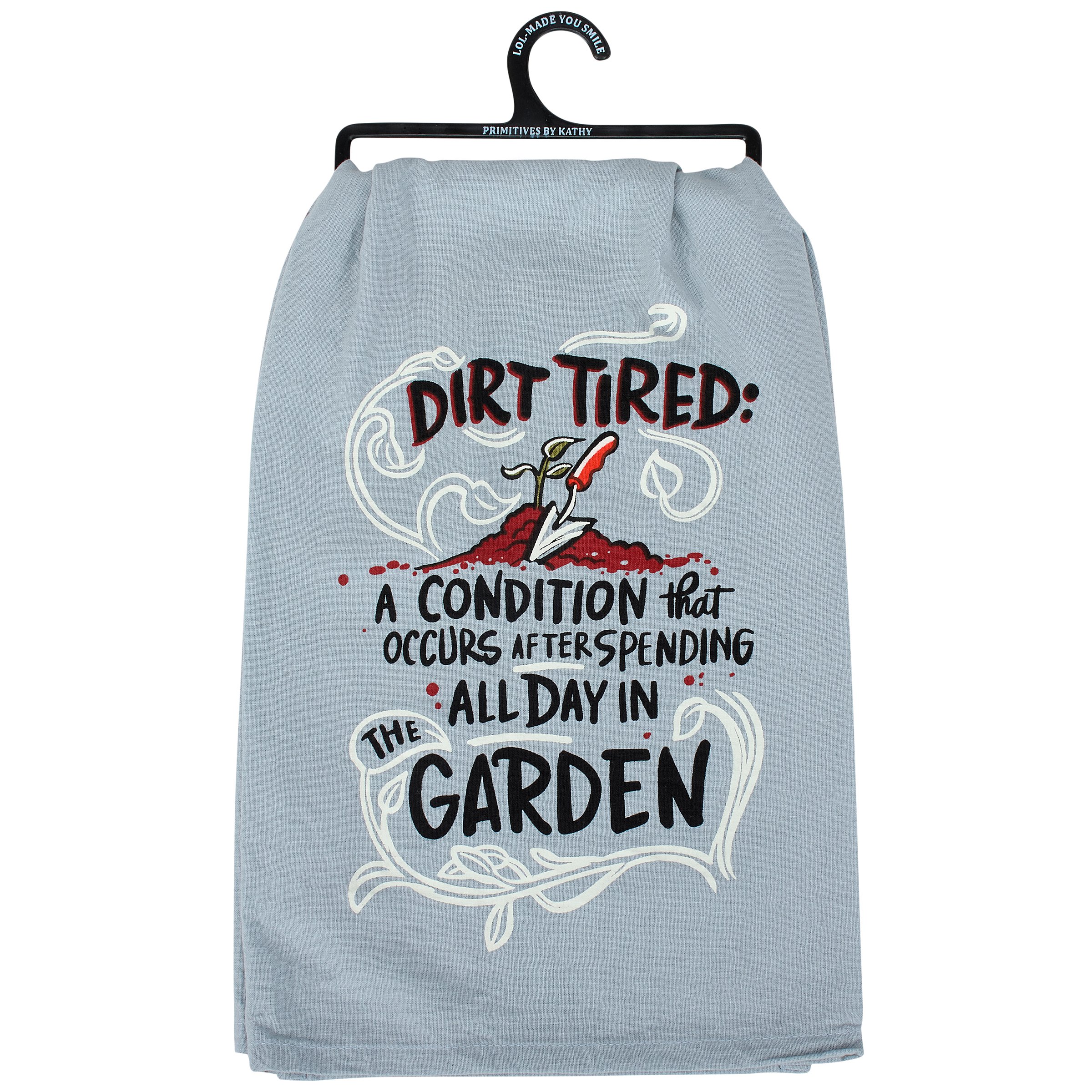A blue cotton kitchen towel from our Homestead Collection displaying a playful hand illustrated design of a sprout in dirt with a fun gardening inspired sentiment that reads "Dirt Tired: A Condition That Occurs After Spending All Day In The Garden." Our Dirt Tired kitchen towel is conveniently machine-washable for easy cleaning. This homestead kitchen towel is packaged on a black plastic hanger to easily display on rack. A fun homestead-themed gift perfect for adding personality to any kitchen while showing off their DIY lifestyle.