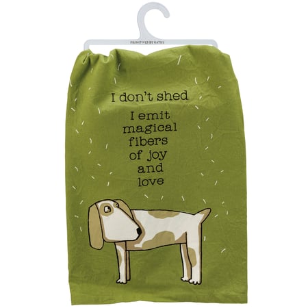 A rustic-inspired cotton kitchen towel from our Pet Collection featuring an "I Don't Shed I Emit Magical Fibers Of Joy And Love" sentiment with sassy dog and dog hair design. Our I Don't Shed kitchen towel is machine-washable.