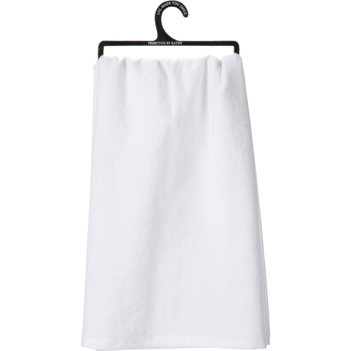 A black and white cotton kitchen towel displaying a unique hand illustrated design of a fun dog inspired sentiment that reads "Dog Hair - Both A Condiment And A Fashion Accessory." Our Dog Hair kitchen towel is conveniently machine-washable for easy cleaning. Funny kitchen towel is packaged on a black plastic hanger to easily display on rack. A fun pet-themed kitchen accessory perfect for everyday use.