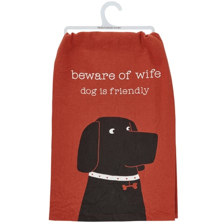 A rustic-inspired cotton kitchen towel from our Pet Collection displaying a happy dog design with humorous sentiment that reads "Beware Of Wife - Dog Is Friendly." Our Dog Is Friendly kitchen towel is machine-washable for convenient cleaning. Packaged on a clear plastic hanger to easily display on rack. A fun and functional everyday kitchen accent.