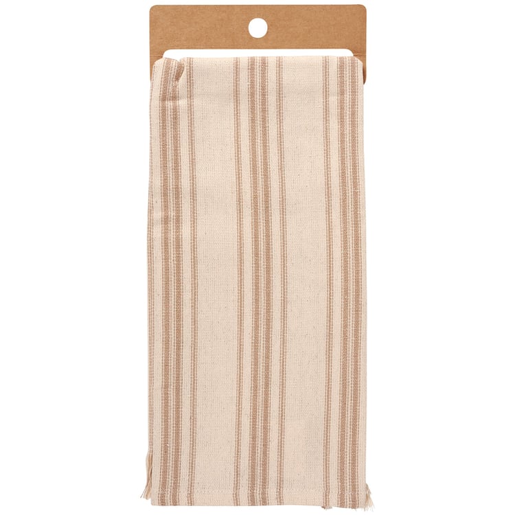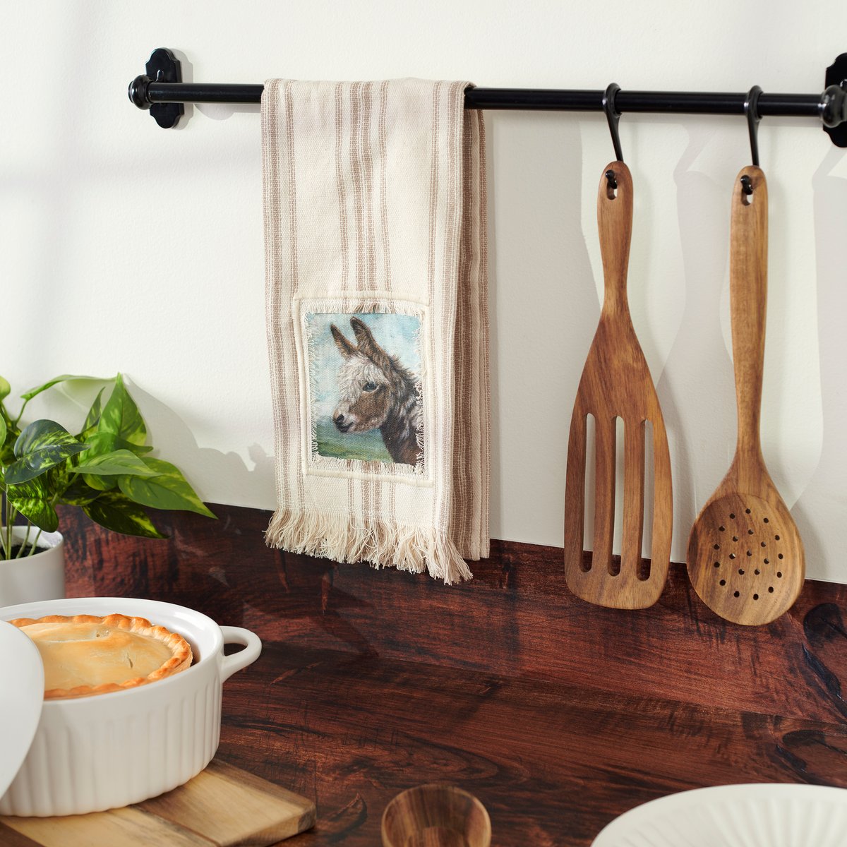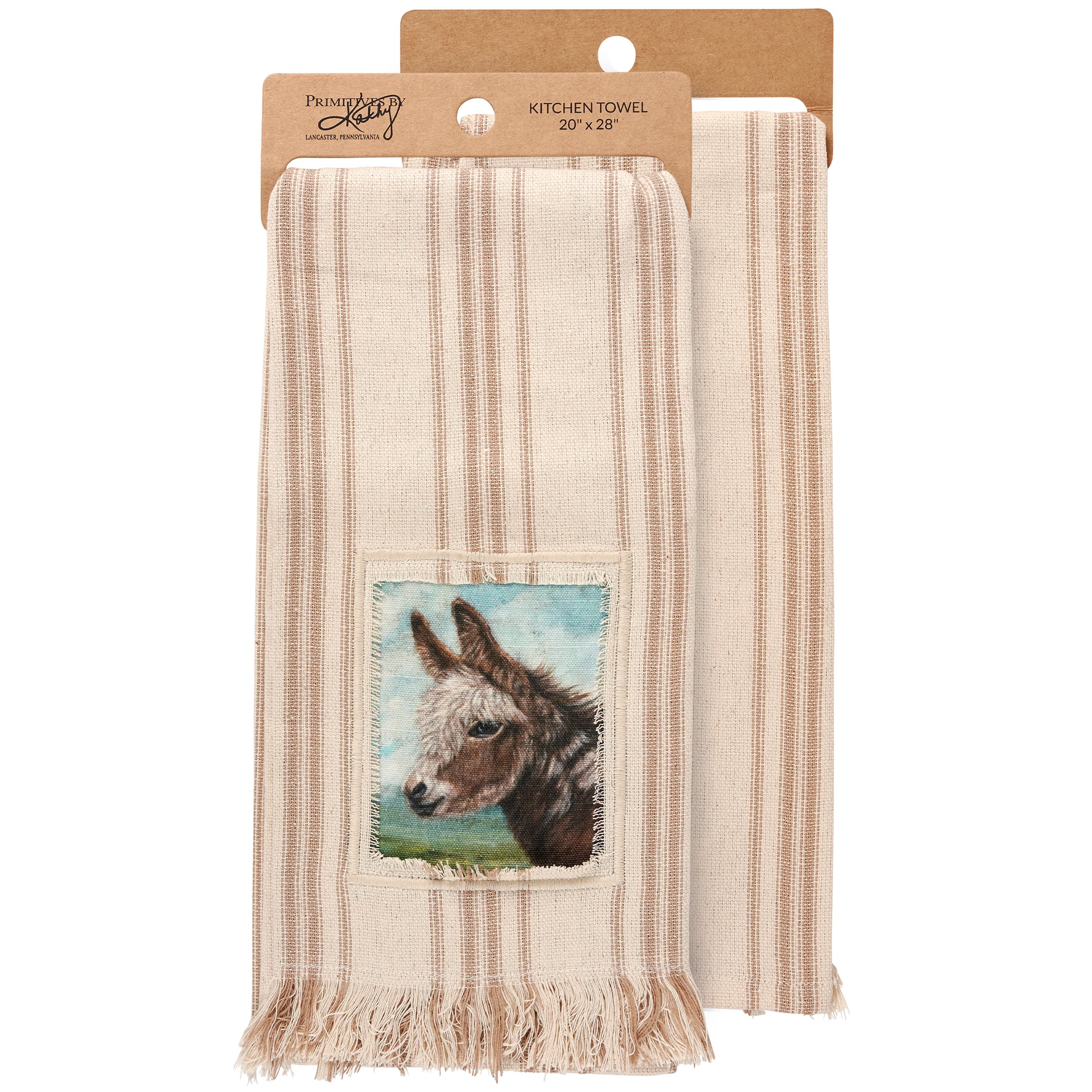 A cream cotton kitchen towel from our Farmhouse Collection featuring a stitched art panel with frayed border and woven brown stripes throughout. Art panel displays a donkey in a field replicated from original artwork painted onto burlap canvas, giving the art a unique depth and texture. Our Donkey kitchen towel is conveniently machine-washable for easy cleaning. Farm towel is packaged on a cardboard hanger with hole to easily display on rack. A rustic farm-themed kitchen accessory perfect for everyday use.