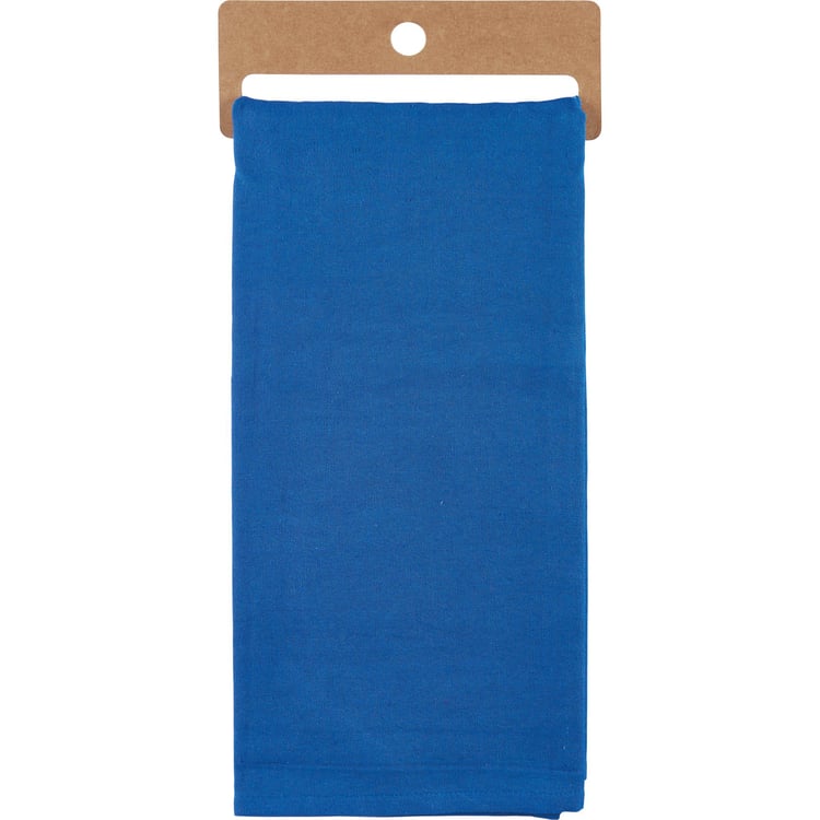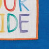 A blue cotton kitchen towel from our Pride Collection featuring a large stitched art panel displaying a "Don't Hide Your Pride" sentiment in a watercolor rainbow style with coordinating orange embroidery. Our Don't Hide Your Pride kitchen towel is machine-washable for convenient cleaning. Packaged on a cardboard hanger with hole to easily hang on rack. A portion of the proceeds from the sale of this Benefit Item will be donated to Lancaster LGBTQ+ Coalition to support their commitment to building a more inclusive Lancaster County abundant in opportunities for LGBTQQIA+ individuals.