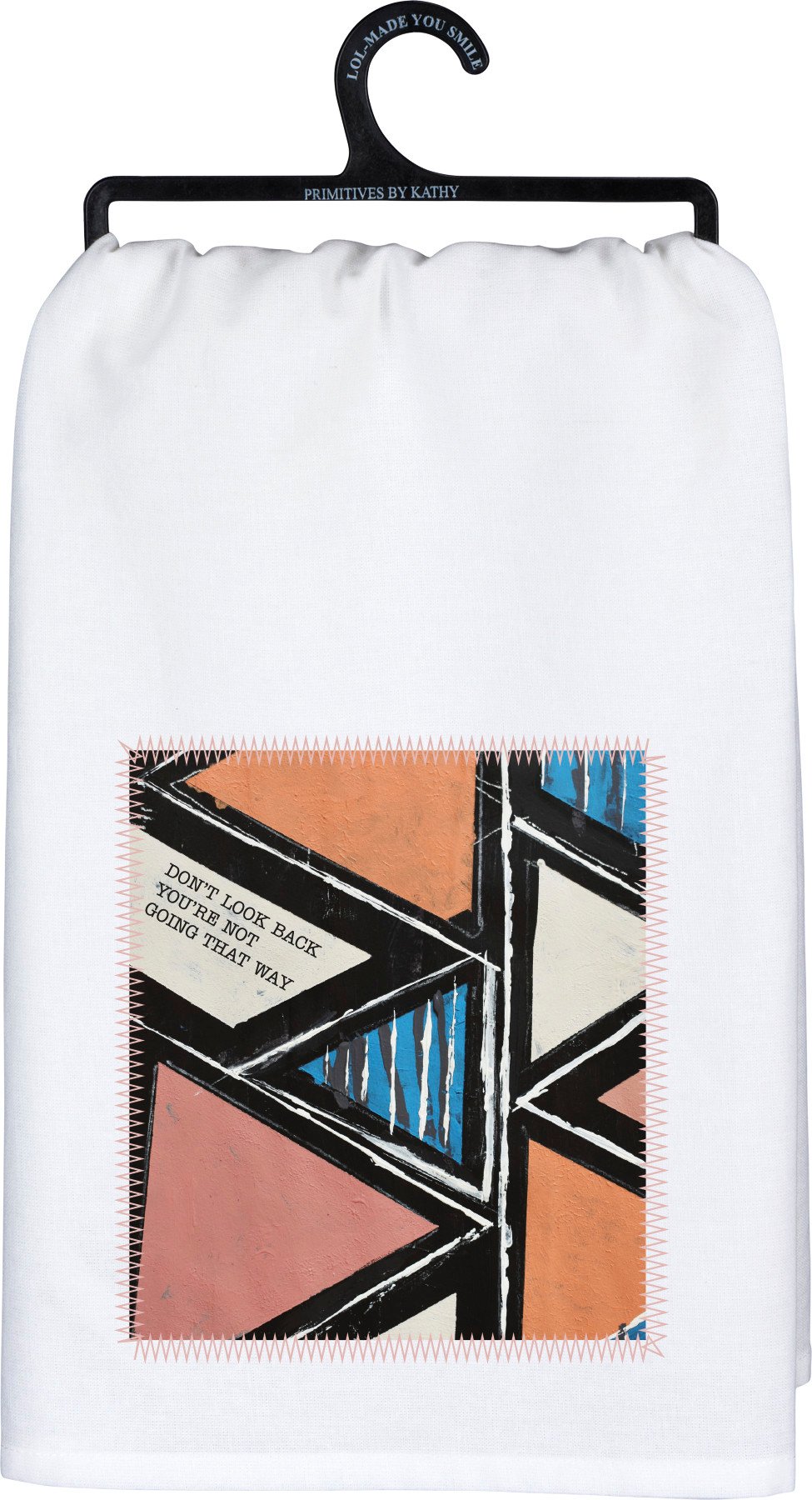 A 1980s Memphis-inspired cotton kitchen towel created at the Friendship Heart Gallery in downtown Lancaster, PA featuring a panel stitched accent and subtle "Don't Look Back - You're Not Going That Way" sentiment with geometric designs in a blush and blue palette. Complements well with other Memphis style collection pieces. Machine-washable.About the Artist: Michelle loves learning new ideas for creating, and uses a variety of techniques in her realist and abstract artwork. Always interested in the well-being and happiness of others, she enjoys sharing with her fellow artists and offering words of encouragement. A portion of the proceeds from this sale will be donated back to the gallery to support their mission to promote local artists with intellectual disabilities and autism.