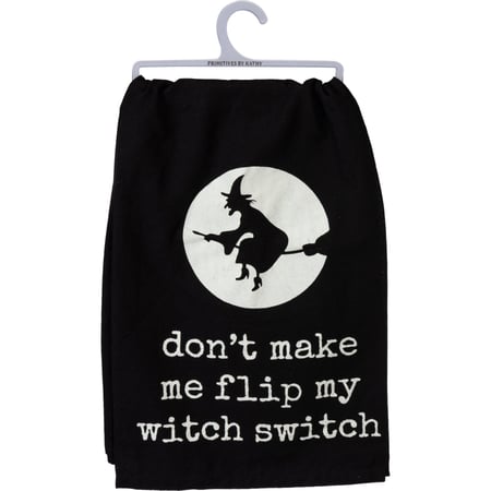 A cotton kitchen towel featuring a "Don't Make Me Flip My Witch Switch" sentiment, and witch and broom design. Machine-washable.