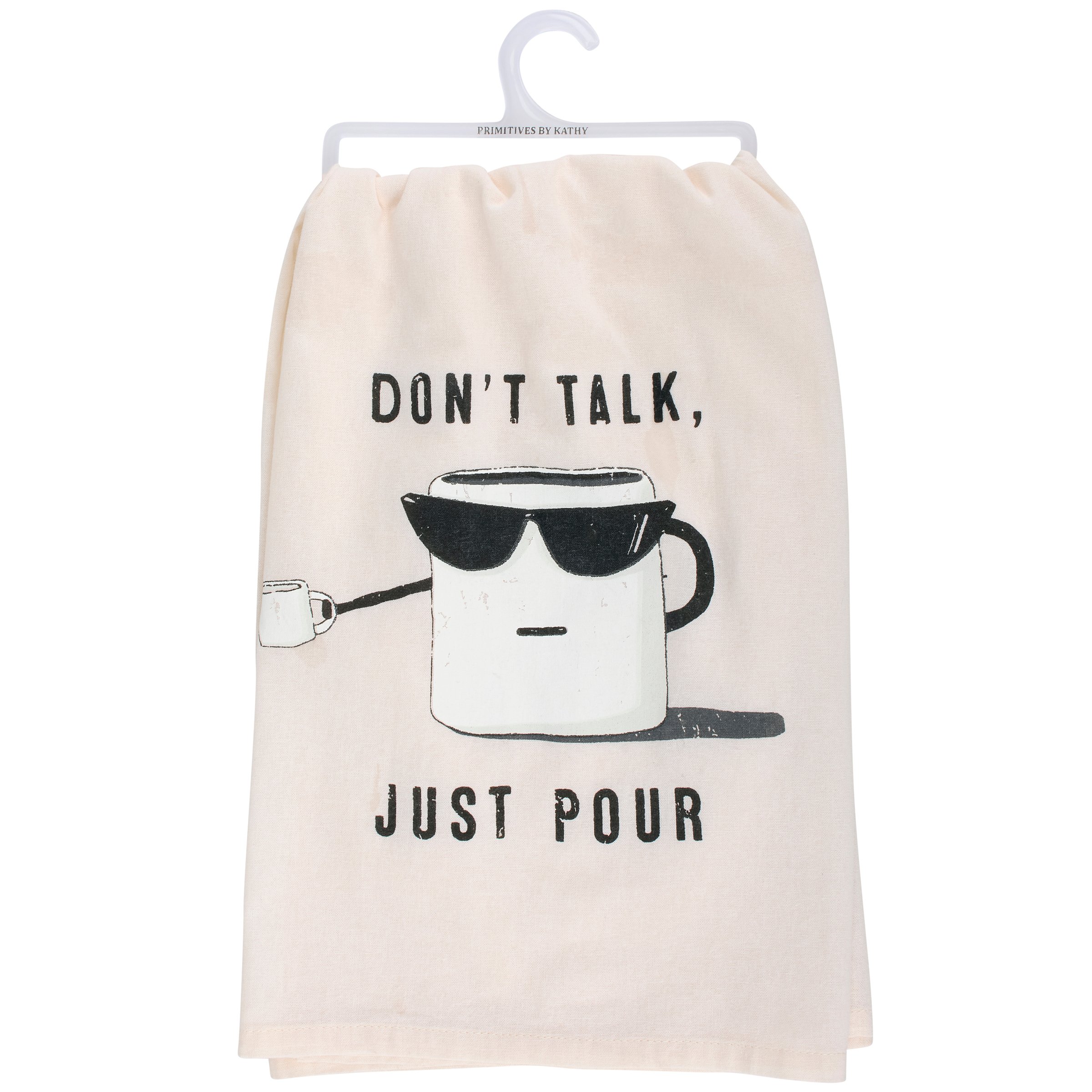 A cotton kitchen towel from our Primitive Collection displaying a rustic design of a coffee cup character wearing sunglasses with a sassy coffee themed sentiment that reads "Don't Talk, Just Pour." Our Don't Talk Just Pour kitchen towel is conveniently machine-washable for easy cleaning. Coffee kitchen towel is packaged on a clear plastic hanger to easily display on rack. A fun coffee themed gift perfect for adding personality to any kitchen.