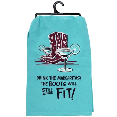 A turquoise cotton kitchen towel from our Western Collection displaying a playful hand illustrated design of cowgirl boots and margaritas with a fun western inspired sentiment that reads "Drink The Margaritas! The Boots Will Still Fit!" Our Drink The Margaritas kitchen towel is conveniently machine-washable for easy cleaning. This western kitchen towel is packaged on a black plastic hanger to easily display on rack. A fun western themed gift perfect for adding personality to any kitchen.