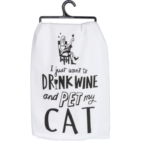 A black and white cotton kitchen towel displaying a fun hand illustrated design of a cat in the lap of someone drinking wine with a cat inspired sentiment that reads "I Just Want To Drink Wine And Pet My Cat." Our Drink Wine And Pet My Cat kitchen towel is conveniently machine-washable for easy cleaning. Funny kitchen towel is packaged on a black plastic hanger to easily display on rack. A fun pet-themed gift perfect for an everyday kitchen accessory.