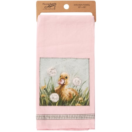 A pink cotton kitchen towel from our Easter & Spring Collection featuring a stitched art panel and gray gingham ribbon. Art panel displays a hand painted design of a duckling with spring flowers. Design is replicated from original artwork painted onto burlap canvas, giving the art a unique depth and texture. Our Duckling kitchen towel is machine-washable for convenient cleaning. Packaged on a cardboard hanger with hole to easily hang on rack. A charming spring-themed kitchen accessory perfect for seasonal use.