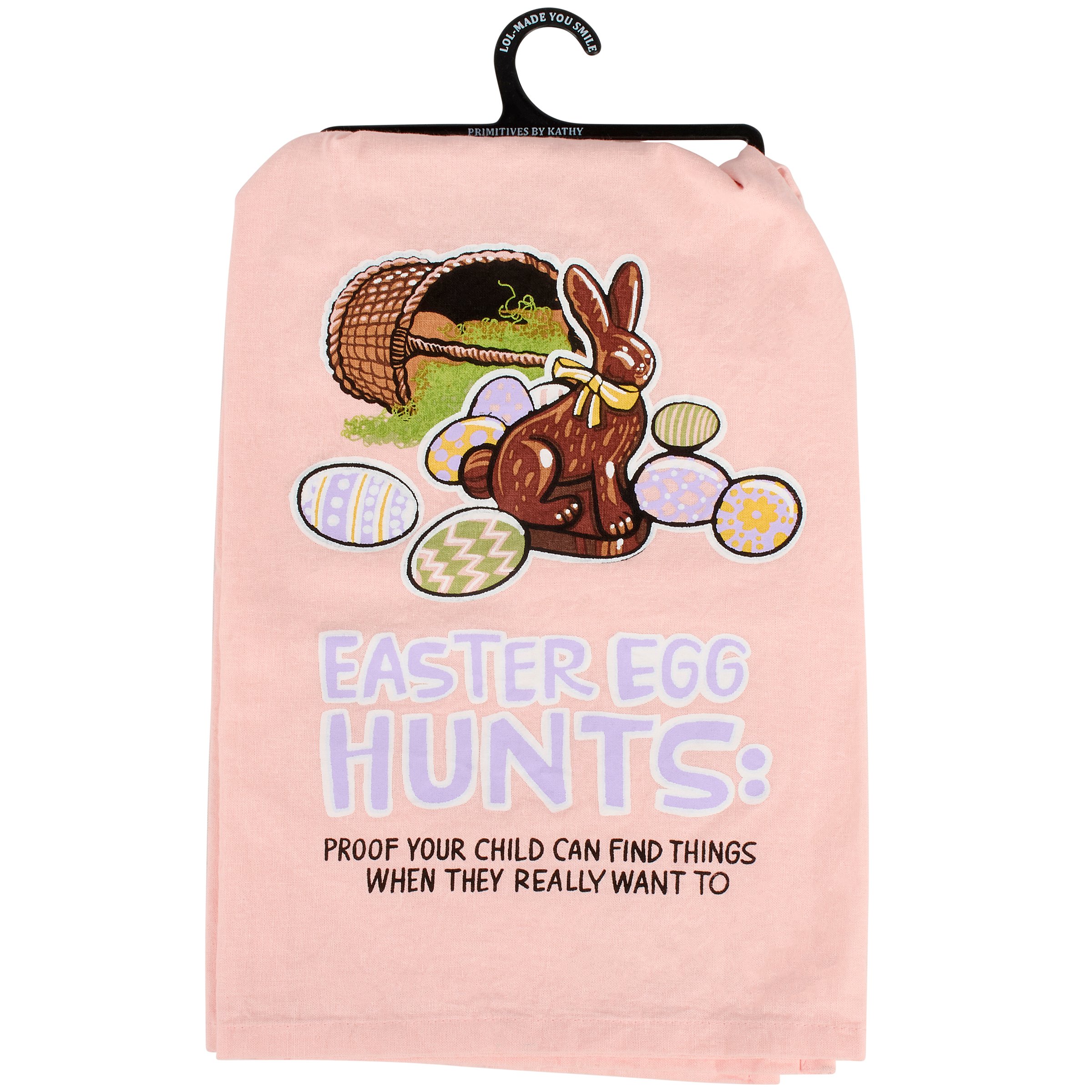 A pink cotton kitchen towel from our Easter & Spring Collection displaying a playful hand illustrated design of a tipped over Easter basket with Easter eggs and chocolate bunny above a funny Easter sentiment that reads "Easter Egg Hunts: Proof Your Child Can Find Things When They Really Want To." Our Easter Egg Hunts kitchen towel is conveniently machine-washable for easy cleaning. Easter kitchen towel is packaged on a black plastic hanger to easily display on rack. A fun Easter kitchen accessory perfect for adding seasonal style to any kitchen.