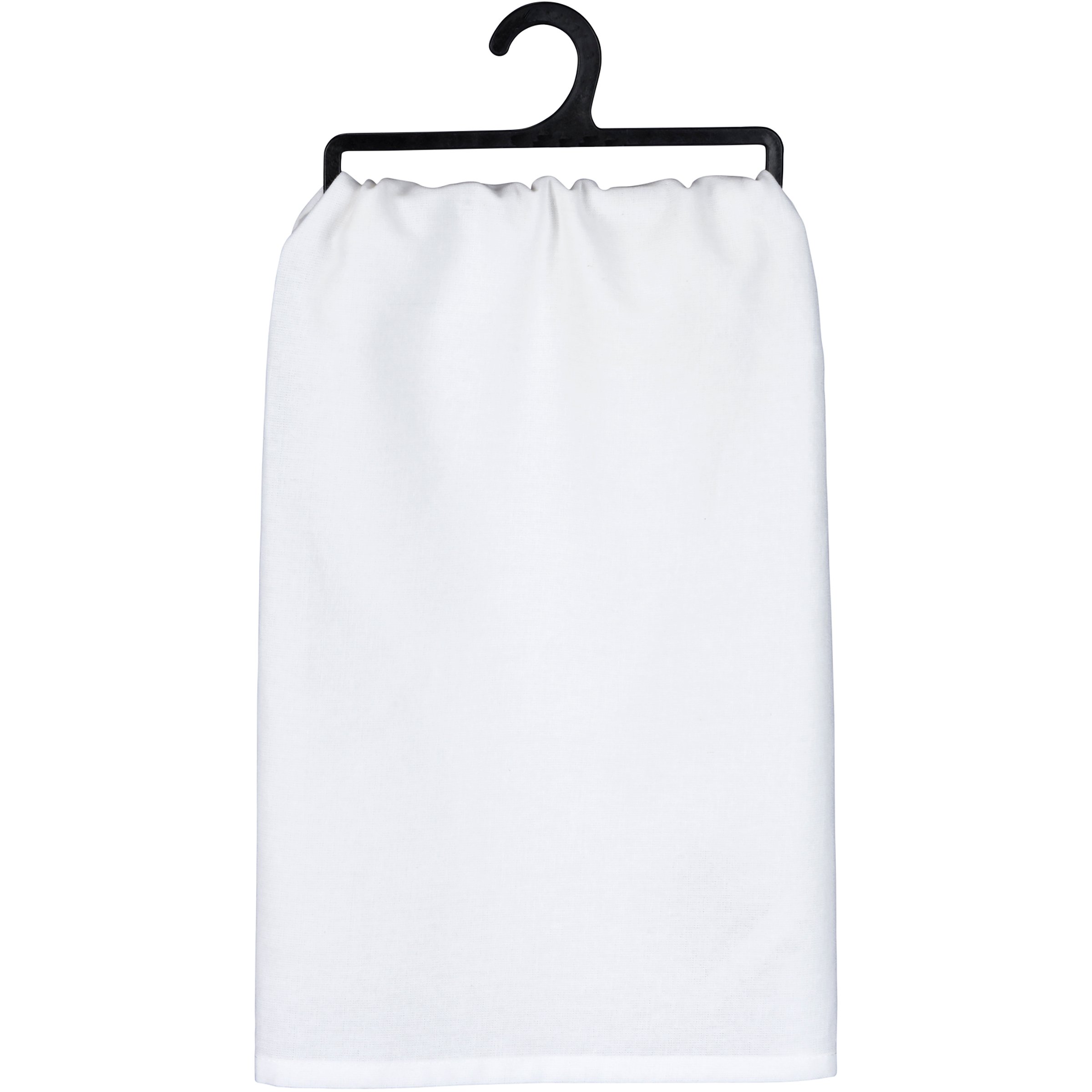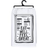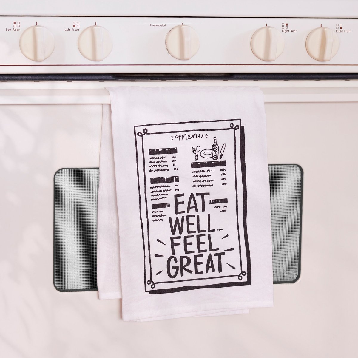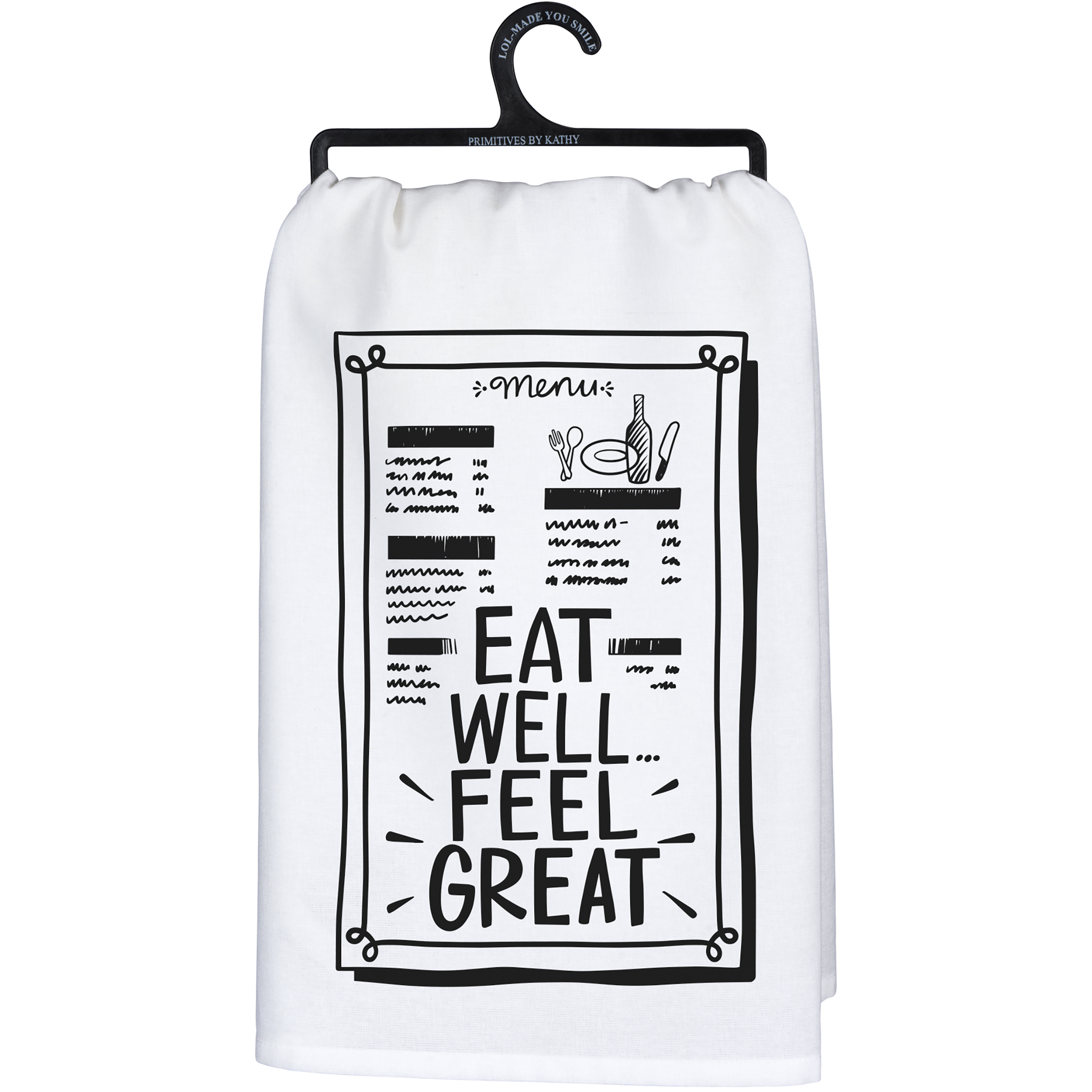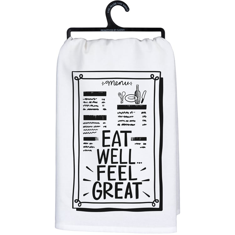 A black and white cotton kitchen towel from our Foodie Collection displaying a unique hand illustrated design of a restaurant menu with a food-themed sentiment that reads "Eat Well... Feel Great." Our Eat Well kitchen towel is machine-washable for convenient cleaning. Packaged on a black plastic hanger to easily display on rack. A fun food-themed kitchen accent perfect for everyday use.