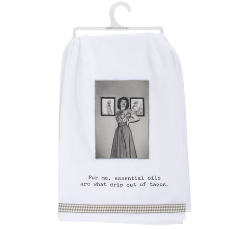 A white cotton kitchen towel from our Trash Talk By Annie Collection displaying a vintage black and white photograph on a stitched art panel complemented with a sassy food themed sentiment that reads "For Me, Essential Oils Are What Drip Out Of Tacos." This funny kitchen towel also features a grey gingham ribbon along the bottom. Our Essential Oils kitchen towel is conveniently machine-washable for easy cleaning. Vintage kitchen towel is packaged on a clear plastic hanger to easily display on rack. A fun kitchen accessory great for everyday gifting.