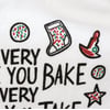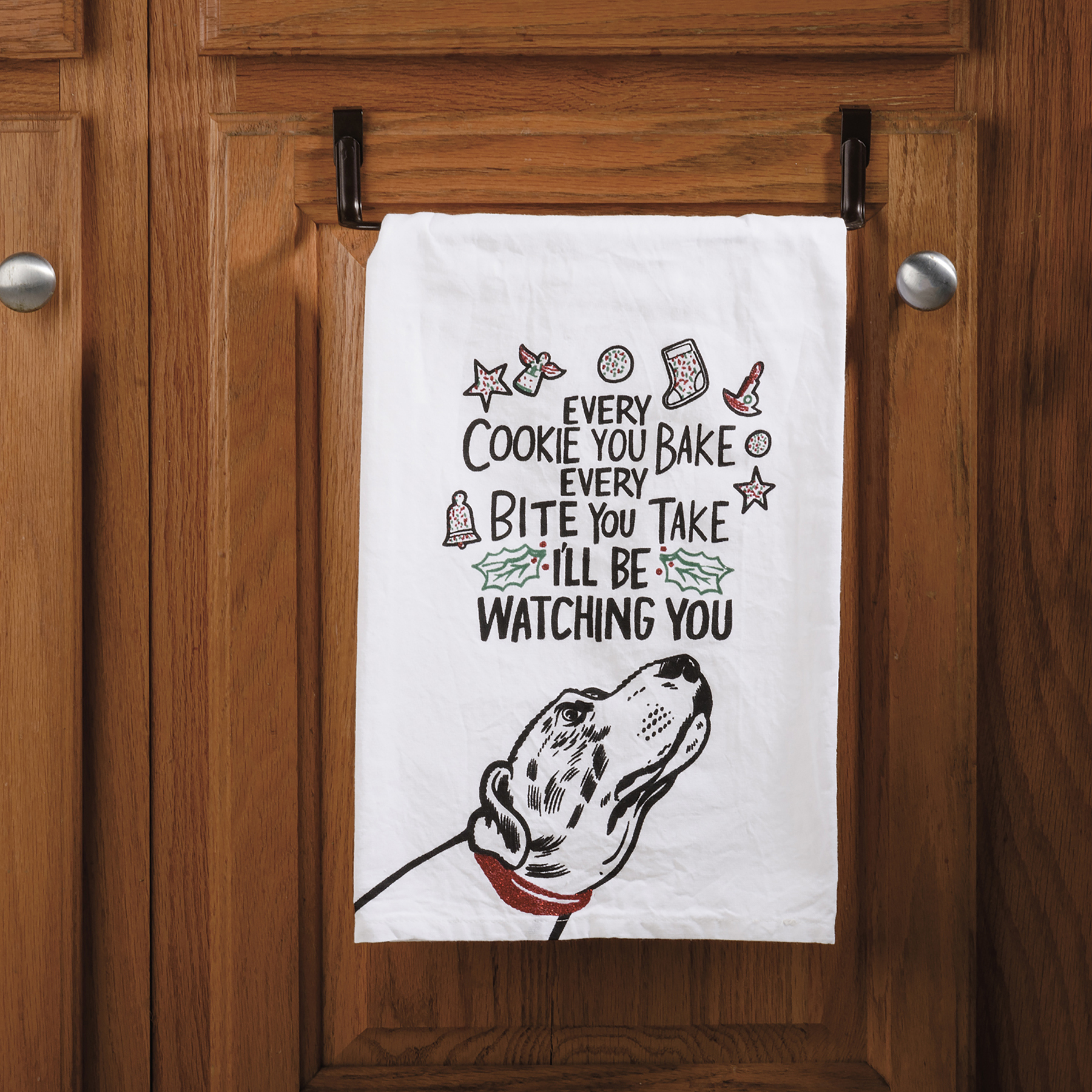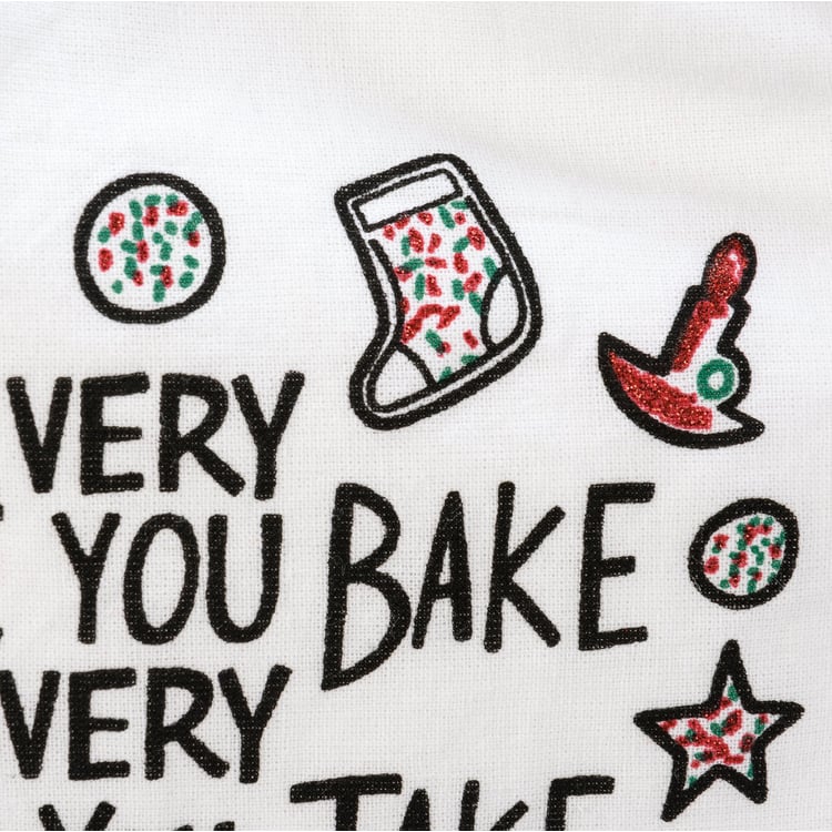 A black and white cotton kitchen towel featuring "Every Cookie You Bake Every Bite You Take I'll Be Watching You" sentiment and festive dog and cookie designs. Machine-washable.