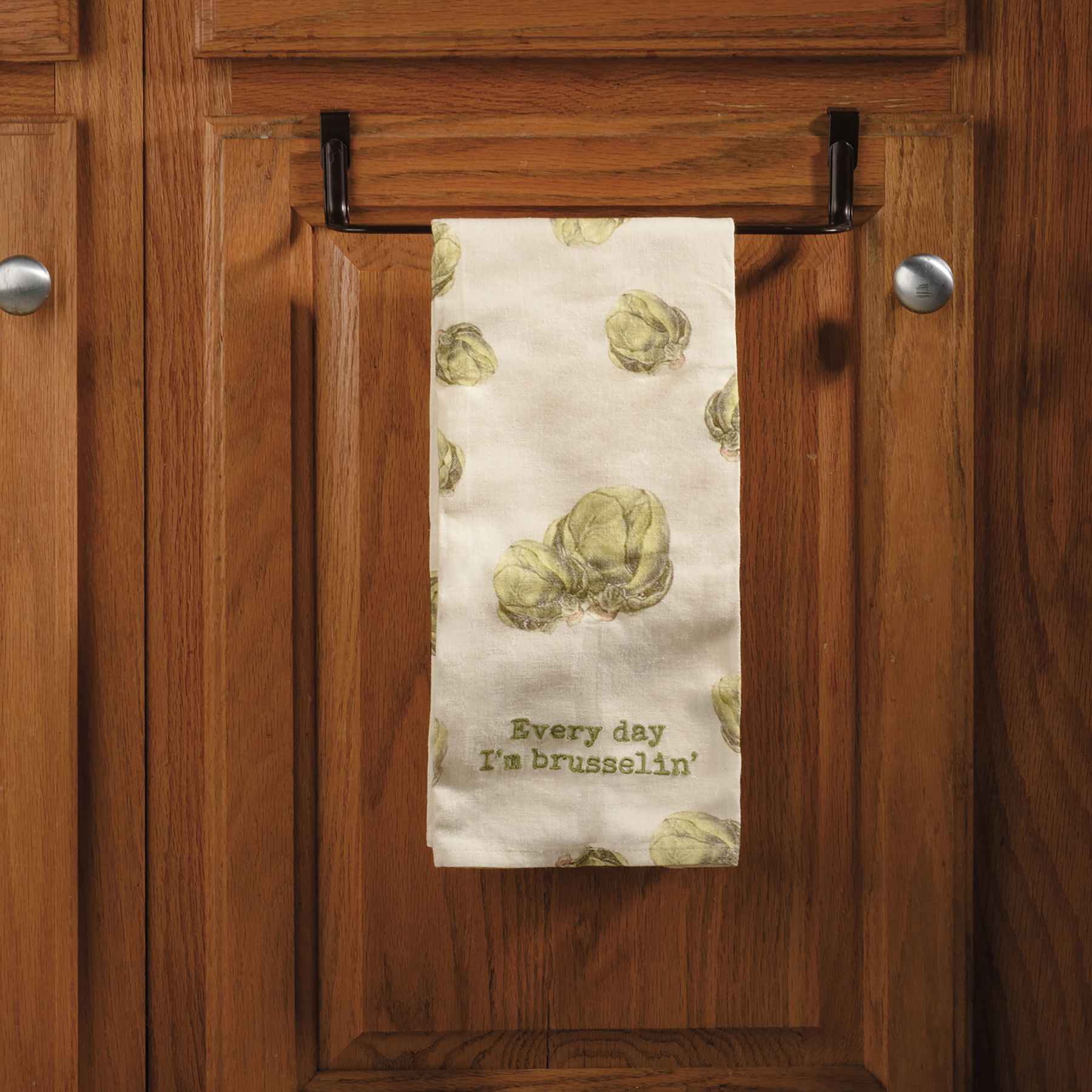 A cotton linen blend kitchen towel featuring all-over retro style Brussels sprouts designs and punny embroidered "Every Day I'm Brusselin'" sentiment. Features a cotton tape loop in the corner for easy hanging. Machine-washable. Towel is packaged on a cardboard hanger with a hole to easily hang on rack.