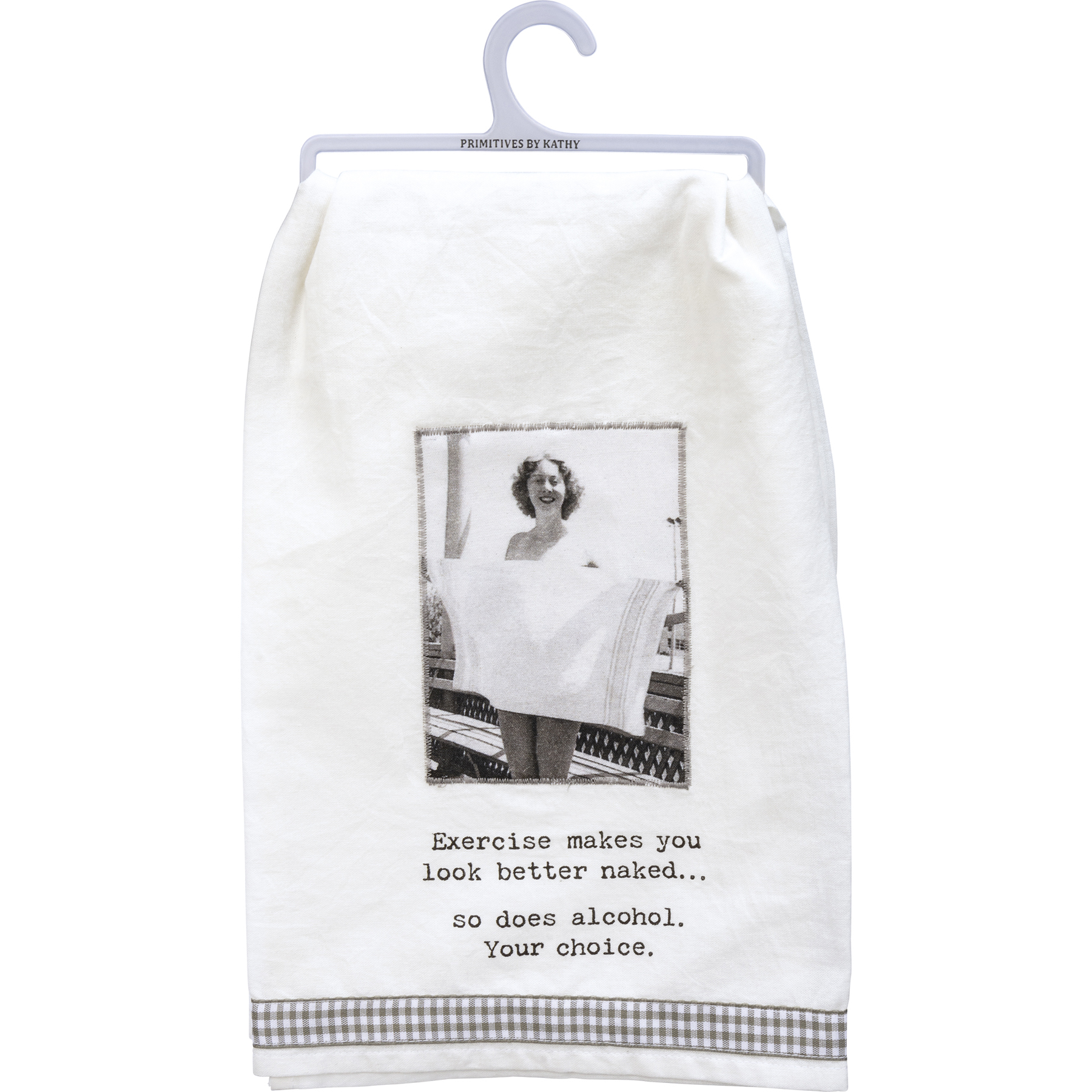 A cotton kitchen towel with a stitched art panel featuring an old fashioned black and white photo, "Exercise Makes You Look Better Naked…So Does Alcohol. Your Choice." sentiment, and gingham ribbon trim. Machine-washable.