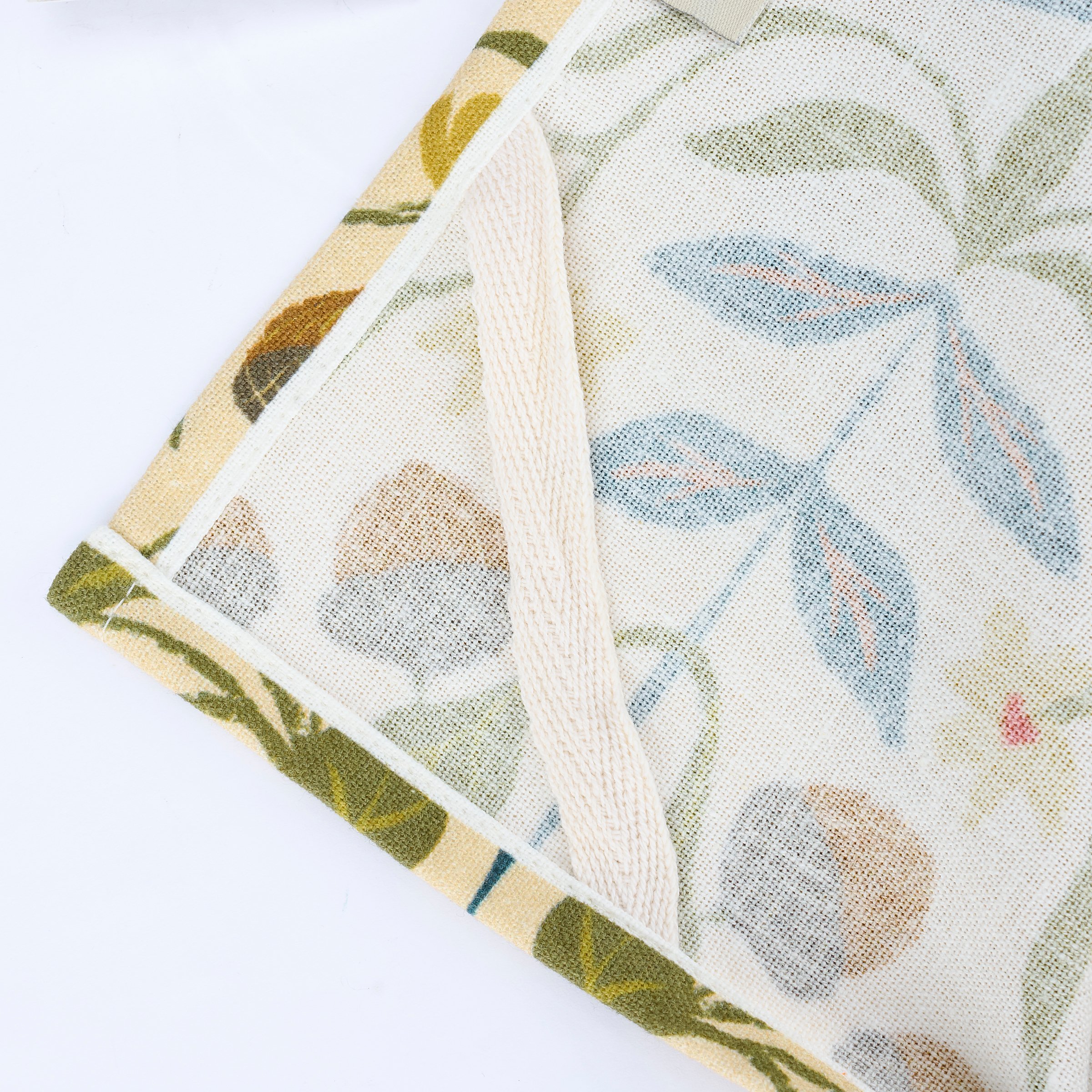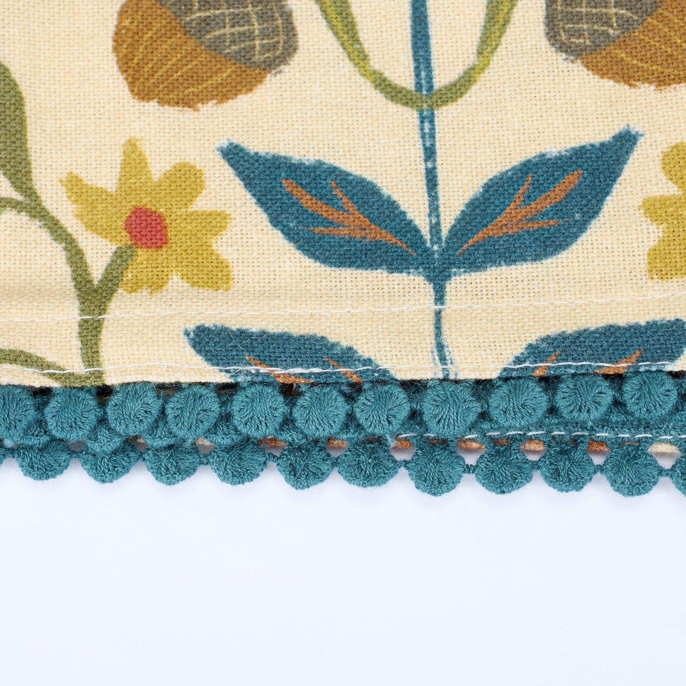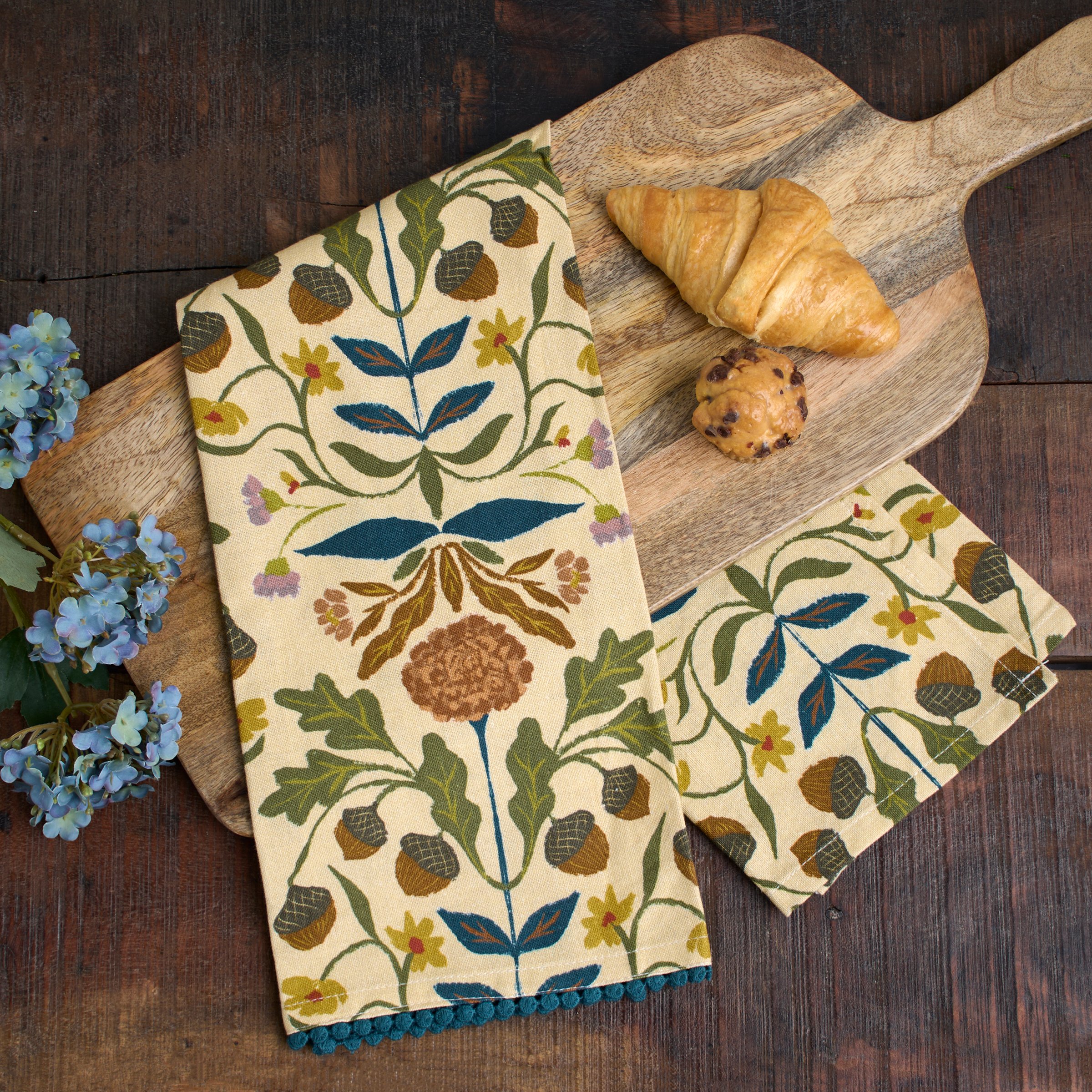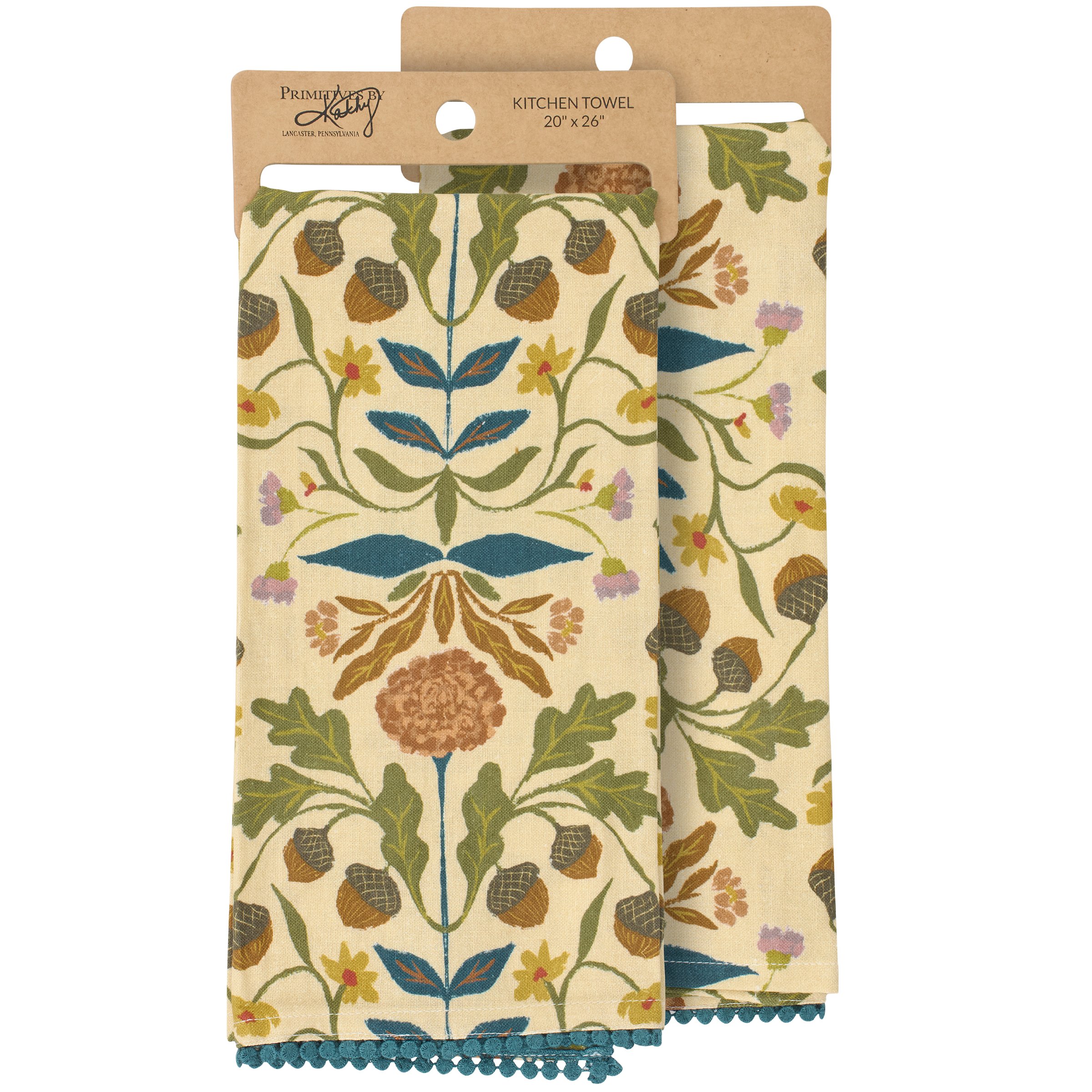 A cotton-linen blend kitchen towel from our Fall & Harvest Collection featuring an all-over design displaying folk art inspired fall florals with a blue pom trim at the bottom of the towel. Folk art florals design is replicated from original art hand painted in a unique watercolor style. Our Fall Folk Floral kitchen towel is conveniently machine washable for easy cleaning. Seasonal kitchen towel is packaged on a cardboard hanger with hole to easily hang on rack. A folk fall kitchen accessory perfect for adding seasonal style to any kitchen.
