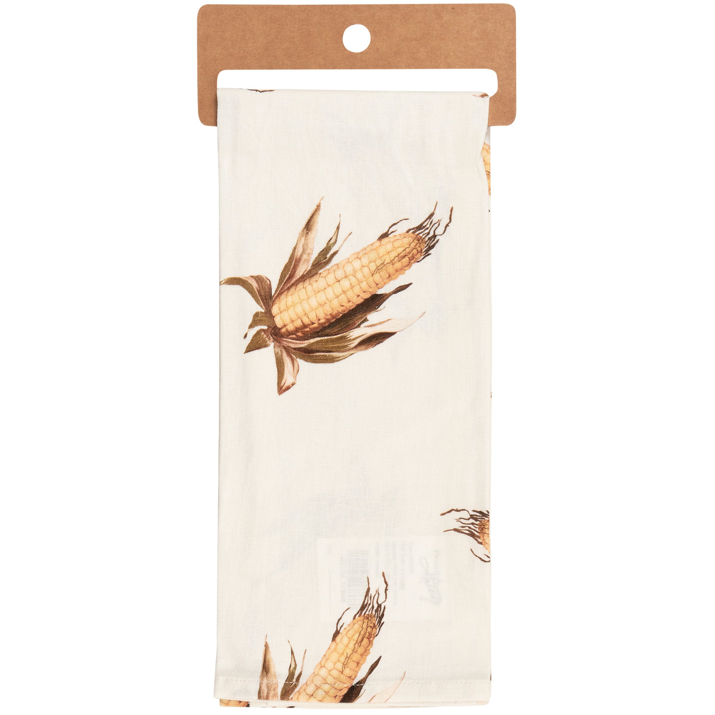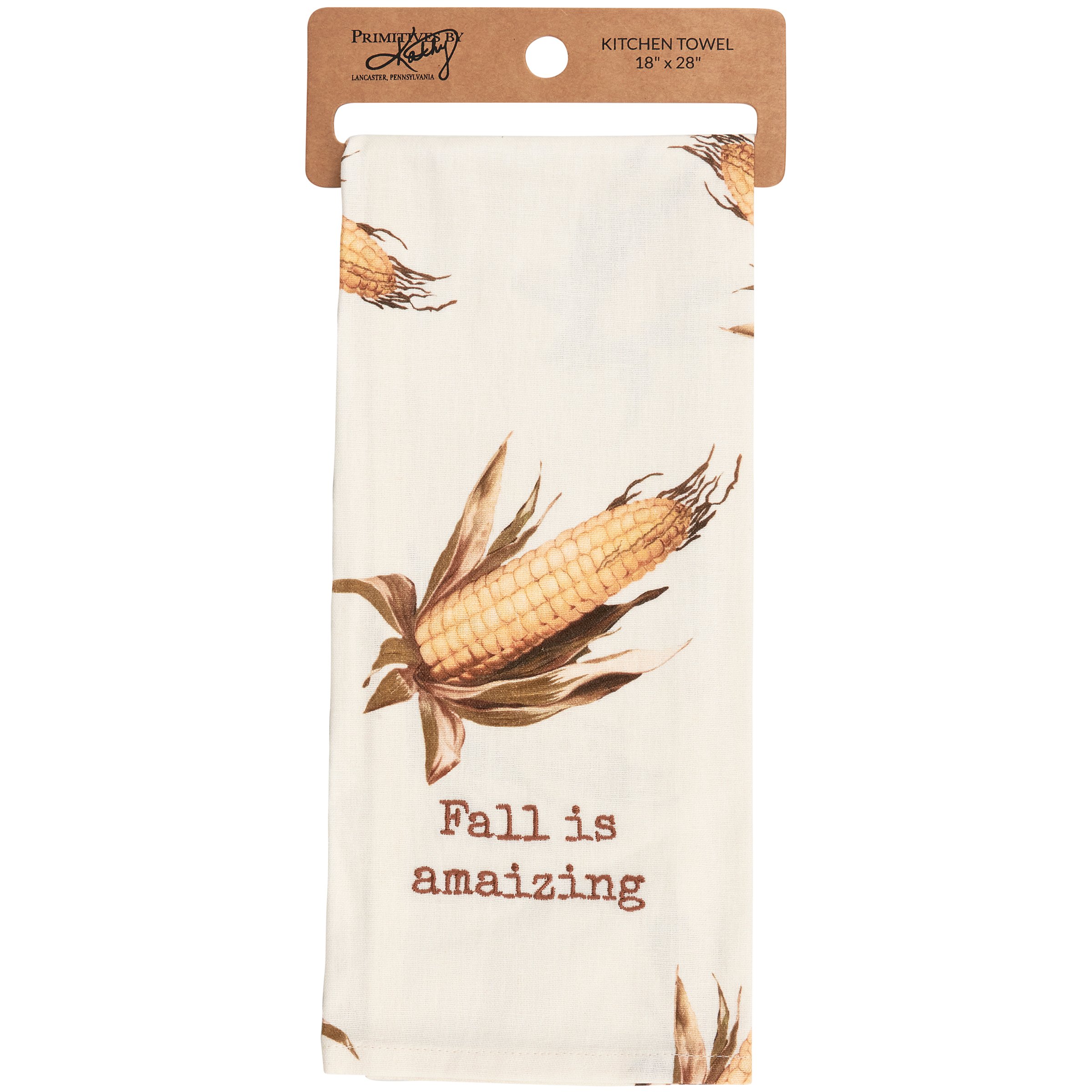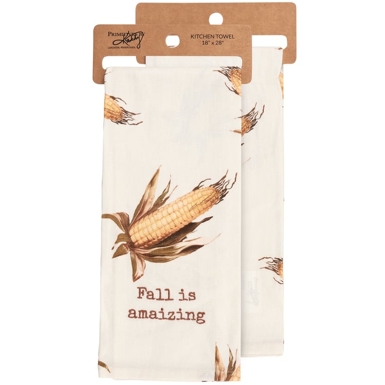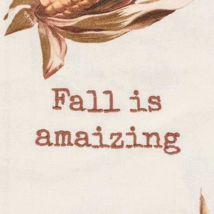 A cotton-linen kitchen towel from our Fall & Harvest Collection displaying all-over vintage designs of corn with a coordinating fall inspired pun that reads "Fall Is Amaizing." Sentiment is embroidered for added interest. Our Fall Is Amaizing kitchen towel is conveniently machine-washable for easy cleaning. Seasonal kitchen towel is packaged on a cardboard hanger with hole to easily display on rack. A fun fall-themed kitchen accessory perfect for seasonal use.