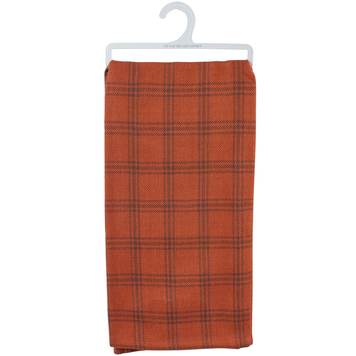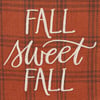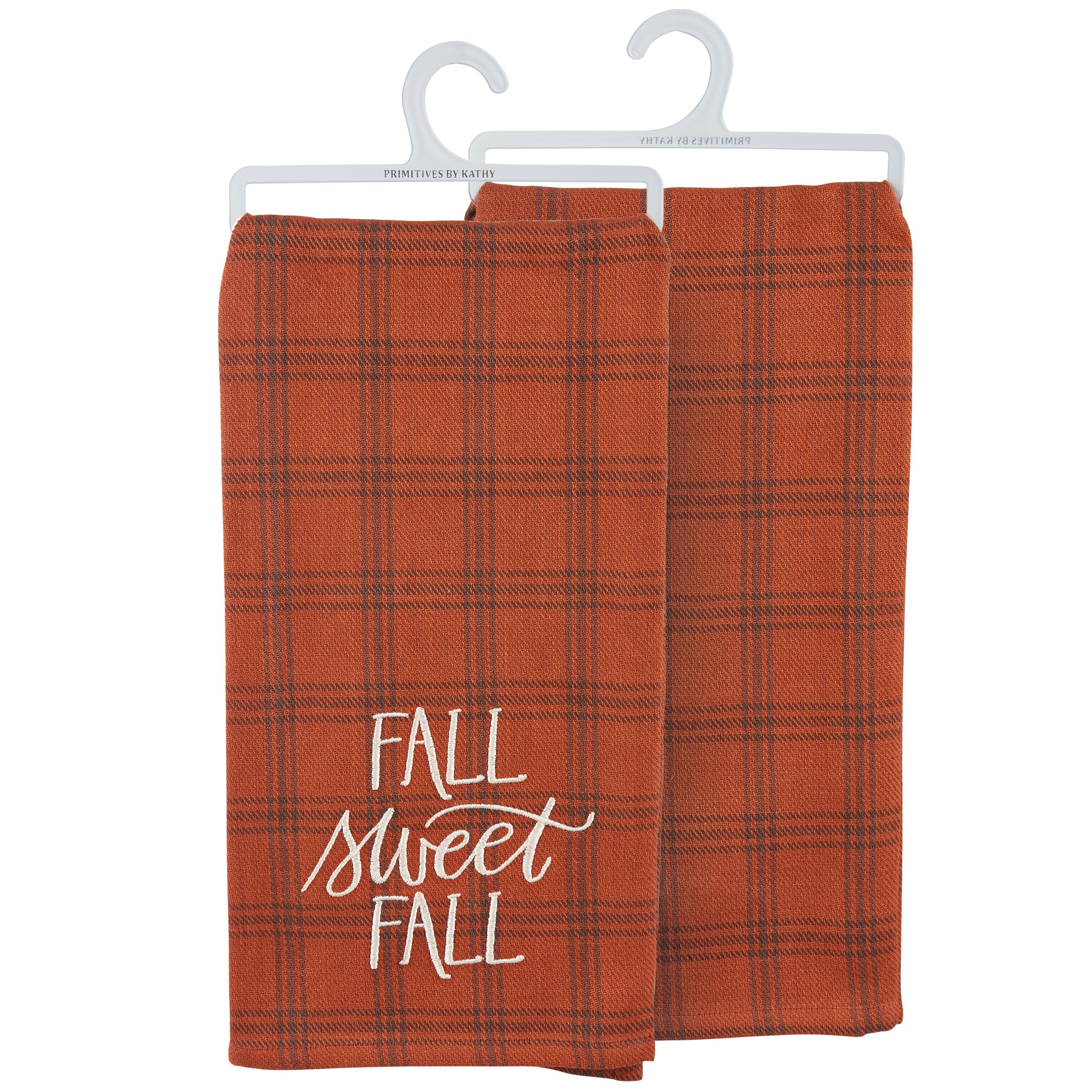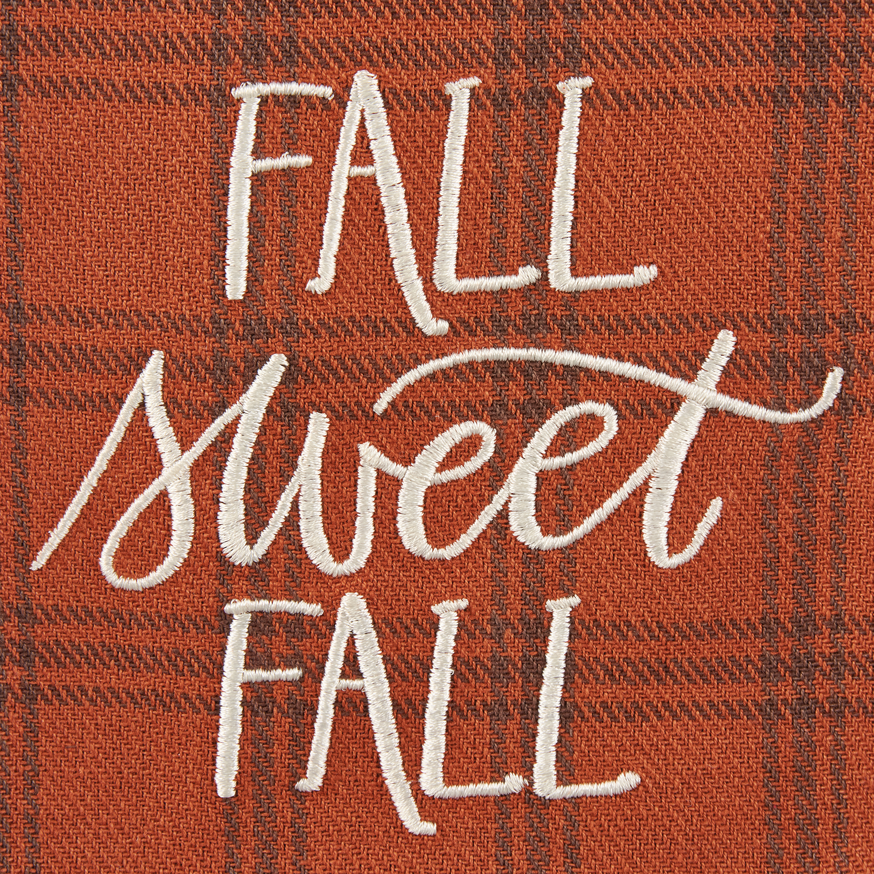 A plaid cotton kitchen towel from our Fall & Harvest Collection displaying an autumn color palette and embroidered "Fall Sweet Fall" sentiment in a hand illustrated style. Our Fall Sweet Fall kitchen towel is machine-washable for convenient cleaning. Packaged on a clear plastic hanger to easily display on rack. A rustic and functional seasonal kitchen accent.